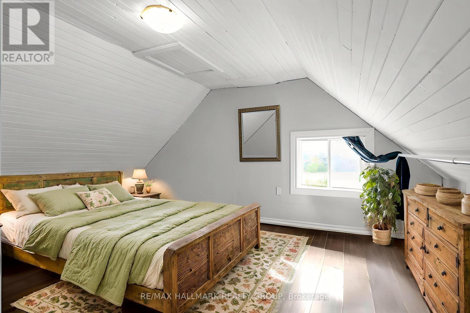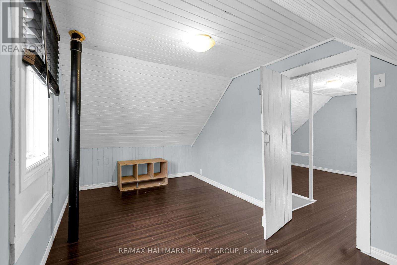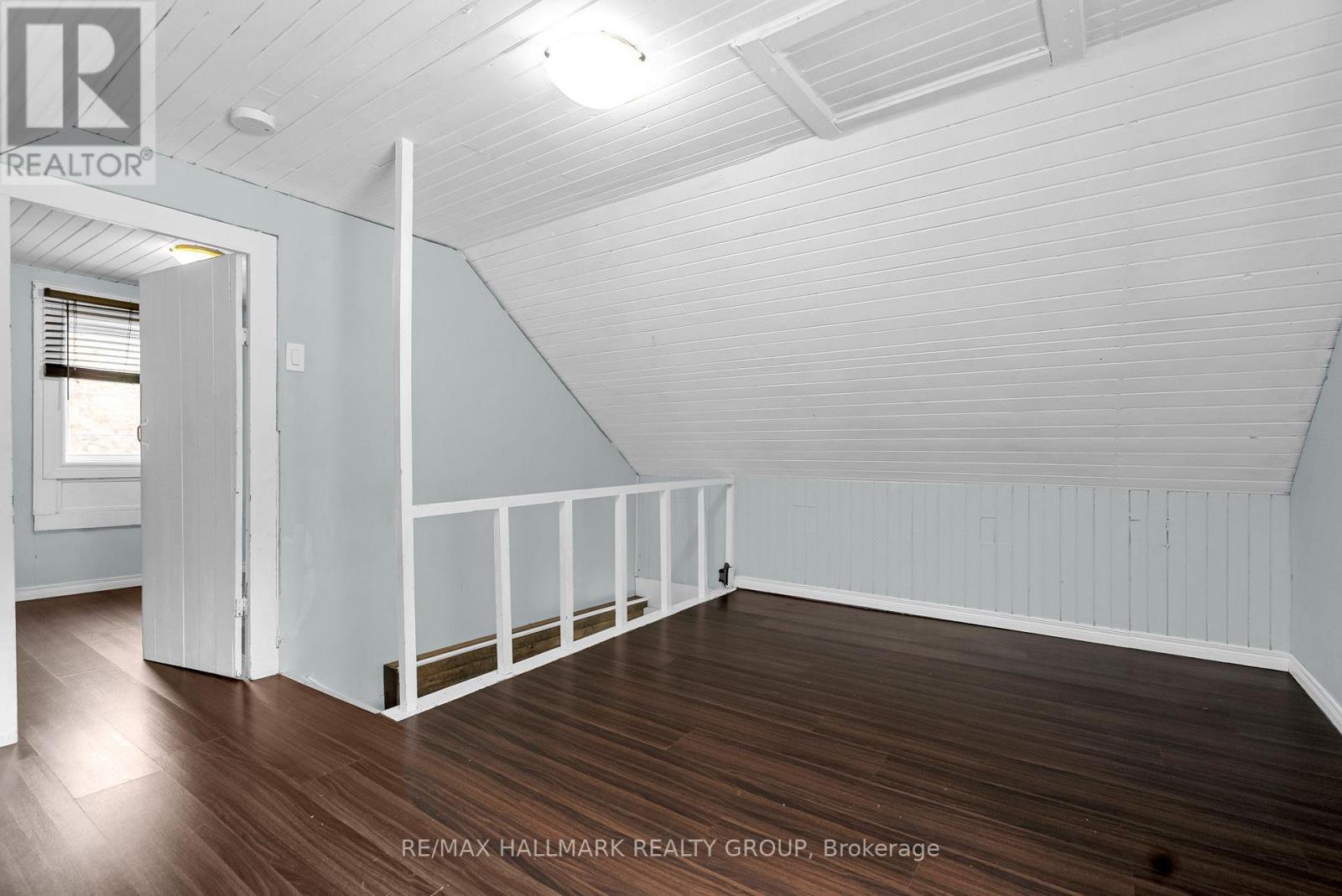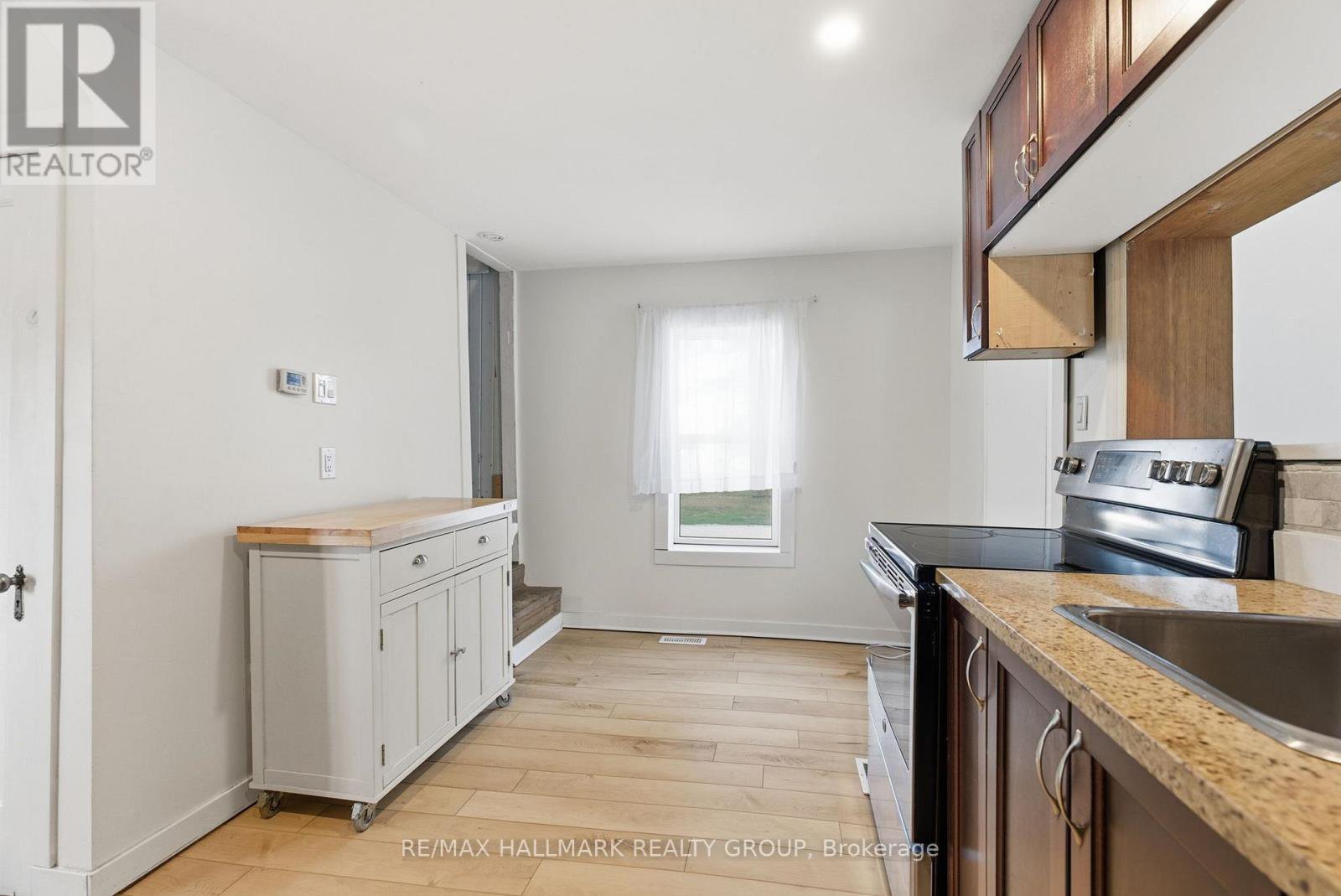 Charming farm style residence boasting a crisp white exterior with contrasting black roof in the quiet village of Mountain, North Dundas. Set on a sprawling 0.98-acre south-facing lot surrounded by nature, the grounds offer plenty of cleared space for gardening or recreation and the soaring trees provide a picturesque backdrop. Bonus detached garage is perfect for the hobbyist! Step inside and be greeted by your foyer and main floor laundry, followed by the eating area. The L- shaped kitchen features granite counters, ceramic backsplash, and plenty of cabinetry for storage. At the back of the home a spacious family room is a great space for entertainment and leads directly to your wood patio overlooking the backyard. Modern 4pc main bathroom with decorative panelled wall, tile floor, vanity with matte black hardware, and tub/shower with white tile surround. Upstairs is the primary bedroom and 2nd bedroom. Fresh cosmetic improvements in November 2025 include painting and wide plank laminate floors on the main level.