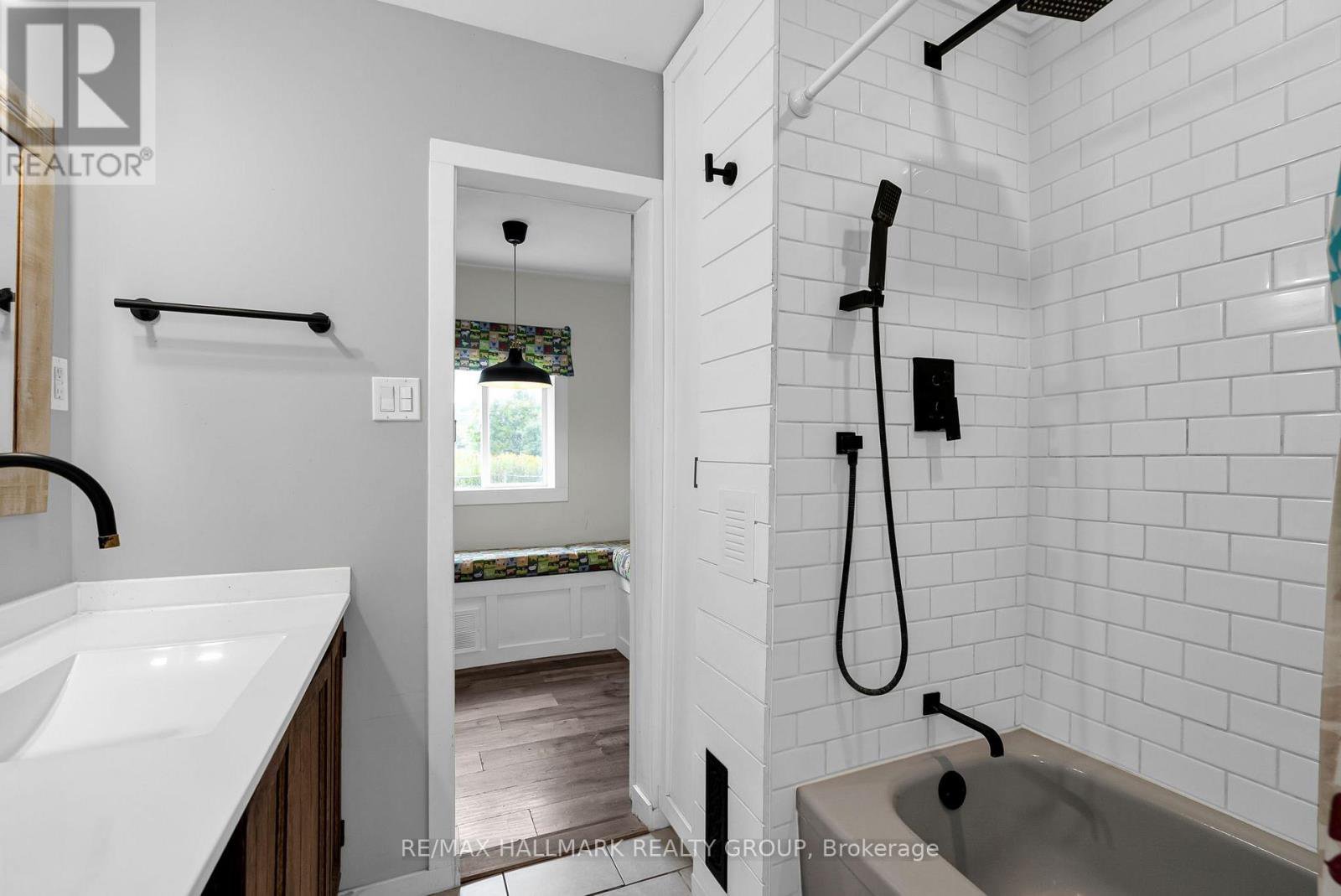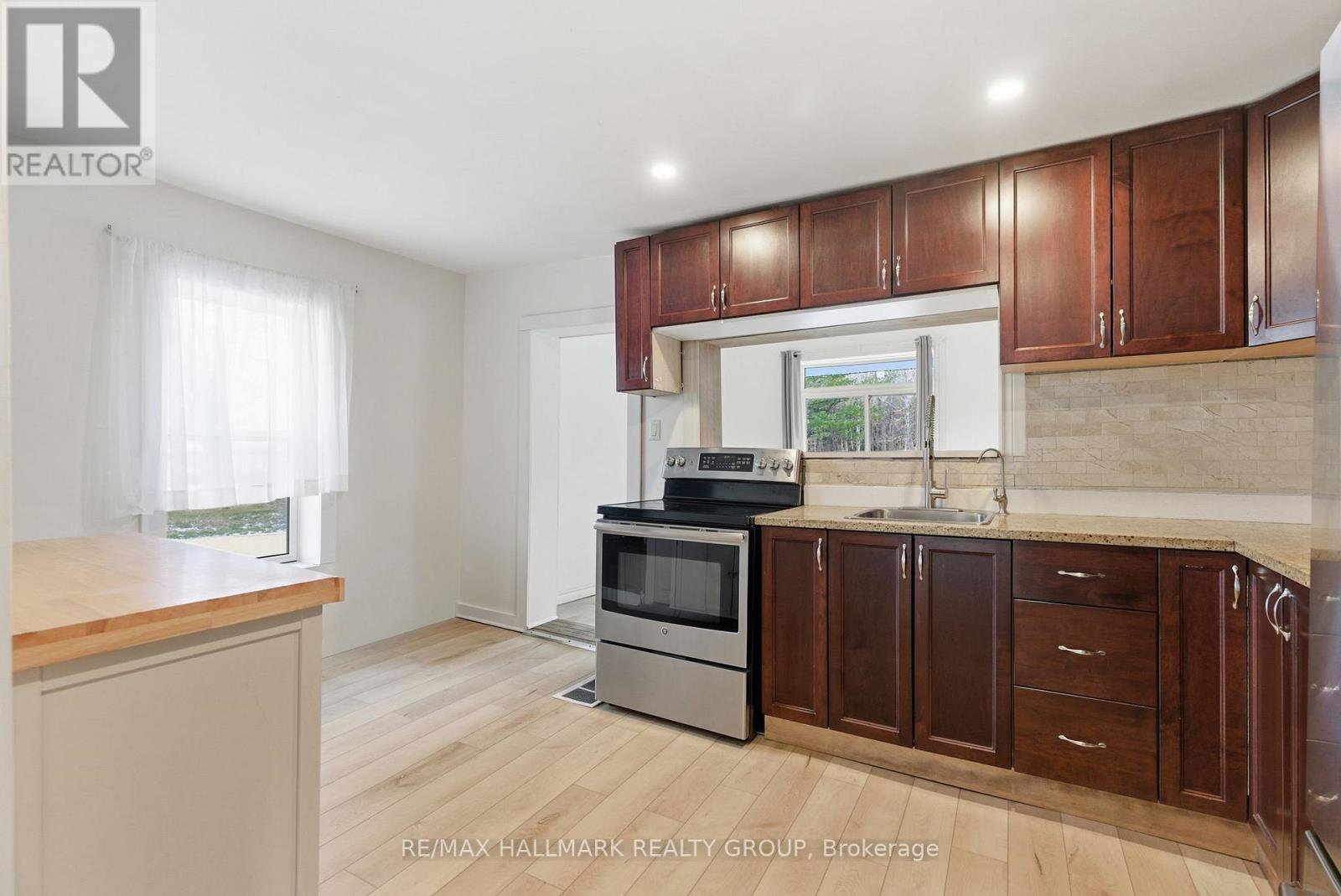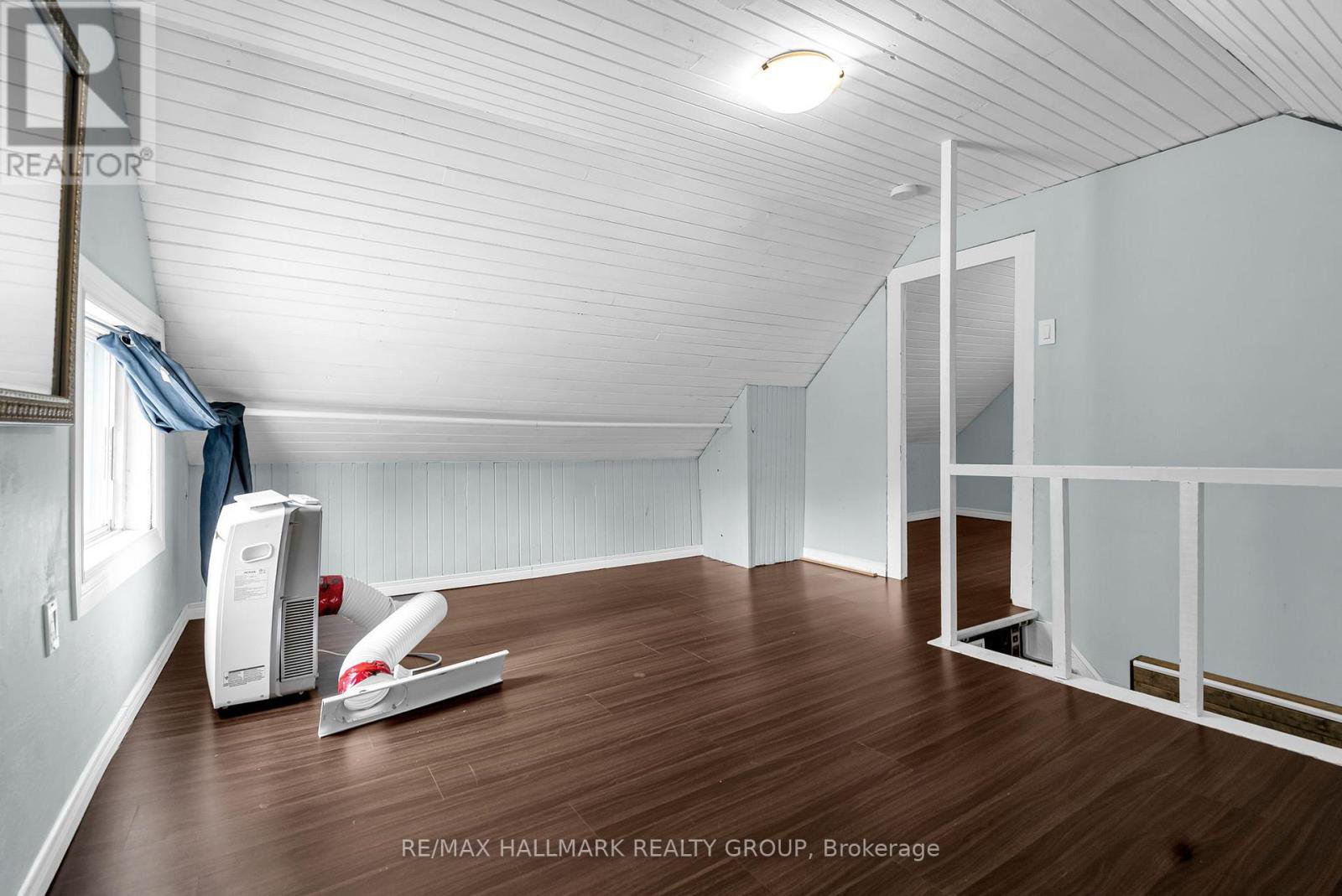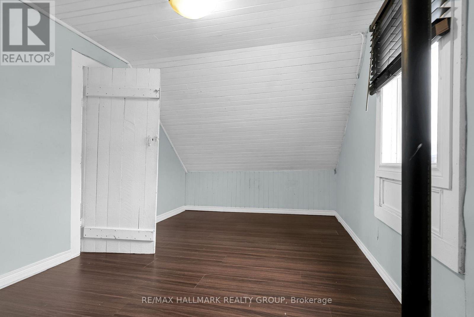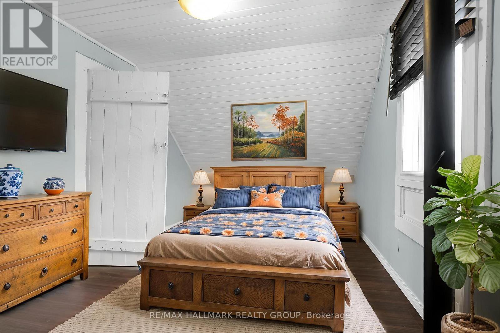 Charming farm style residence boasting a crisp white exterior with contrasting black roof in the quiet village of Mountain, North Dundas. Set on a sprawling 0.98-acre south-facing lot surrounded by nature, the grounds offer plenty of cleared space for gardening or recreation and the soaring trees provide a picturesque backdrop. Bonus detached garage is perfect for the hobbyist! Step inside and be greeted by your foyer and main floor laundry, followed by the eating area. The L- shaped kitchen features granite counters, ceramic backsplash, and plenty of cabinetry for storage. At the back of the home a spacious family room is a great space for entertainment and leads directly to your wood patio overlooking the backyard. Modern 4pc main bathroom with decorative panelled wall, tile floor, vanity with matte black hardware, and tub/shower with white tile surround. Upstairs is the primary bedroom and 2nd bedroom. Fresh cosmetic improvements in November 2025 include painting and wide plank laminate floors on the main level.