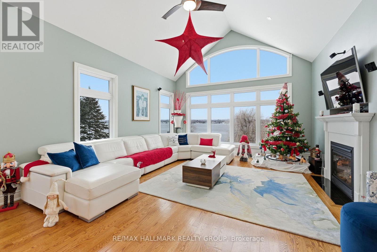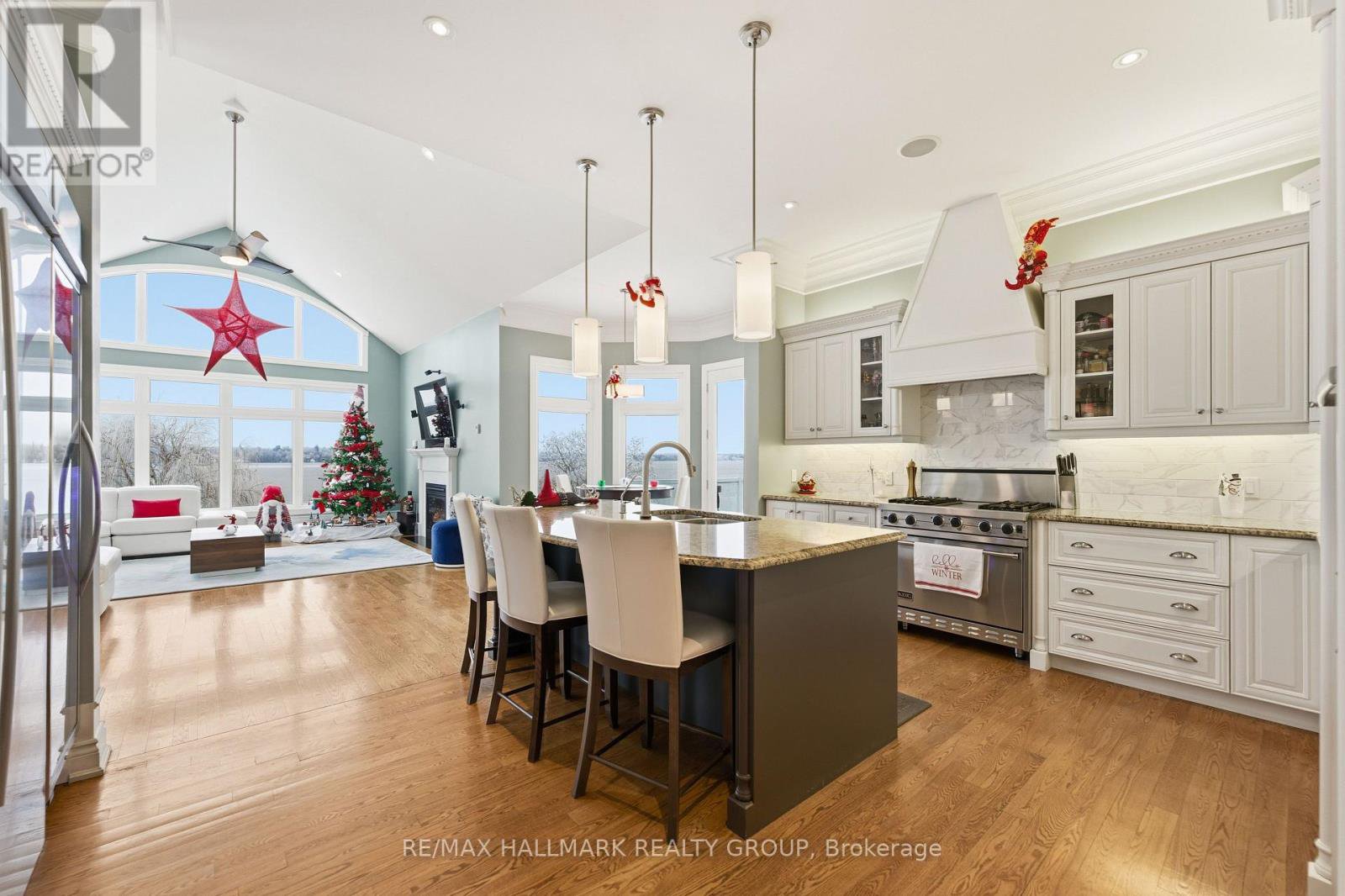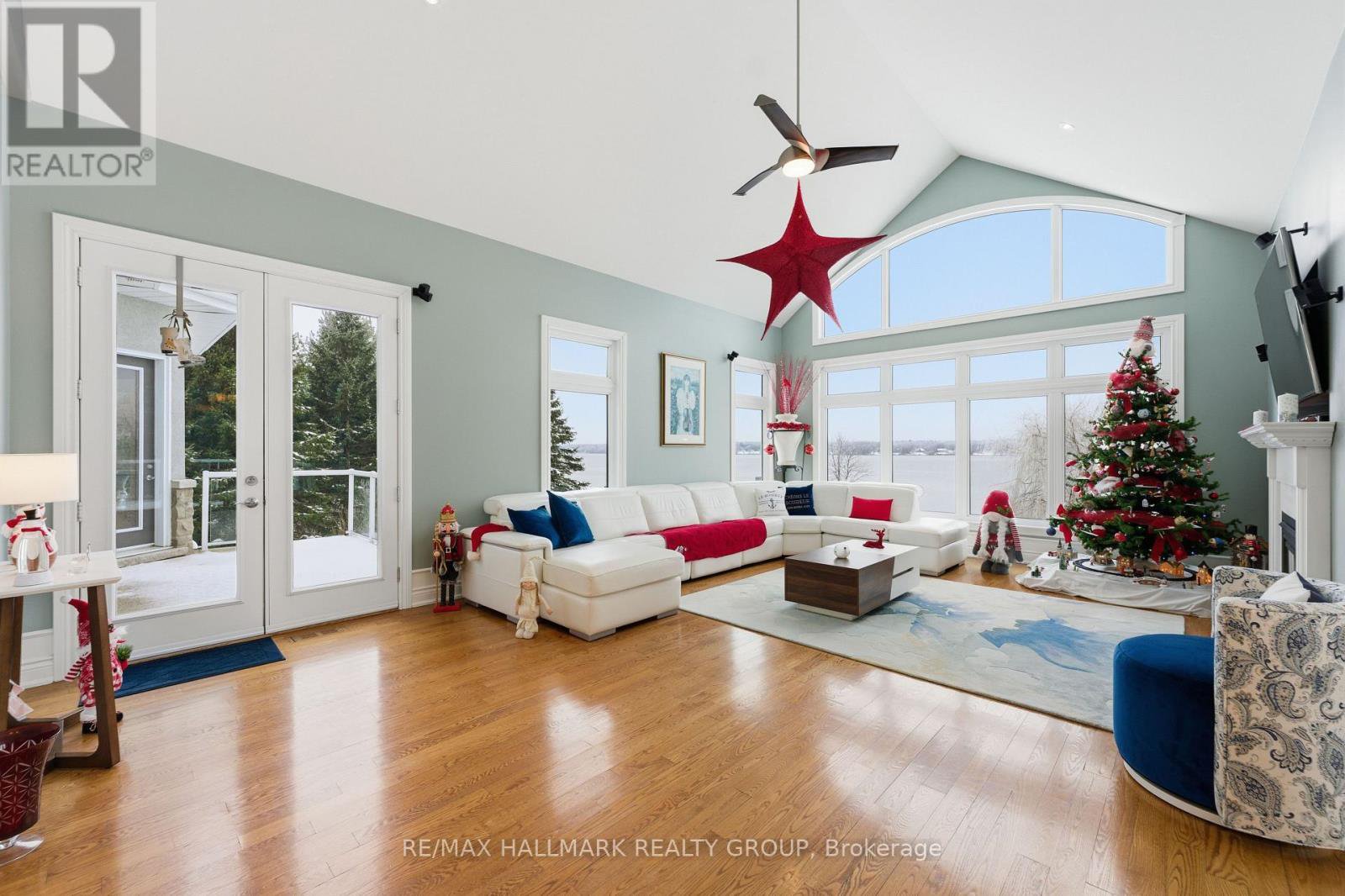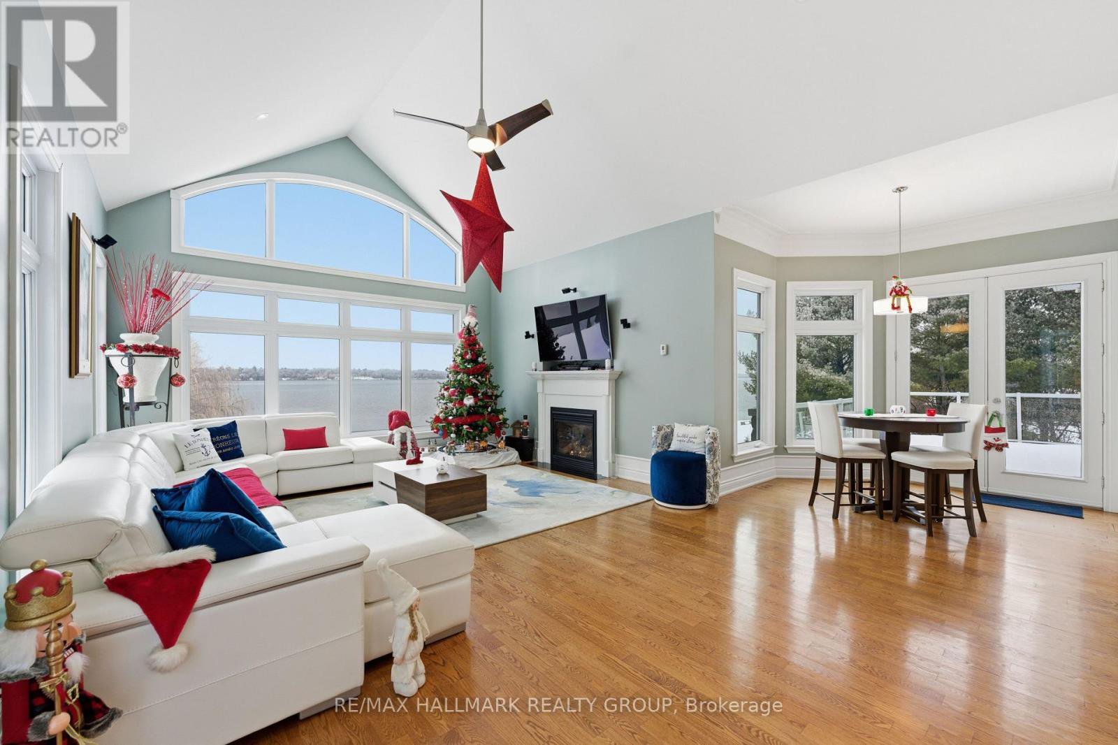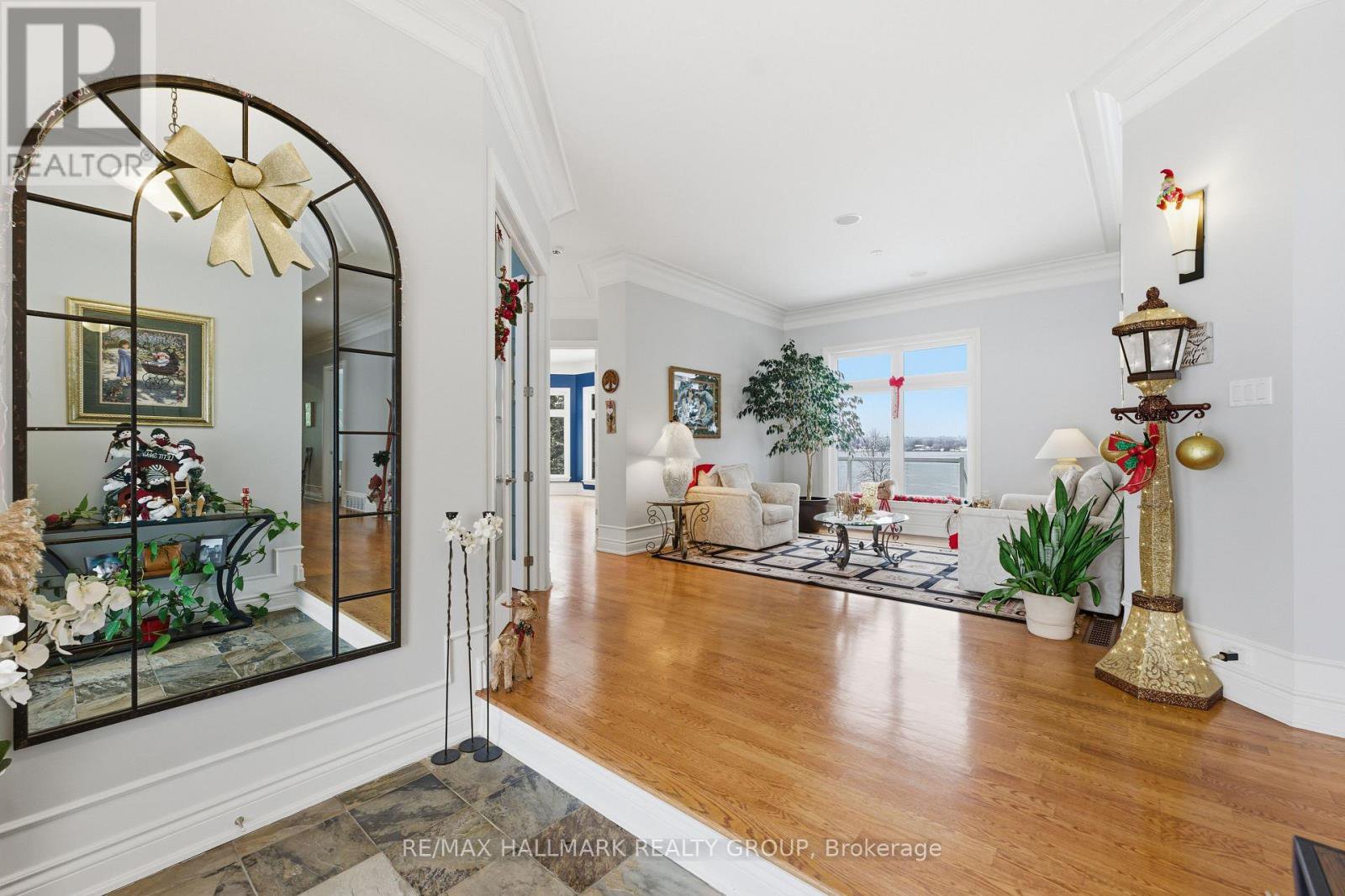 Exclusive executive waterfront estate offering over 200 ft of pristine frontage on the Ottawa River, set in the safest no-flood zone on the entire river. This impressive oversized bungalow spans 3,000+ sq.ft. on the main level, paired with a full 3,000-sq.ft. walkout basement, doubling your living space and maximizing breathtaking views.A newly installed in-ground pool, a large triple garage, and exceptional indoor-outdoor flow elevate the lifestyle offered here. Inside, every detail speaks luxury: 10-ft ceilings on both levels, abundant natural light, and a rare layout where each of the 3 main-floor bedrooms includes its own private ensuite.Upon entry, a spacious executive office sets the tone. The living room, kitchen, dinette, den, primary suite, and secondary bedroom all enjoy panoramic river views. The walkout level continues the experience with water-facing family room, game room, and home theatre, creating an entertainer's dream.A truly unmatched property for those seeking space, privacy, elegance, and unforgettable waterfront living.