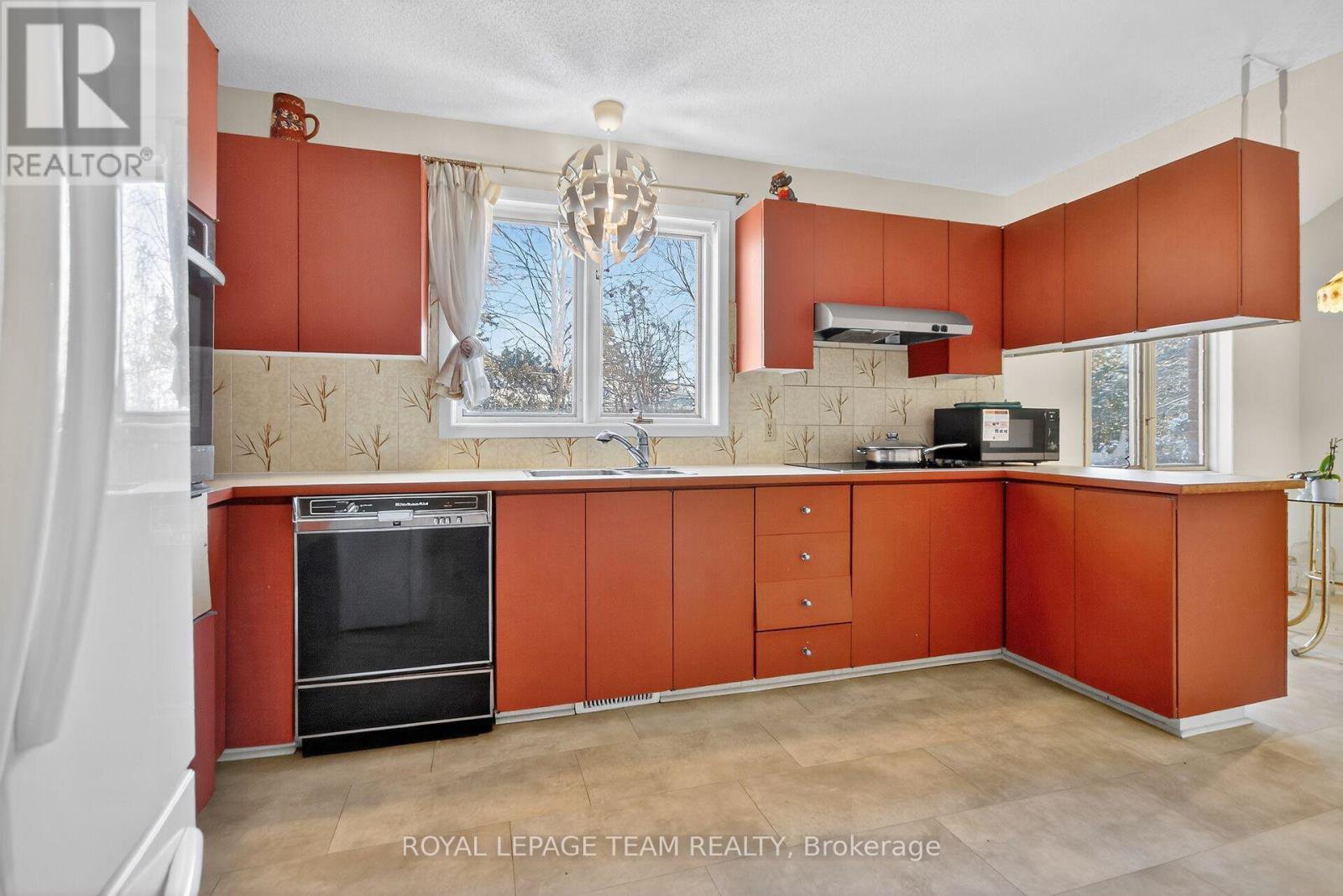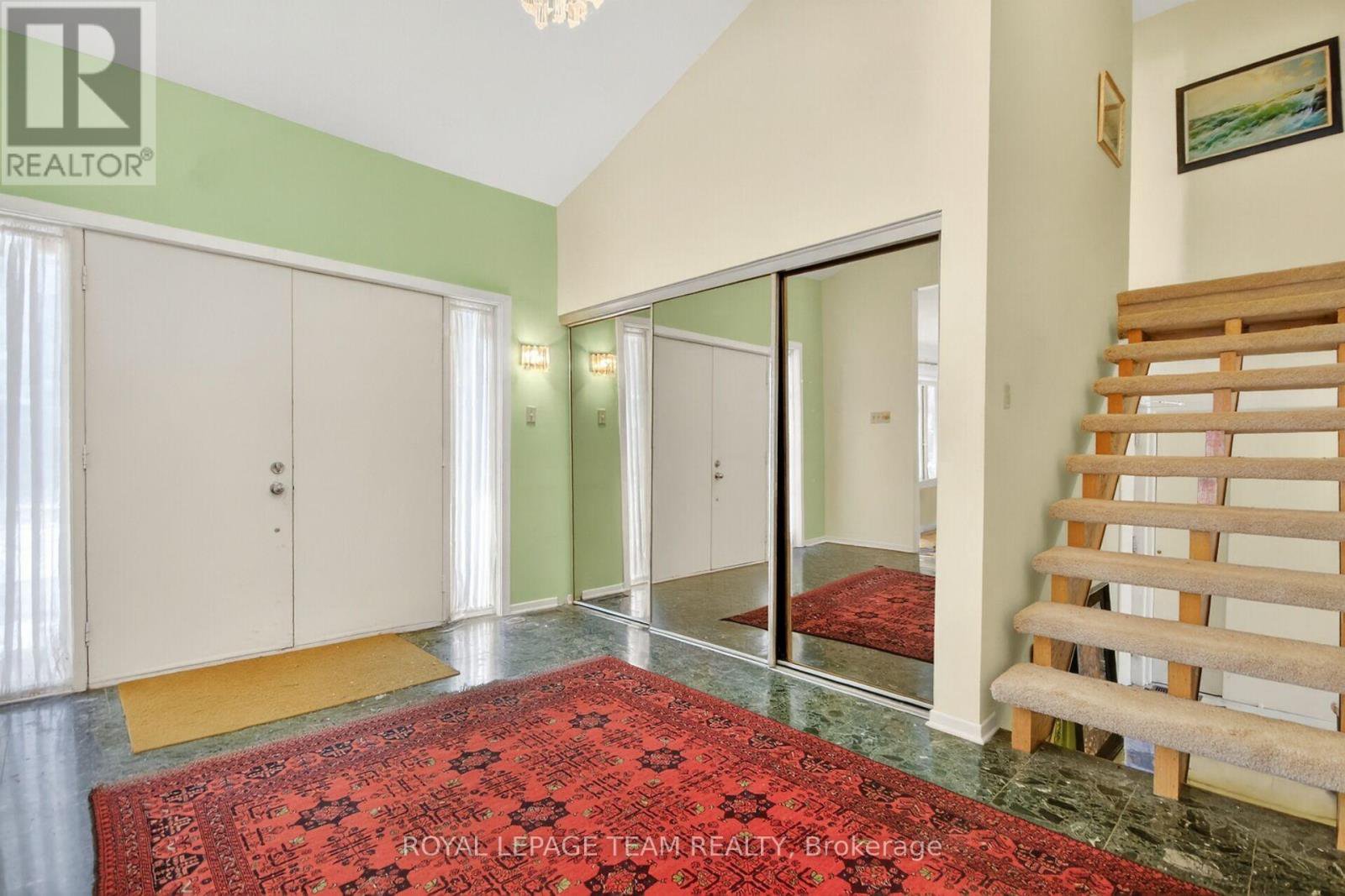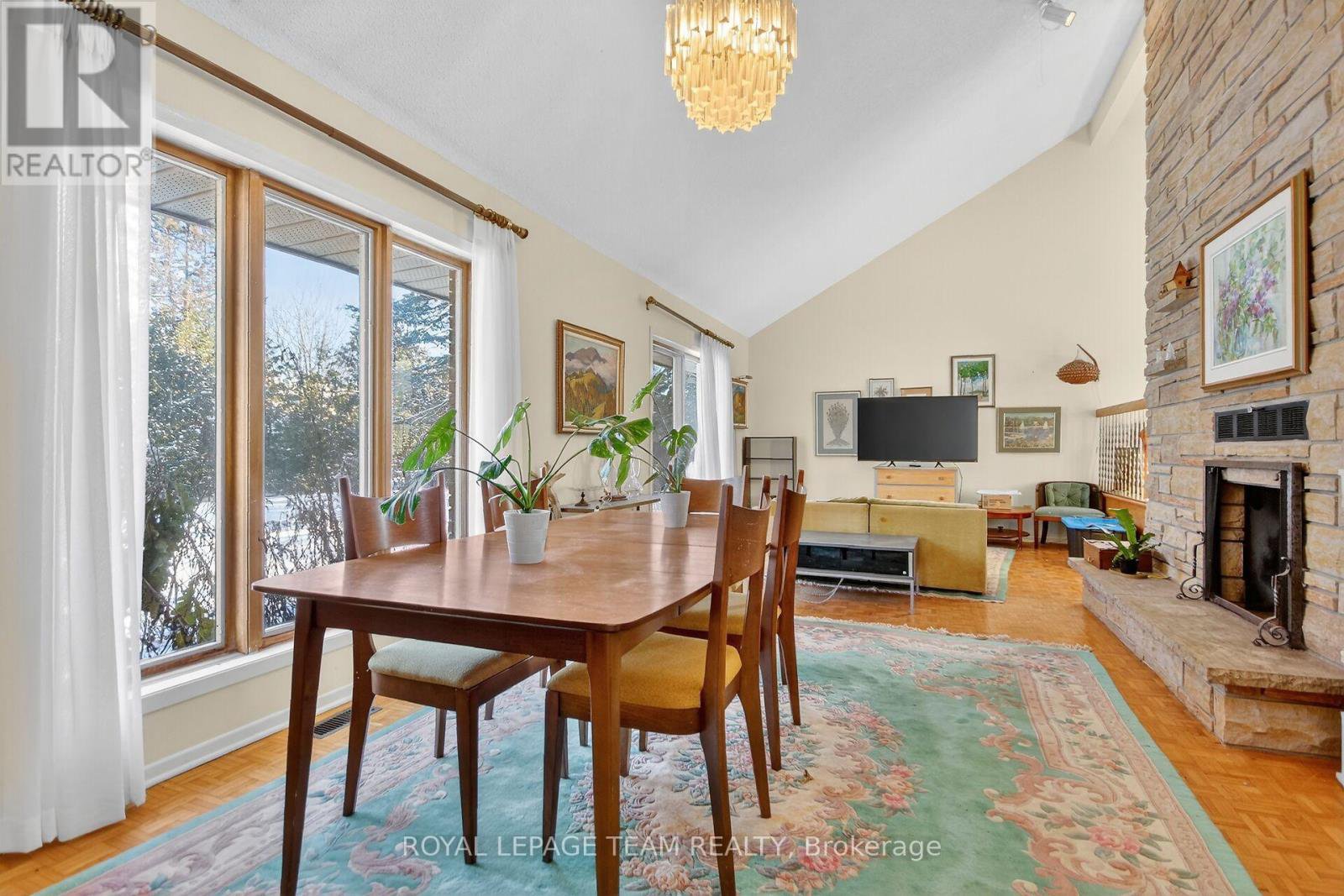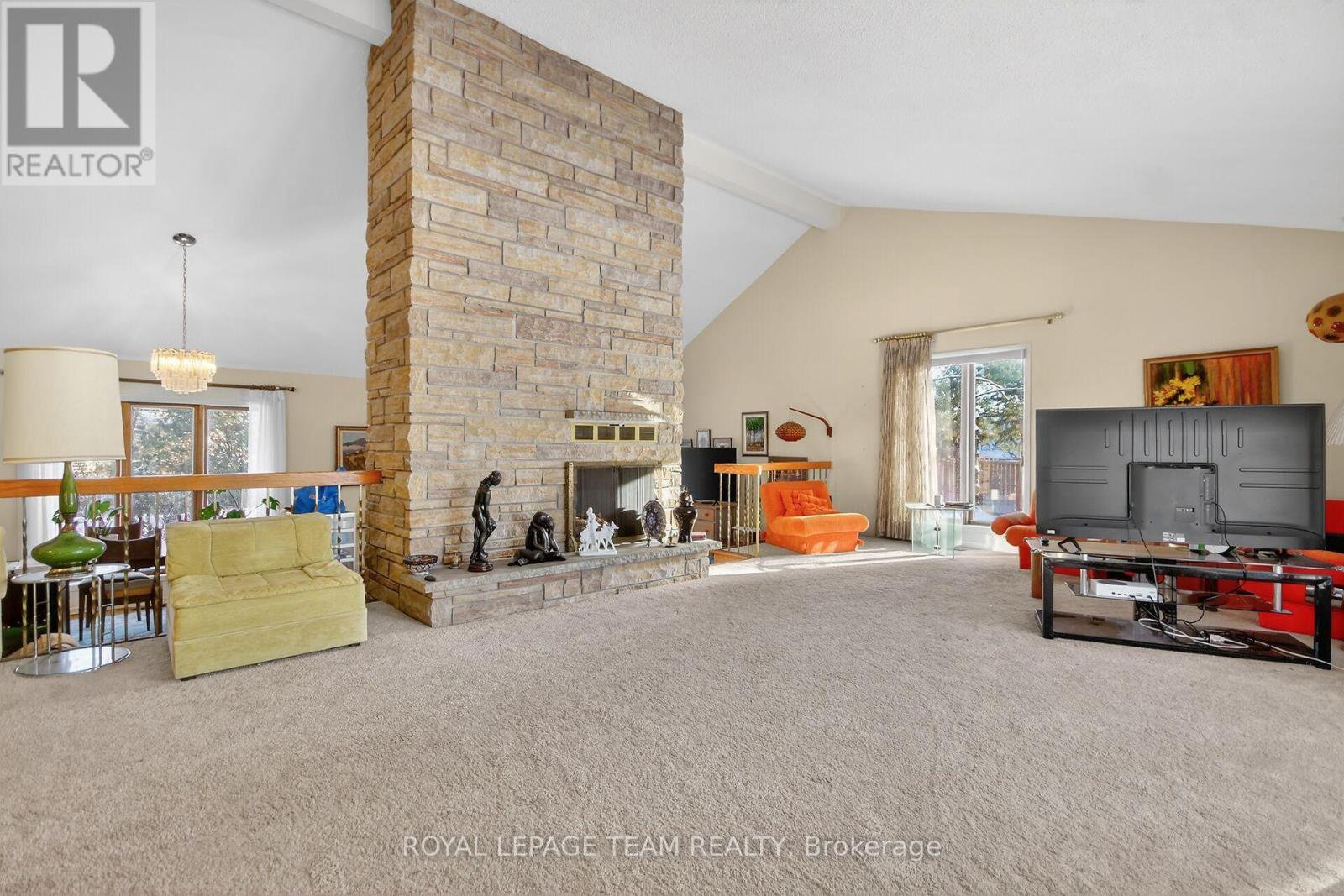 Stop the car! Fabulous opportunity to make this mid-century modern style home your dream home in a highly sought after neighbourhood of Honey Gables! Great bones to work with, over 2500 sq ft ... huge inviting entrance, vaulted ceilings in massive living room, sunken eat-in kitchen and dining room plus den with a dramatic 2 sided wood burning stone fireplace ... huge windows for fantastic natural light. Main floor office, powder room and laundry finish this level. A california style staircase takes you to the upper level. 3 bedrooms, a bonus sun room off one of the bedrooms and a balcony off the primary bedroom overlooking the street. Parking is not an issue with a 2 car garage and 4 more spaces. Massive yard for the family completes this picture. Walk a half block to Honey Gables Park sitting along the Rideau River. Note: Hydro panels on roof, infrastructure on exterior garage wall.
