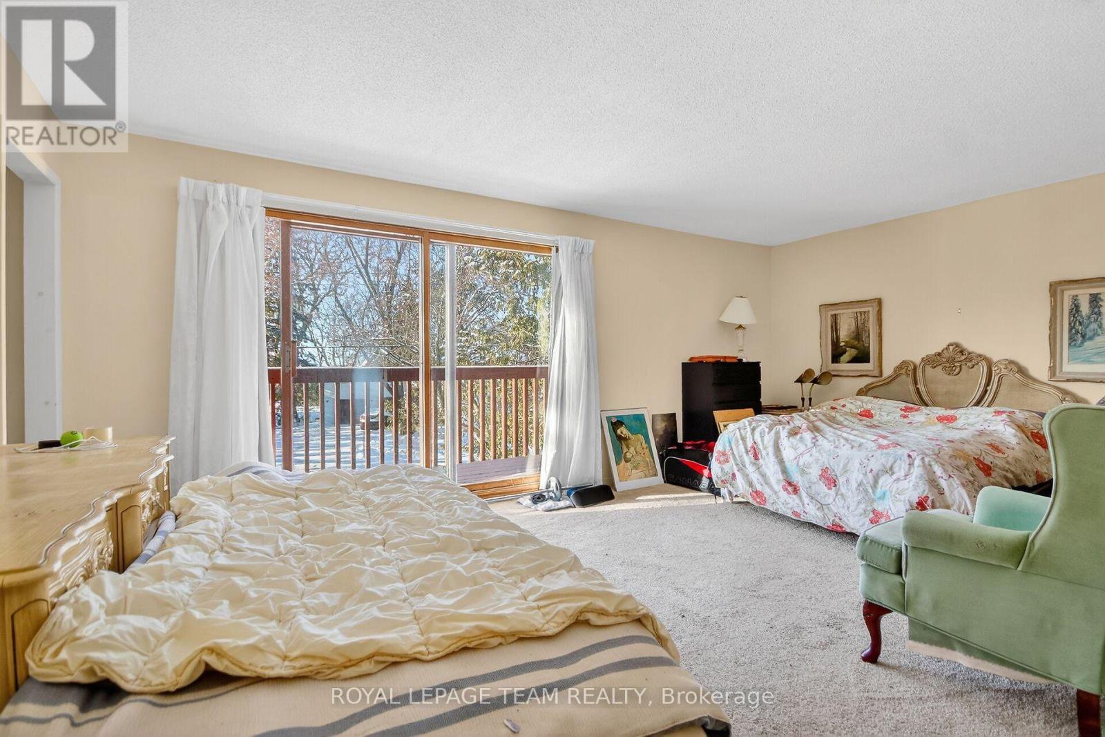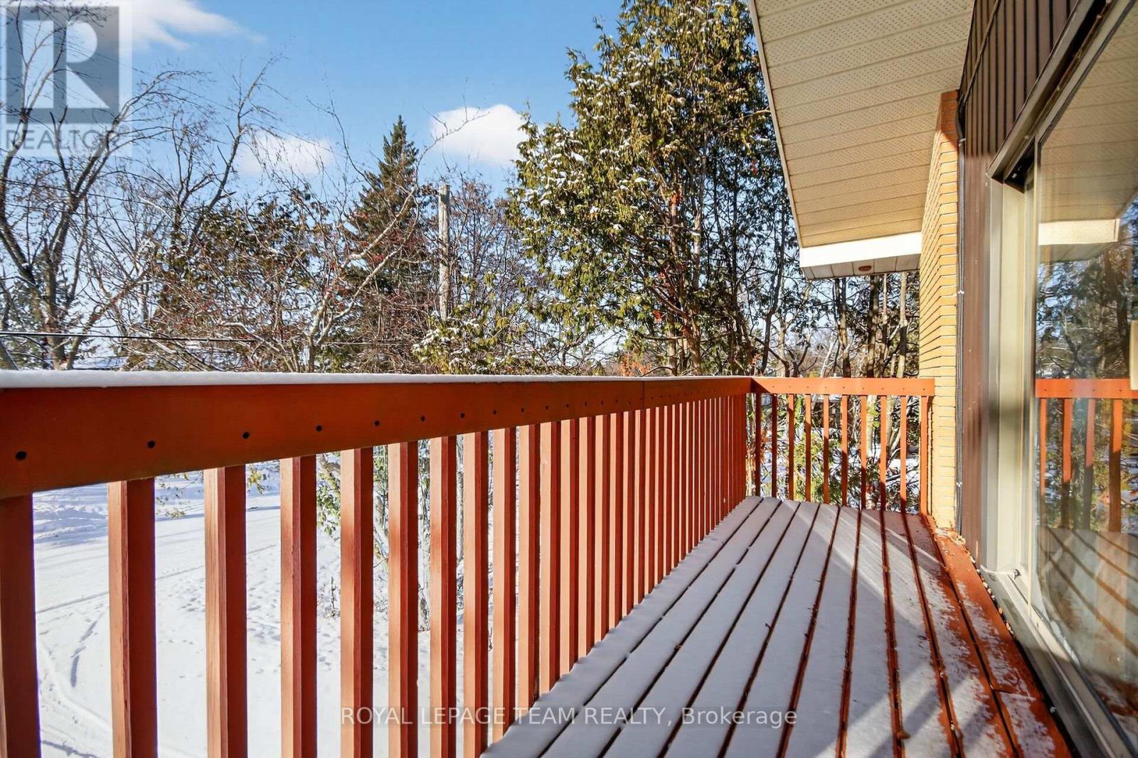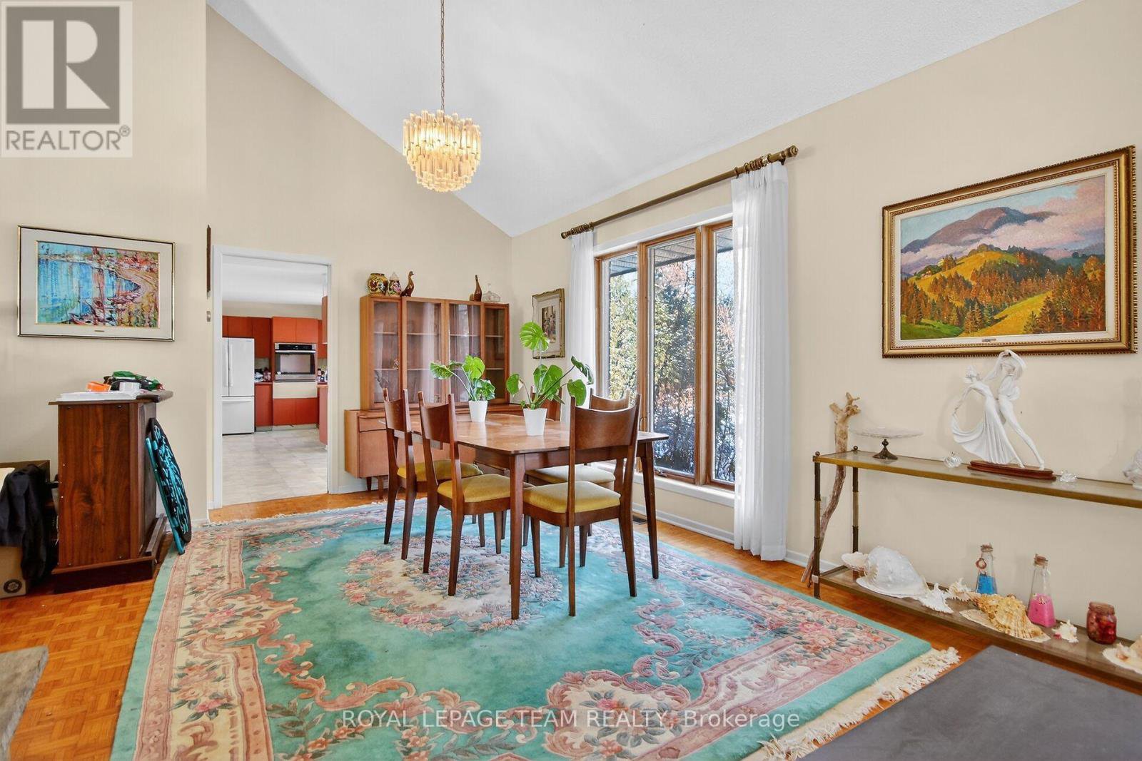Stop the car! Fabulous opportunity to make this mid-century modern style home your dream home in a highly sought after neighbourhood of Honey Gables! Great bones to work with, over 2500 sq ft ... huge inviting entrance, vaulted ceilings in massive living room, sunken eat-in kitchen and dining room plus den with a dramatic 2 sided wood burning stone fireplace ... huge windows for fantastic natural light. Main floor office, powder room and laundry finish this level. A california style staircase takes you to the upper level. 3 bedrooms, a bonus sun room off one of the bedrooms and a balcony off the primary bedroom overlooking the street. Parking is not an issue with a 2 car garage and 4 more spaces. Massive yard for the family completes this picture. Walk a half block to Honey Gables Park sitting along the Rideau River. Note: Hydro panels on roof, infrastructure on exterior garage wall.