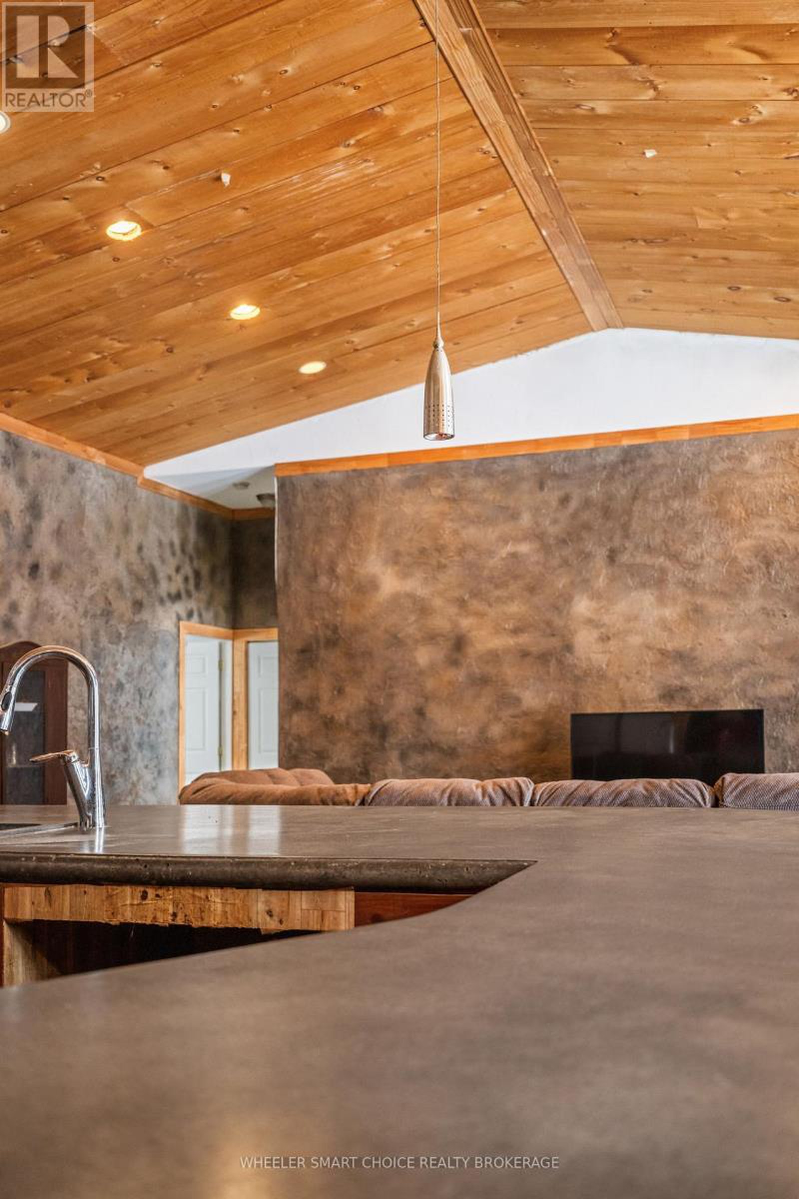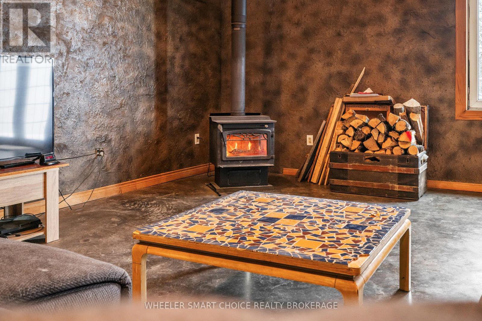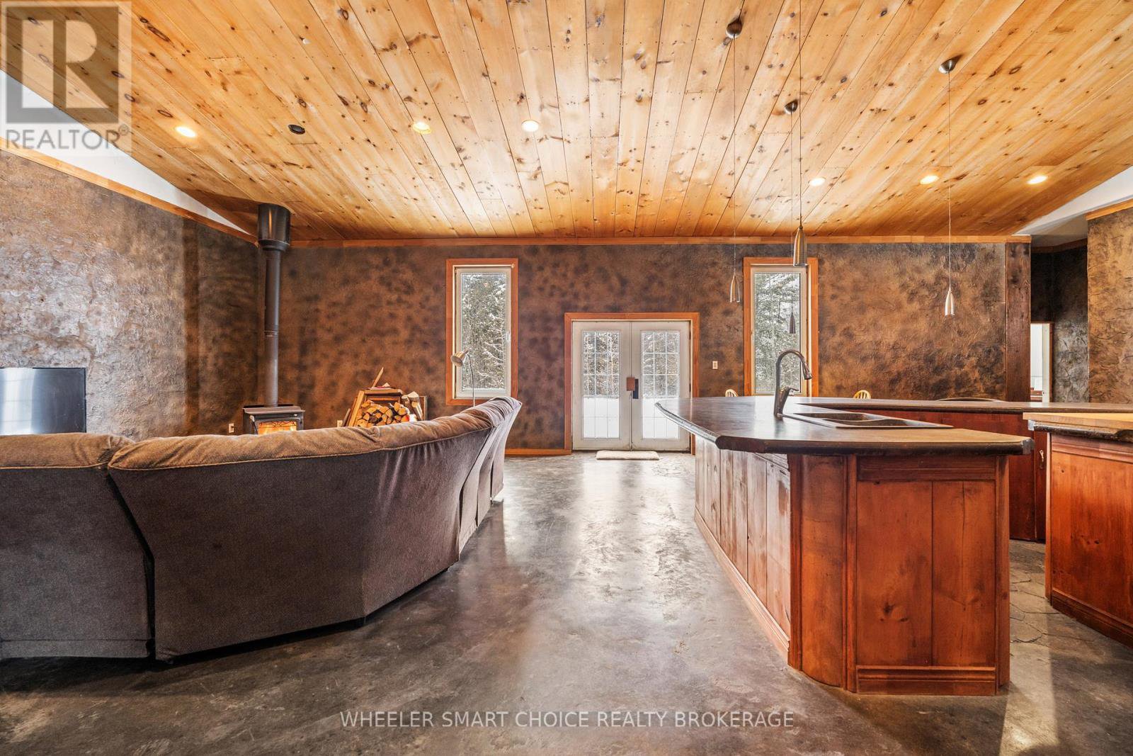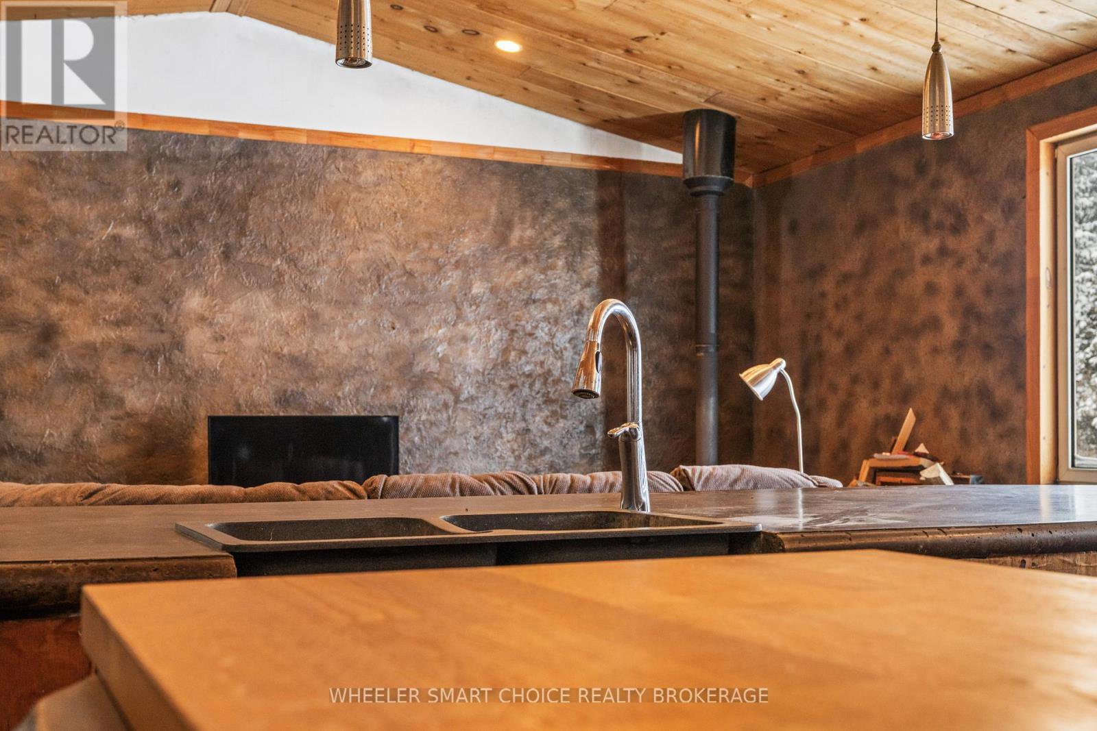 Unique rural ranch-style bungalow complete with a wooded area at the back, just under 2 acres. Modest from the curb but spectacular inside - this artisinally crafted home-built by the owners-features insulated concrete form (ICF) construction inside and out, delivering a solid R-50 envelope for exceptional comfort and efficiency. You will be wowed as your step into the expansive main room and immediately feel the scale and thoughtful detailing: soaring sightlines, natural textures, wooden cathedral ceiling and an open layout perfect for everyday living and entertaining. Acid-rubbed, textured concrete walls create a warm, pueblo-inspired atmosphere, while poured terracotta-tone concrete floors lend an earthy, quiet, and durable foundation to the living spaces.The home offers four bedrooms, a main bathroom, and a large, front-facing exercise/fitness room off the foyer - ideal for a home gym, studio, or flexible office space.The master bedroom is a work in progress but poised to become an exceptional retreat: large and bright with a patio door to the backyard, rough-in plumbing for a corner shower, tub and double sink, and a large walk-in closet/bonus area - excellent for a dressing room or private office.Set on a generously sized lot with mature trees in the back and room for outdoor living or future landscaping projects, this unique bungalow blends modern performance with artisanal character. Perfect for buyers seeking a quiet, energy-efficient home with distinctive architectural charm and plenty of indoor-outdoor potential. Located near Winchester-a historic village within the larger township of North Dundas, about 50 km south of Ottawa, known for its agricultural roots and charming small-town feel and offering a mix of quiet country life with nearby small town conveniences. Schedule a showing to experience the scale and craftsmanship of this unique home.