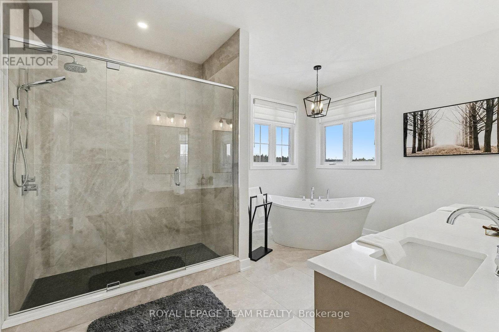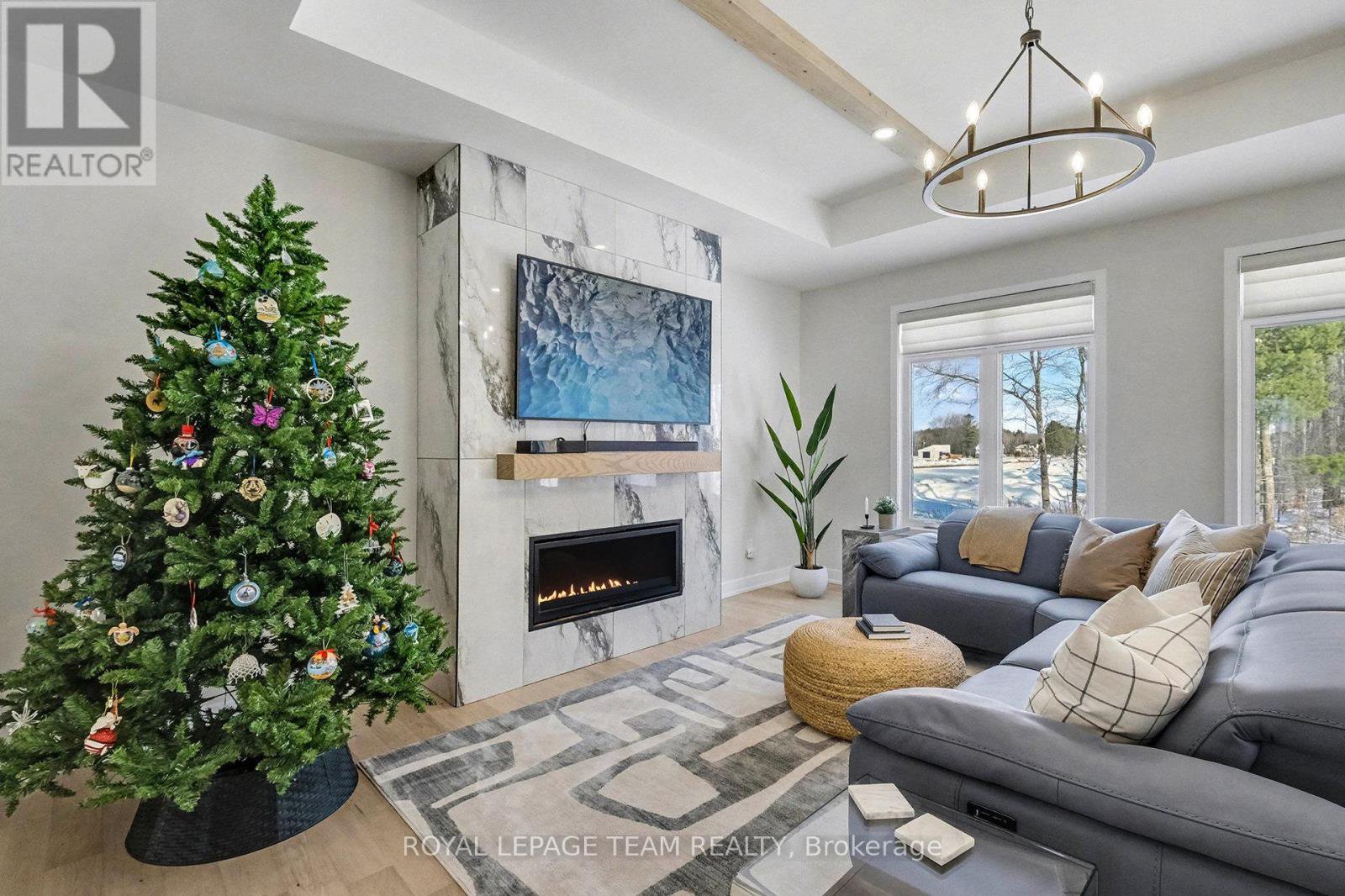 The Sussex in Silver Creek offers a private retreat on 3/4 acre in the peaceful community of Hallville. This turnkey, EnergyStar-certified home by ParkView Homes blends timeless style with modern function in a serene everyday setting. A paved laneway leads to a landscaped front yard with raised gardens and in-ground accent lighting. Inside, the open-concept design features tray ceilings, wide-plank engineered hardwood, and a striking gas fireplace anchoring the living room. The chef-inspired kitchen includes quartz counters, stylish backsplash, stainless steel appliances, large sink, ample storage, and an oversized island perfect for entertaining. A covered porch off the dining area extends living outdoors. A mudroom with garage access and adjacent laundry adds efficiency, while a dedicated office or flex space suits work, study, or hobbies. The primary suite is a true retreat with a spa-like five-piece ensuite featuring a freestanding soaker tub, glass-enclosed shower, and a spacious walk-in closet. Two additional generous bedrooms share a nearby three-piece bath. The lower level offers hardwood flooring and a professionally installed 20' x 12' gym flooring area. Automatic Hunter Douglas blinds, a Generac backup system, and a water treatment system enhance comfort and peace of mind. Outside, the private backyard is designed for relaxation, featuring a large hot tub with lounger, lush greenery, apple, pear, and evergreen trees, perennial gardens, and rose bushes. Elegant wrought-iron fencing on three sides with chain-link along the tree line adds privacy. A professionally designed Amish-style shed with lean-to provides ample storage, complementing the attached two-car garage. Custom Gemstone permanent decorative lighting highlights the exterior, offering beauty and year-round curb appeal. This exceptional property delivers refined living, thoughtful design, and a tranquil country setting - truly a place to call home.