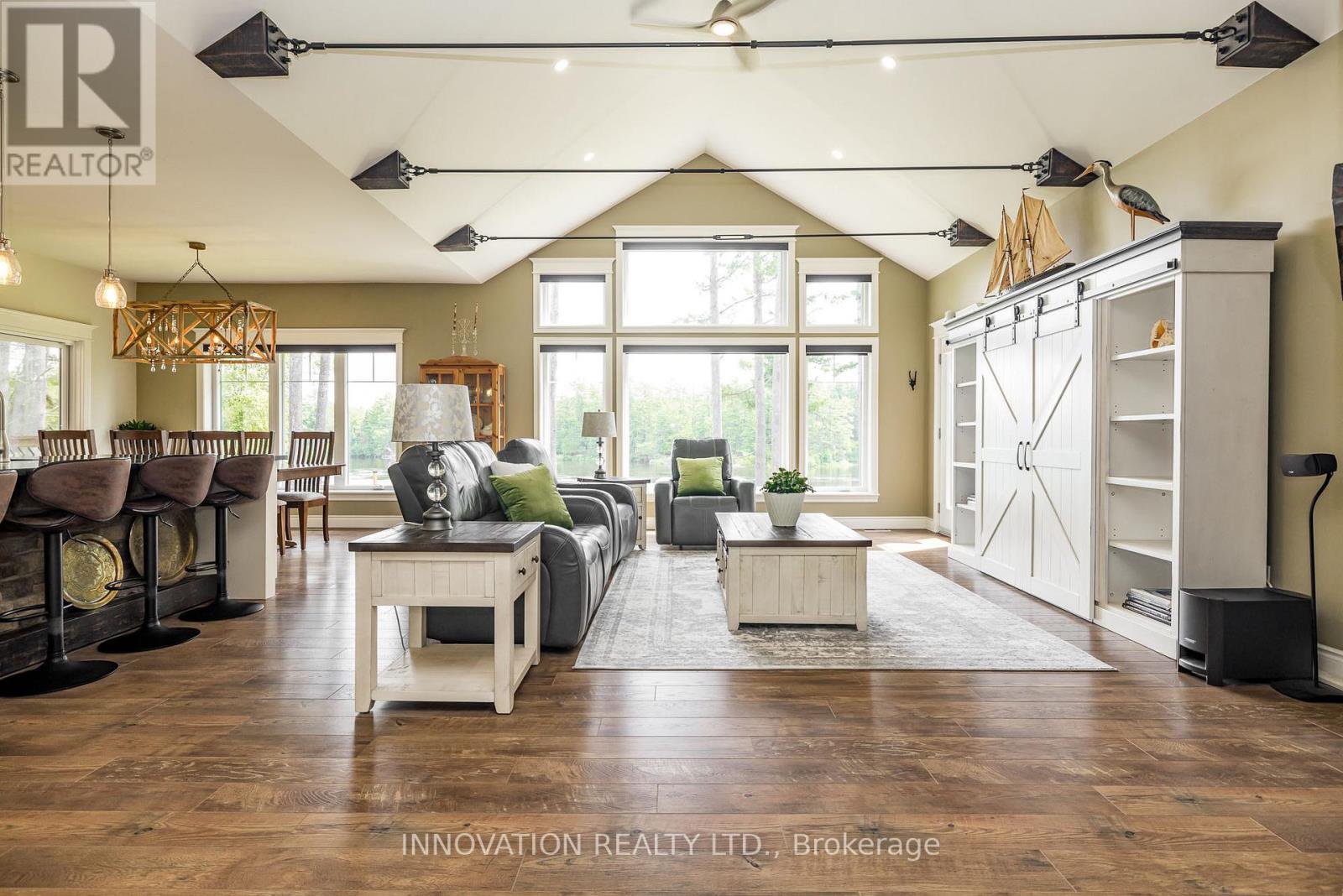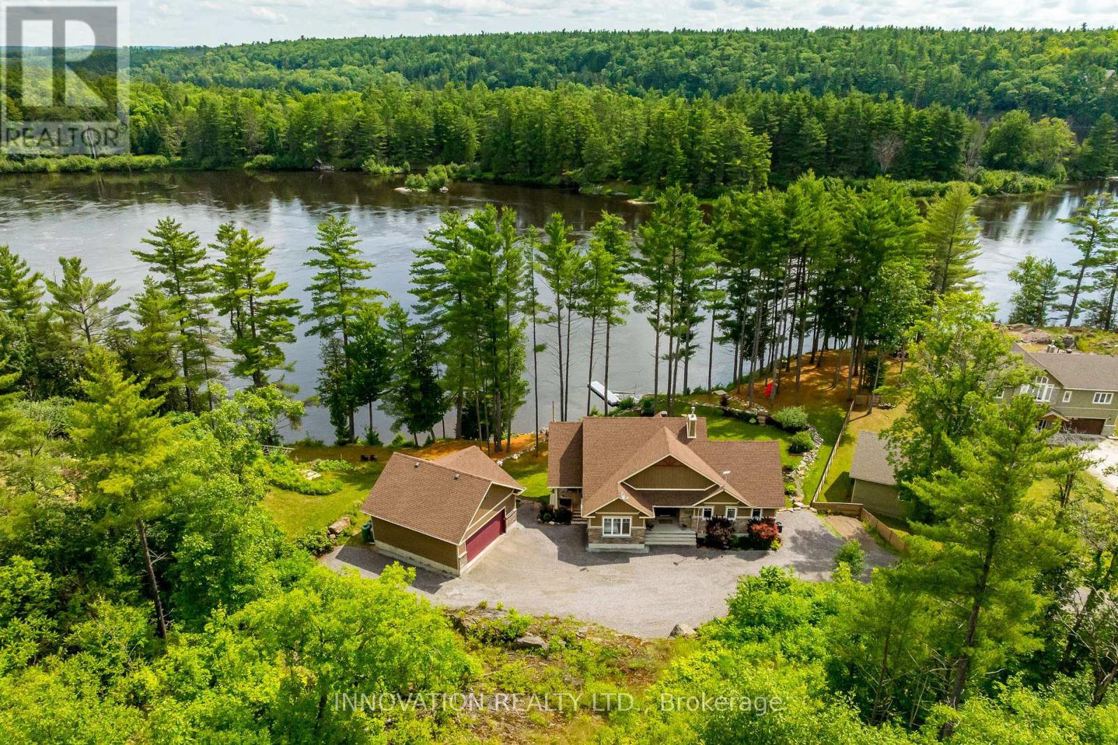 Discover a rare riverfront estate set along the tranquil shores of the Ottawa River. This custom-built 2019 bungalow offers 4 bedrooms, 3 bathrooms, and over an acre of beautifully landscaped grounds, framed by mature pines for exceptional privacy. Thoughtfully designed to balance elegance and comfort, the home seamlessly connects refined interiors with breathtaking natural surroundings. Inside, soaring vaulted ceilings and expansive windows capture panoramic river views and flood the open-concept living space with natural light. The chef's kitchen is both stylish and functional, featuring high-end appliances, a large island, a walk-in pantry, and a reverse osmosis system-ideal for daily living and effortless entertaining. The primary suite is a private retreat with serene water views, balcony access, and a spa-inspired ensuite complete with a glass shower, deep soaker tub, and dual vanities. A second bedroom on the main floor adds flexibility, while the walkout lower level offers radiant floor heating, two additional bedrooms, a custom recreation area, and direct access to the backyard. Every detail has been carefully considered, from the well-appointed laundry room with granite counters and custom cabinetry to modern conveniences including motorized blinds, programmable thermostats, central air, Lifebreath air exchanger, and a full HD security system. An oversized detached heated garage provides ample space for vehicles, storage, or a workshop. Outdoors, the property becomes a true oasis. Enjoy year-round relaxation in the screened spa lounge with hot tub, gather around the fieldstone firepit, or head to the floating dock for boating, kayaking, and exceptional fishing, an angler's paradise. Additional features include an irrigation system, cedar kayak rack, and a charming hobby garage. This is more than a home; it is a refined waterfront lifestyle offering privacy, comfort, and timeless natural beauty.