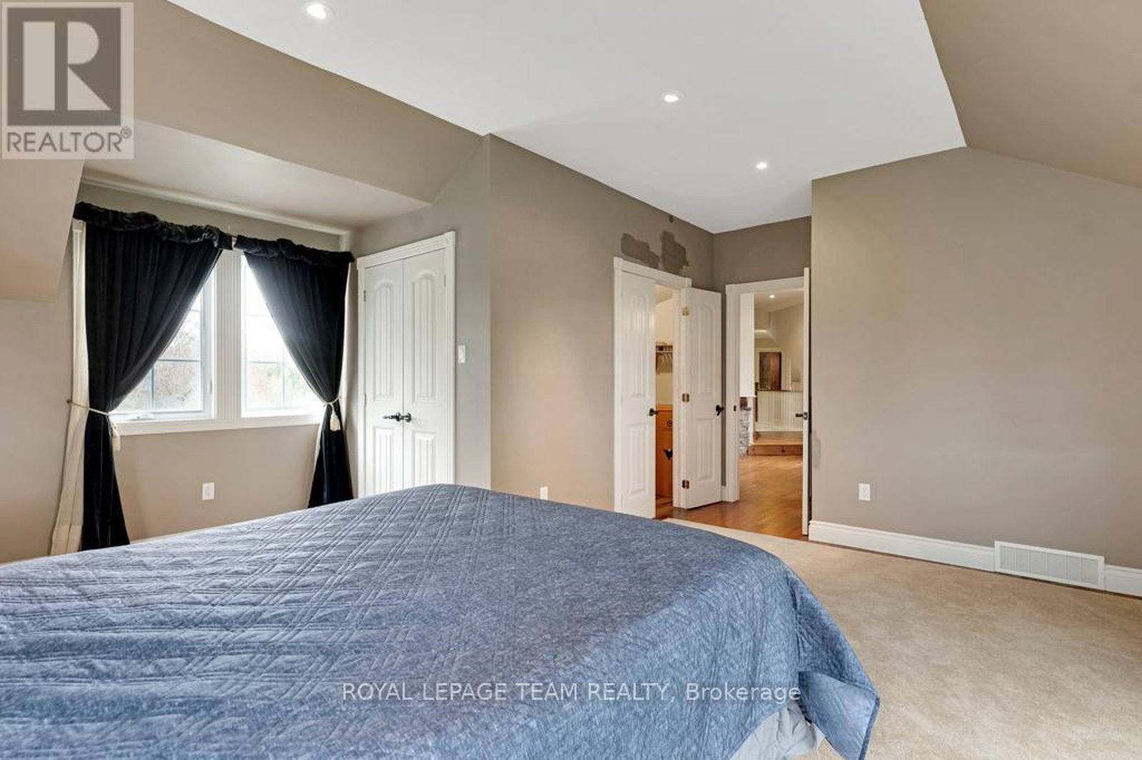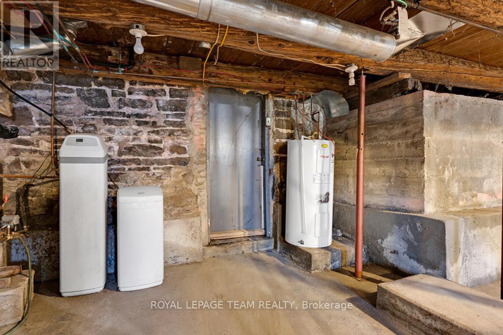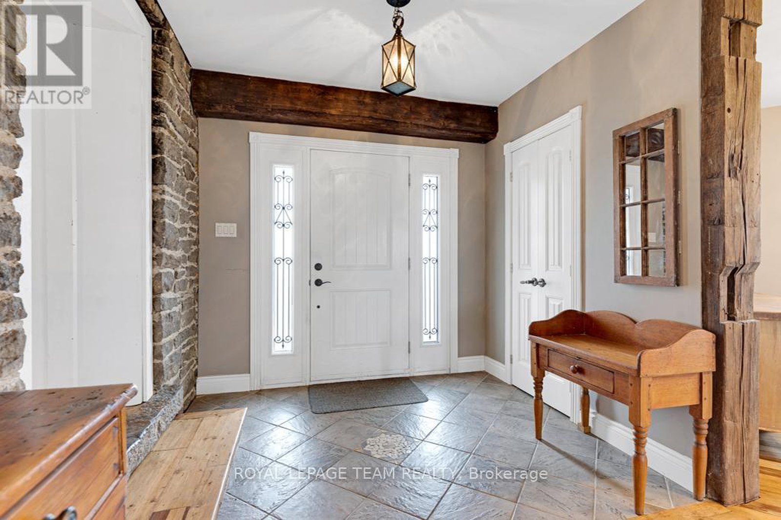 Charming Century Stone Home on 9+ Acres Oxford Mills. Located just minutes from Kemptville on a scenic paved country road, this beautifully maintained century stone home with a tasteful addition offers timeless character and modern updates on over 9 acres of peaceful countryside. Step into a spacious entryway with custom tile flooring and a walk-in closet. The main floor features newly refinished wide plank wood floors, exposed beams, and a stunning stone fireplace with wood insert in the cozy family room. The adjacent dining area flows into a screened-in porch through terrace doors, perfect for summer entertaining or enjoying cool evenings.The kitchen blends vintage charm with functionality, showcasing warm wood cabinetry, a built-in hutch, farmhouse sink, and deep window sills. A sunlit eat-in area with large windows provides a bright and welcoming breakfast space. Off the kitchen, a pantry/mudroom with a 2-piece bath adds main floor convenience. Beautiful central staircase separates the cozy living area from the kitchen with built-in bookcases, creating a library-style retreat. The second floor is a true 4 bedroom with wide plank floors, a vintage-inspired 2-piece bath sits at the top of the stairs, while the main bath offers a tranquil escape with a soaker tub, separate shower, and antique vanity overlooking green pastures. A spacious second-floor laundry room with exposed stone wall and large window adds charm and functionality. The primary bedroom is set apart for privacy and includes ample closet space.Additional features include a waterproofed stone foundation under the original home, slab-on-grade construction under the addition, a water softener system, drilled well (2003), and submersible pump (2020). The stone exterior was repointed within the past 30 years. Outside, a quaint red barn offers space for a workshop or storage. Ideal for outdoor enthusiasts, hobby farmers, or families, this property has room for small animals, gardens, kids and pets to play!