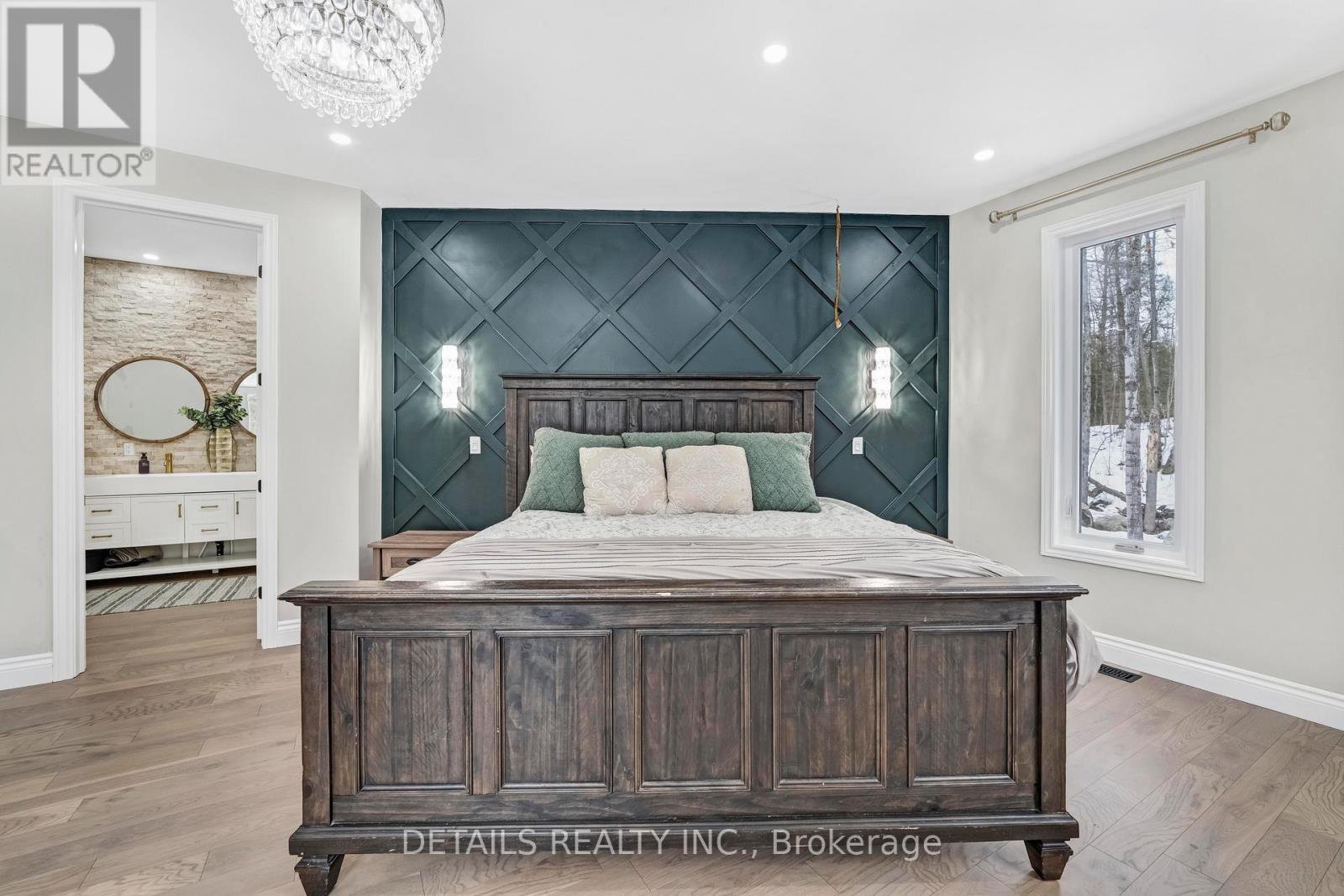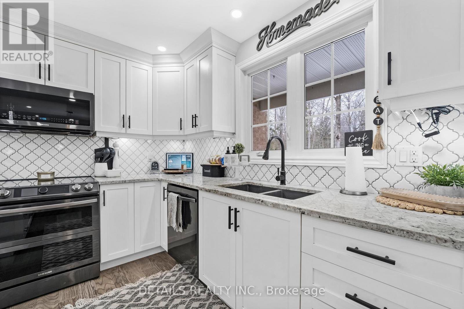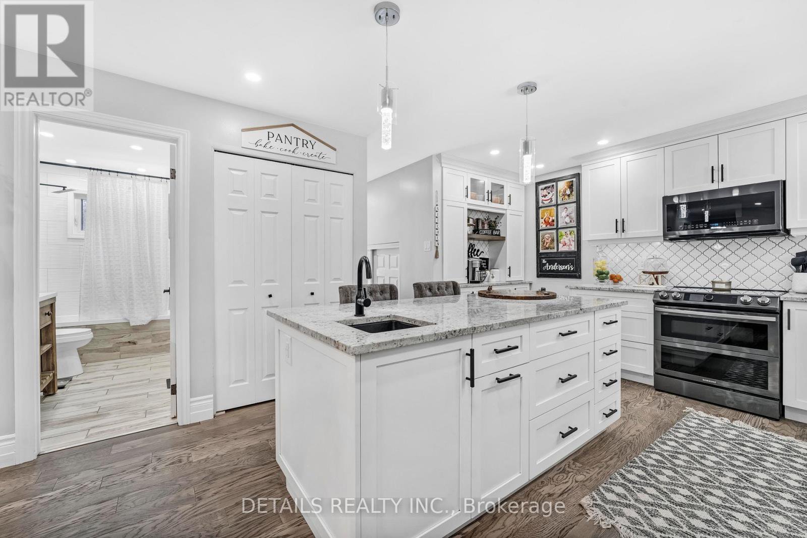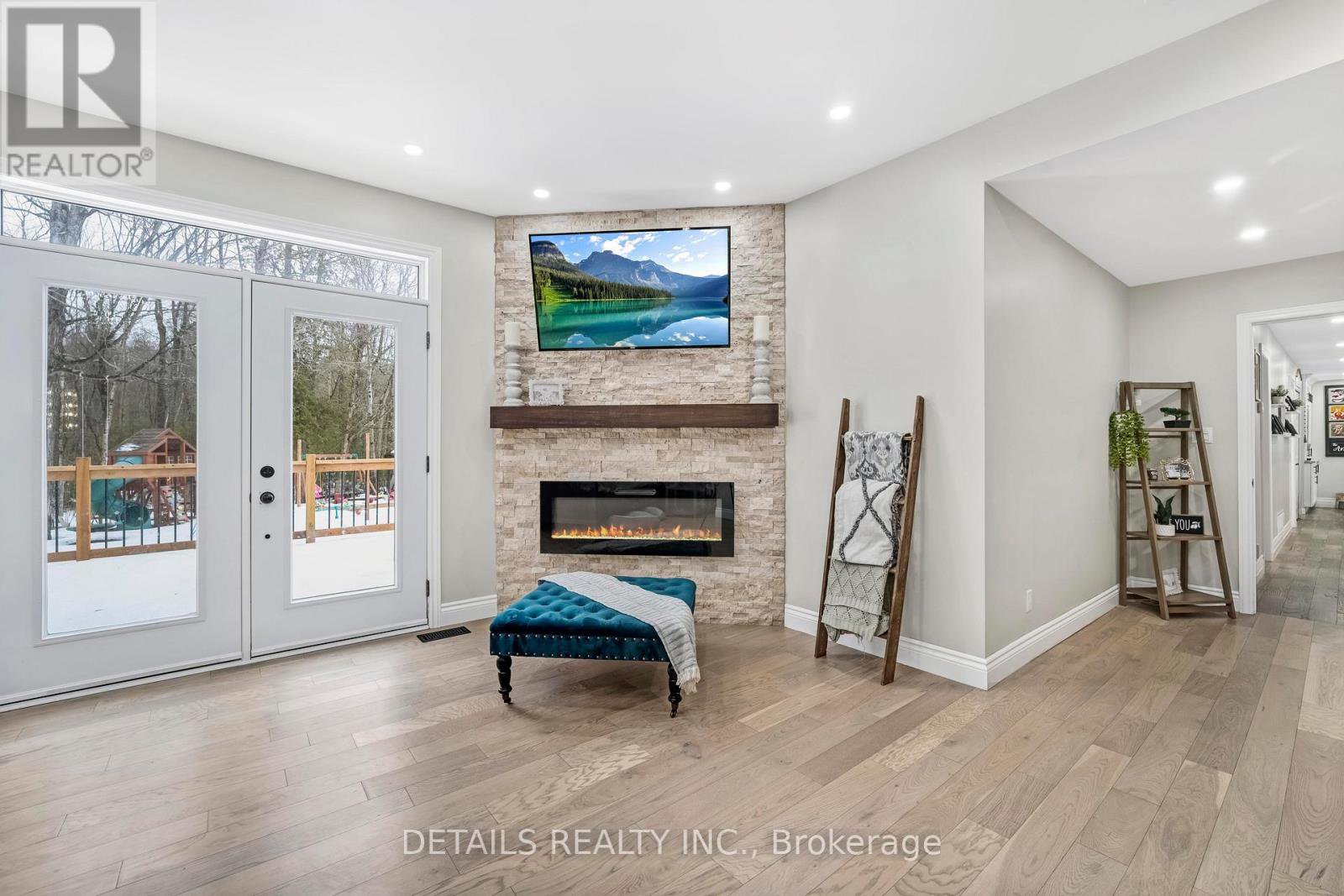 Absolutely stunning! Beautifully upgraded 4 Bedroom Bungalow with a full addition recently added boasting over 3350 sq ft of luxury living space, nestled in amongst trees on a beautiful private 3 acre lot! The gourmet kitchen boasts Granit counter tops a large center island, ample cupboard space, breakfast Bar, pocket lighting and high-end SS-appliances. A full addition added to the Bungalow offers a very large Primary Bedroom, boasting an incredible ensuite bath room and a very large walk-in closet, electric fireplace, pocket lighting with patio doors to a large deck over looking the private rear yard. Spacious living room with woodburning fireplace and pocket lighting. Engineered hardwood throughout the main level. Beautifully renovated lower level boasts 2 family rooms (one could be huge 5th bedroom) 3 piece bathroom, Video projector, pocket lighting, utility room and large walk-in cold storage. ***The attached two car Garage is Oversized -24' wide x 28'6" deep with 60 amp service.*** The beautiful private rear yard feels like an oasis in the summer, 2 decks, Gazebo, pergola with interlock patio, 27' above ground pool, backyard with grass lawn and trees in the background... so beautiful and tranquil!