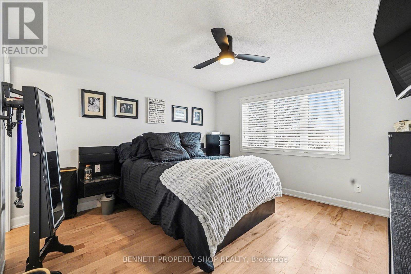 Renovated from top to bottom, this stunning open-concept end-unit townhome is located in the highly desirable Fairwinds community, close to shopping, recreation, parks, and schools. Thoughtfully updated throughout, this home offers modern finishes, excellent functionality, and turnkey living. The main level features a spacious foyer and beautiful hardwood flooring that flows through the open living and dining areas. The inviting living room is anchored by a cozy gas fireplace, creating a warm and comfortable space for everyday living and entertaining. The upgraded eat-in kitchen offers stainless steel appliances, granite countertops, ample cabinetry, and patio doors leading to the backyard. The second level includes a generous primary bedroom with walk-in closet and a private ensuite featuring a stand-up shower. Two additional well-sized bedrooms, a full main bathroom, and the convenience of second-floor laundry complete this level. The fully finished basement provides a spacious family room ideal for movie nights, a home gym, play area, or home office. Outside, enjoy a large deck and fully fenced backyard, perfect for relaxing or entertaining. The hot tub is included. Sellers may also be open to leaving select items including fitness equipment, outdoor smart TV with protective case, lawnmower, and bedroom furniture. Extensive updates include kitchen renovation, hardwood flooring on main and second levels, basement flooring, heat pump, furnace, hot water tank, kick-sweep vacuum, roof, garage door, and main entrance door. A beautifully maintained home offering exceptional value in a fantastic location.