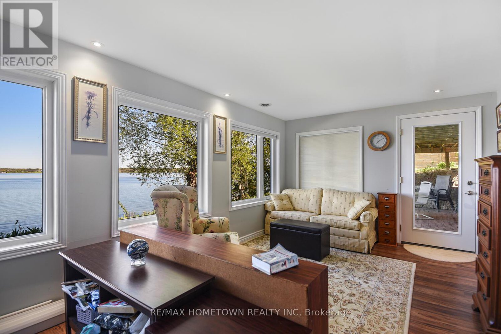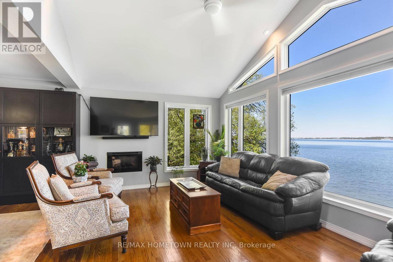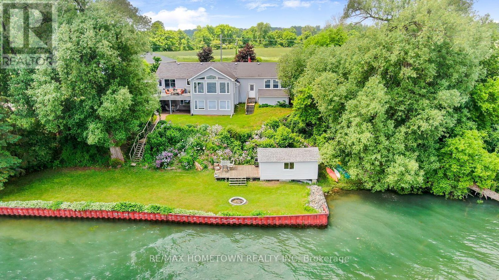 Welcome to 1435 County Road 2, a rare find on the beautiful St. Lawrence River! If you're looking for peaceful waterfront living, step inside and be instantly greeted with a full view of the river through a wall of large windows. Open-concept living and dining areas. The built-in wall unit includes a buffet, china cabinets, lighting, and lots of storage. Custom walnut kitchen with a generous island, including a prep sink and seating, designed for creating great meals and gathering with friends. Just off the kitchen is a 3-piece bath with a walk-in shower and a separate laundry room with a built-in ironing board. 2-car oversized garage with workshop area.The primary bedroom offers built-in drawers and cupboards and a spacious walk-in closet. Access the large deck from the living room or bedroom. Enjoy quiet mornings with coffee and an expansive river view, and watch the ships go by. Soak in the river views sitting on the deck, with a railing of glass panels and a dining area with built-in seating and storage cupboards, ideal for year-round BBQs. The lower level offers the same large windows as the main-level living room and includes two additional bedrooms, a 4-piece bath with a large soaker tub, a large walk-through storage room, and a big flexible room that can be used as a family room or office.The view may be too distracting to get much work done! Walk out to a covered patio and follow the stairs to the river to a 100 ft wide lawn, a cabin for sleeping,storing kayaks,swimming and fishing supplies. Attached is another deck for dining or lounging. Beyond the cabin is a beach area. Wildlife abounds; every day when you see the resident bald eagle sitting on its perch in the trees, ready to dive for a fish. Sometimes you'll be greeted by a heron standing on the seawall or at the beach. Watch ships and sailboats float by on the mighty St. Lawrence. Surrounding the home are vibrant, low-maintenance perennial gardens and fruit trees (apple, pear, plum,cherry, saskatoon).