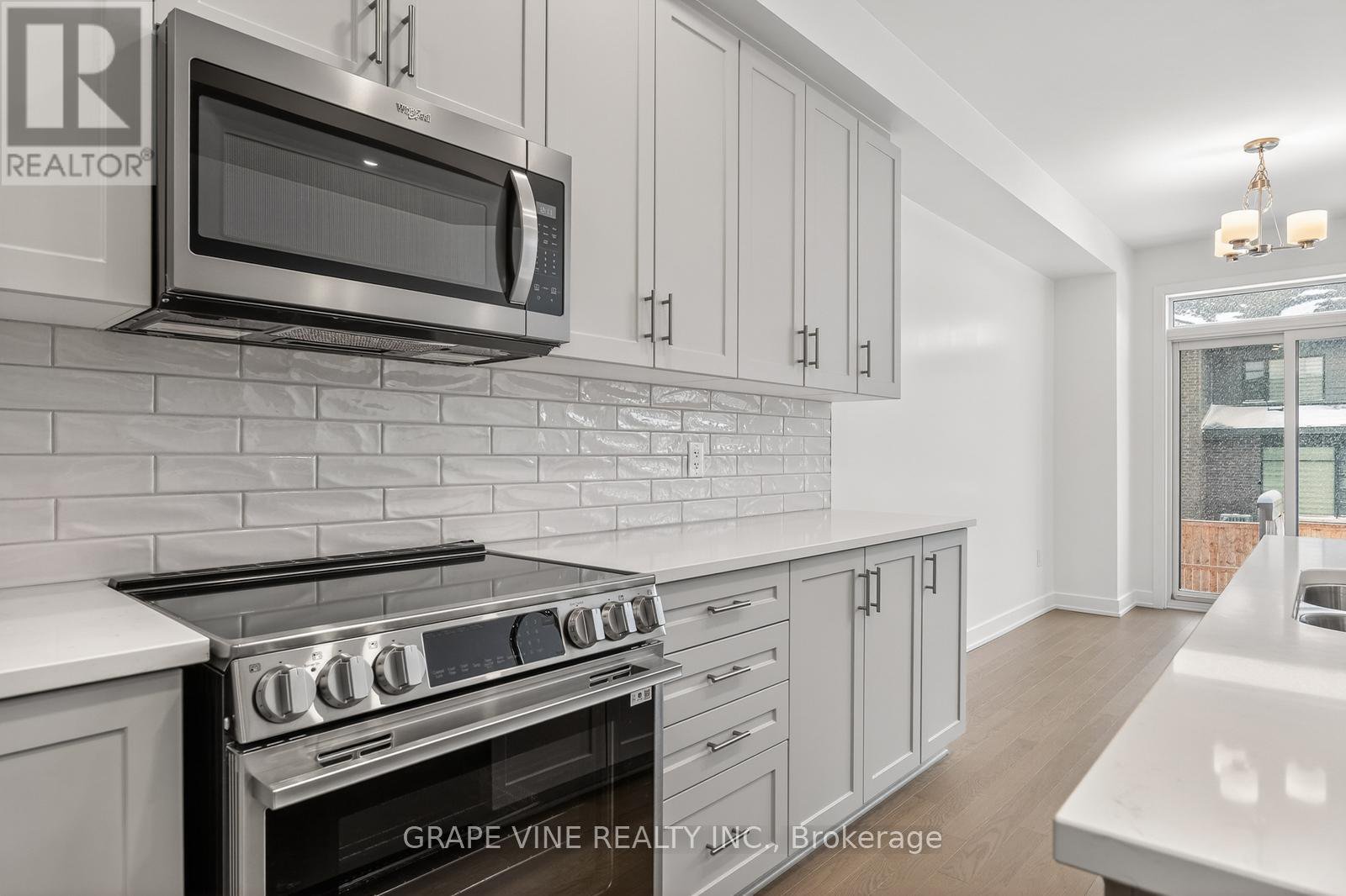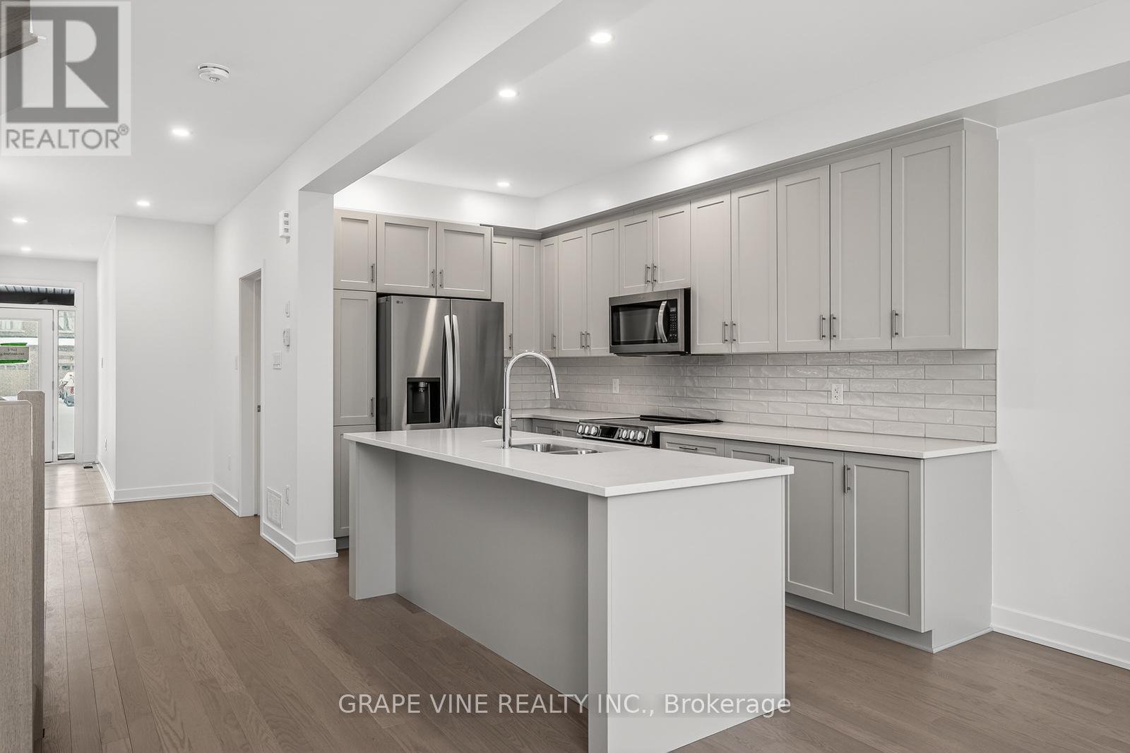 Stunning End-Unit Wentworth 3 by Claridge Homes. ~2,105 sq. ft. of thoughtfully designed living space with 3 bedrooms and 2.5 baths. Enjoy an open, functional layout with generous natural light, quality finishes, upgraded quartz countertops throughout, hardwood floors, and a striking hardwood main staircase. The chef-inspired kitchen features an upgraded backsplash and ample workspace, perfect for entertaining. Spacious bedrooms offer comfort and privacy, and designer touches elevate everyday living. End-unit location adds added light. Includes central air conditioning and premium interior upgrades. Situated in the desirable Riverside South community with convenient access to parks, shopping, transit, and local amenities. A beautiful blend of modern design, quality construction, and everyday convenience - ideal for families or professionals seeking new construction excellence. Move-in ready!