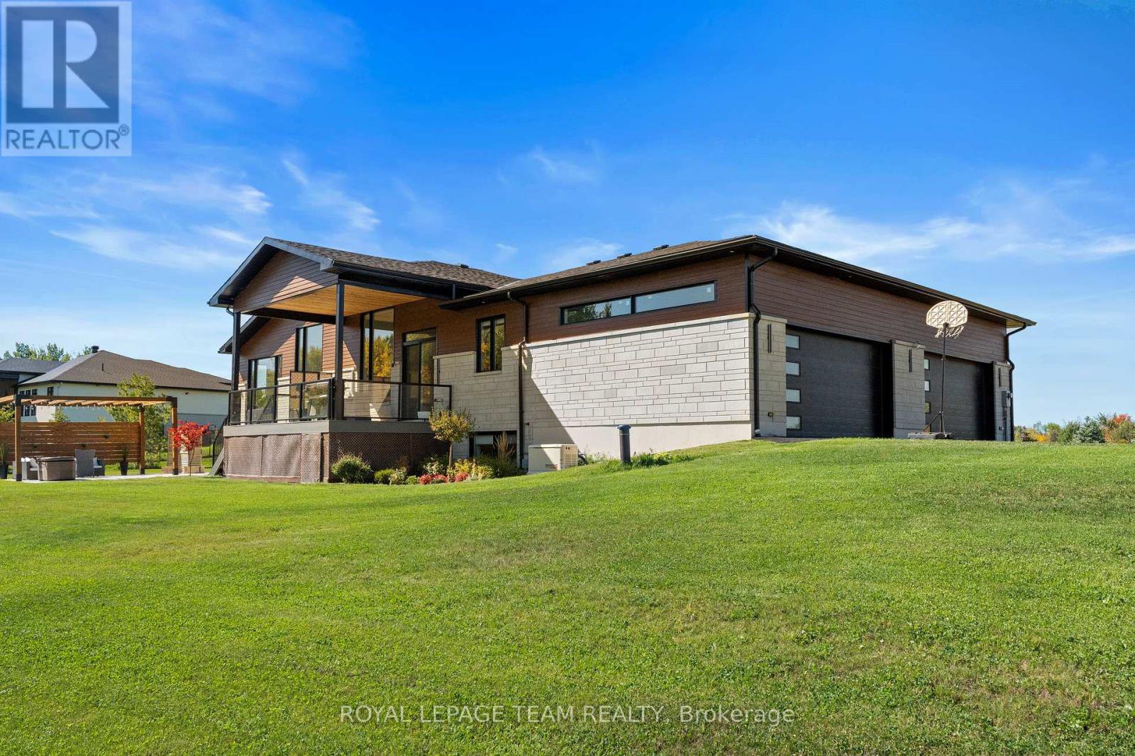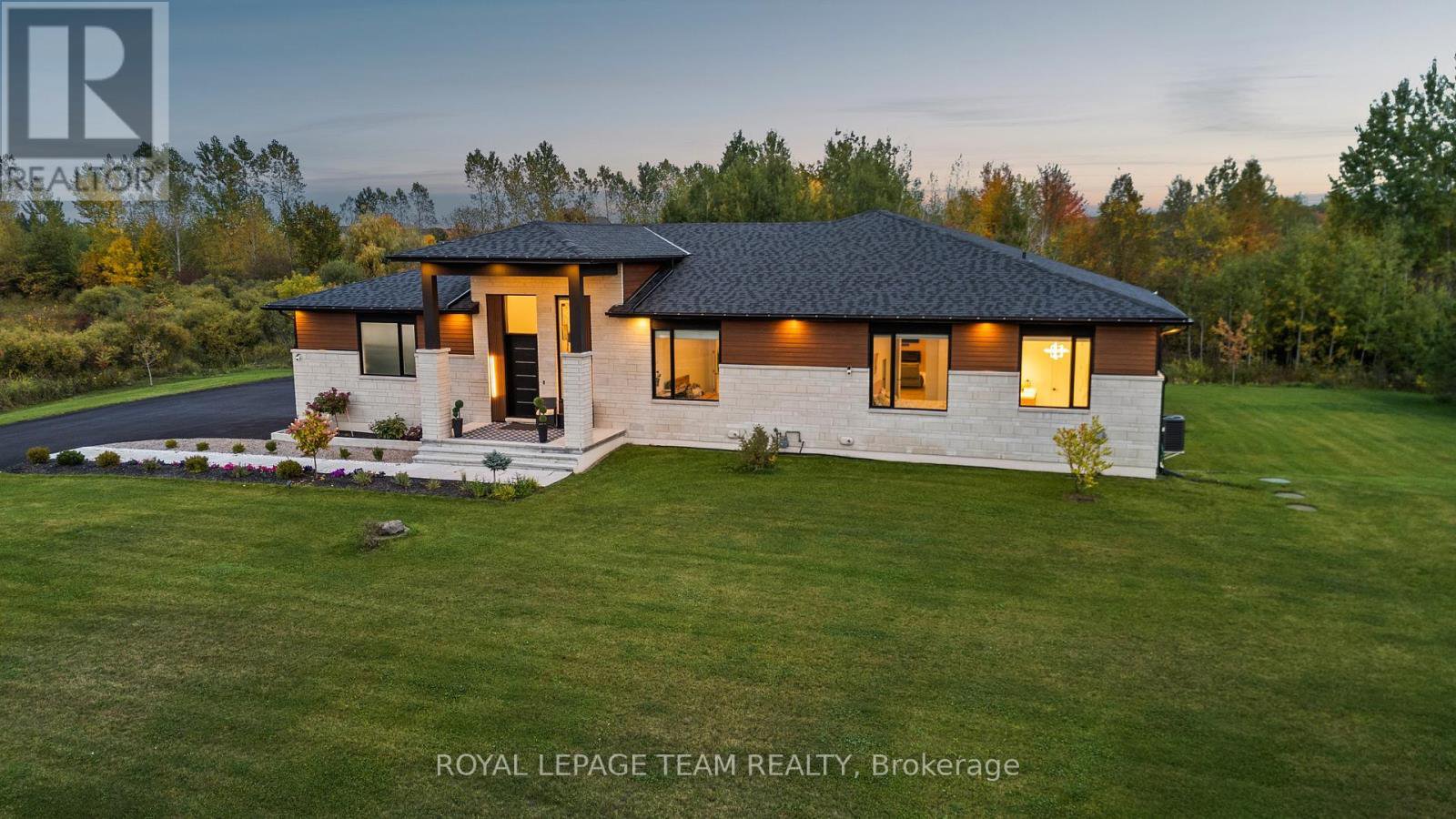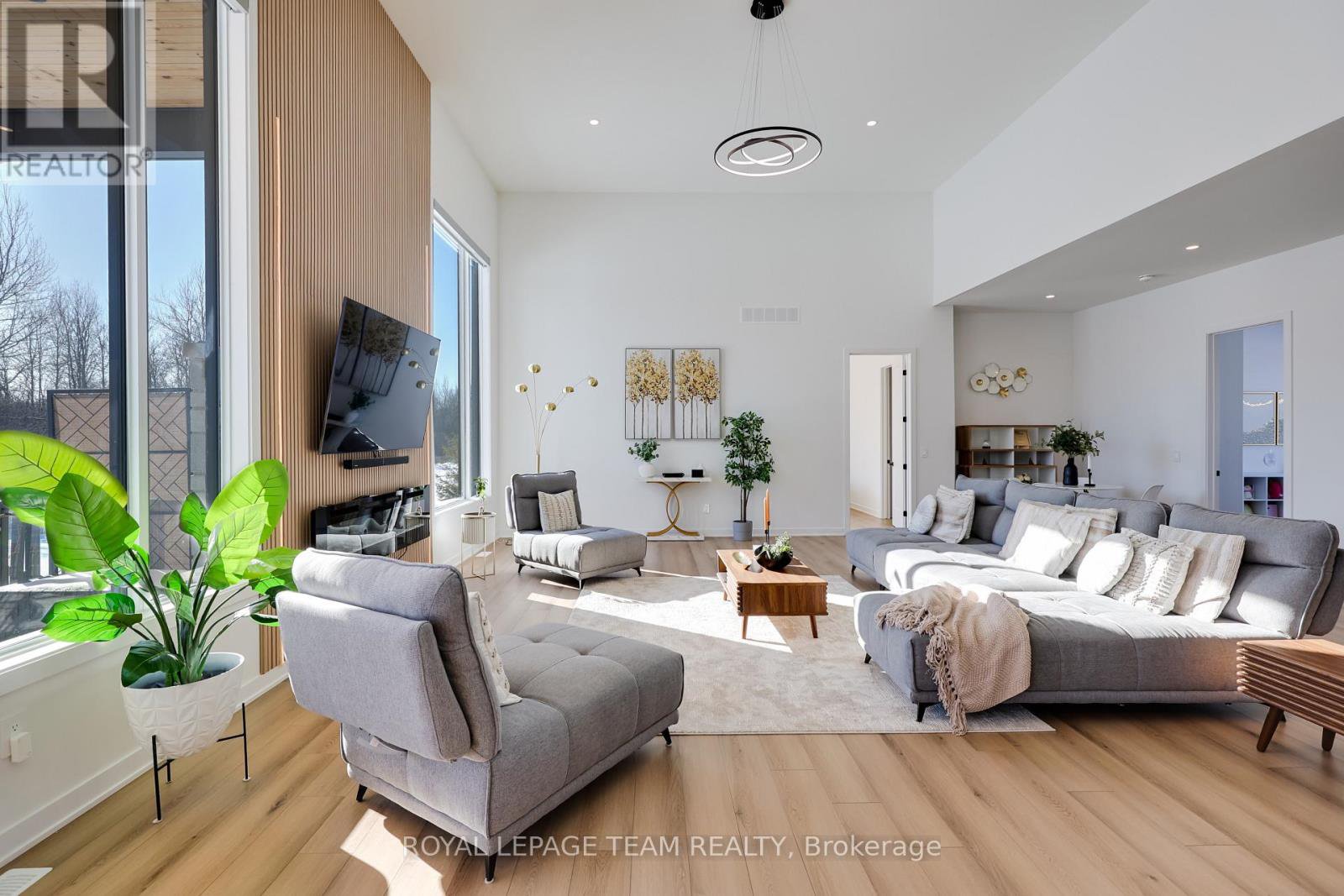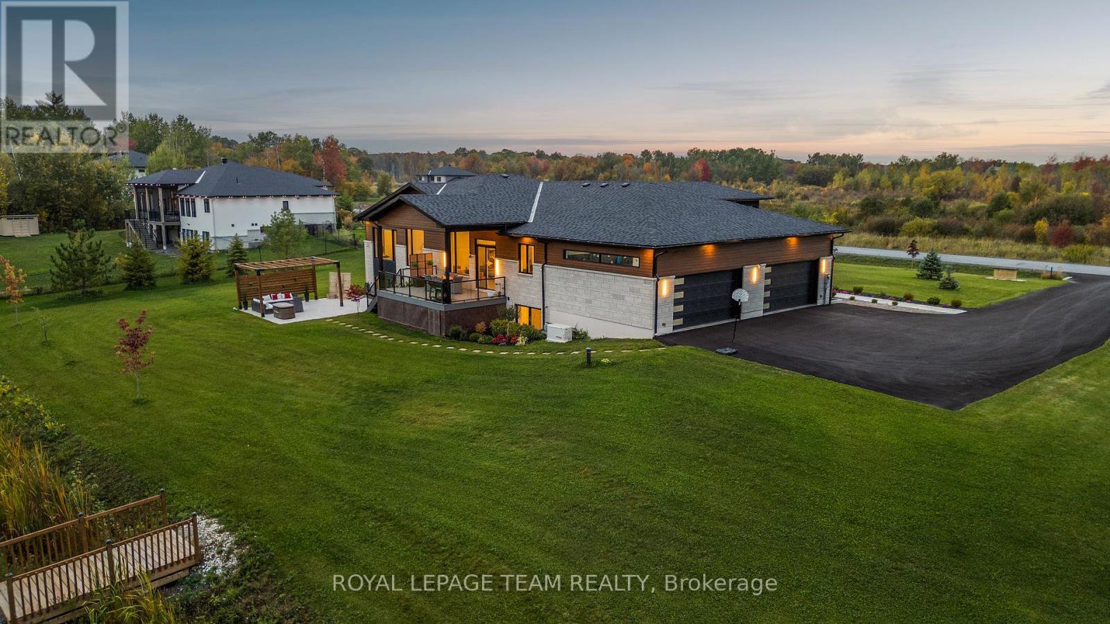 This custom-built luxury bungalow offers over 5600 sq ft of total finished living space, set on a rare estate-sized lot of over 2 acres in an upscale, low-density community. Built in 2023, the home combines modern design with exceptional space and privacy, while remaining conveniently located near major amenities and Ottawa's high-tech employment hub. The thoughtfully designed layout includes 5 bedrooms and 4 bathrooms, with 3 bedrooms on the main level and 2 bedrooms in the lower level, ideal for multi-generational living, flexible family needs, or home office use. Ceiling heights reach up to 15 ft in the foyer and living room, with 10 ft ceilings across the main level, complemented by large black-framed double-pane windows that flood the home with natural light and enhance its architectural presence. The open-concept living area flows seamlessly into a modern kitchen featuring a waterfall quartz island, full-height quartz backsplash, custom soft-close cabinetry, and a premium appliance package. The primary suite offers a private retreat with a spa-inspired ensuite, including a freestanding soaking tub, glass-enclosed rain shower with body jets, and a custom walk-in closet. The lower level extends the living space with a spacious recreation area, electric fireplace (included), dedicated home gym, additional bedrooms, and a full bathroom finished to the same high standard as the main floor. Outdoors, the property features professionally landscaped grounds, interlock patios and walkways, a covered terrace, custom pergola, mature trees, multi-zone irrigation, and architectural exterior lighting. Additional highlights include a 4-car attached garage with epoxy flooring, extensive parking, smart home technology, comprehensive LED lighting, full security system, and electric fireplaces on both levels. This move-in-ready bungalow presents a rare opportunity to enjoy space, privacy, and modern luxury in one of the area's most desirable communities.