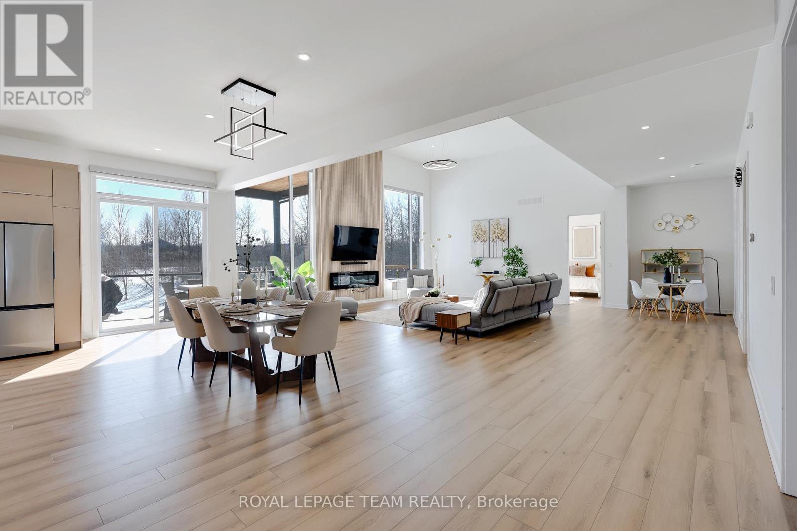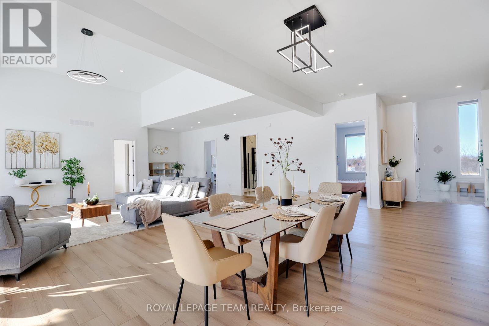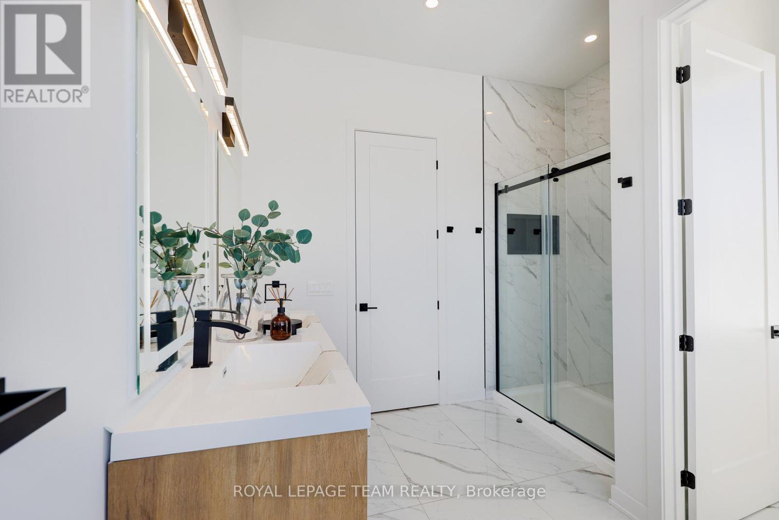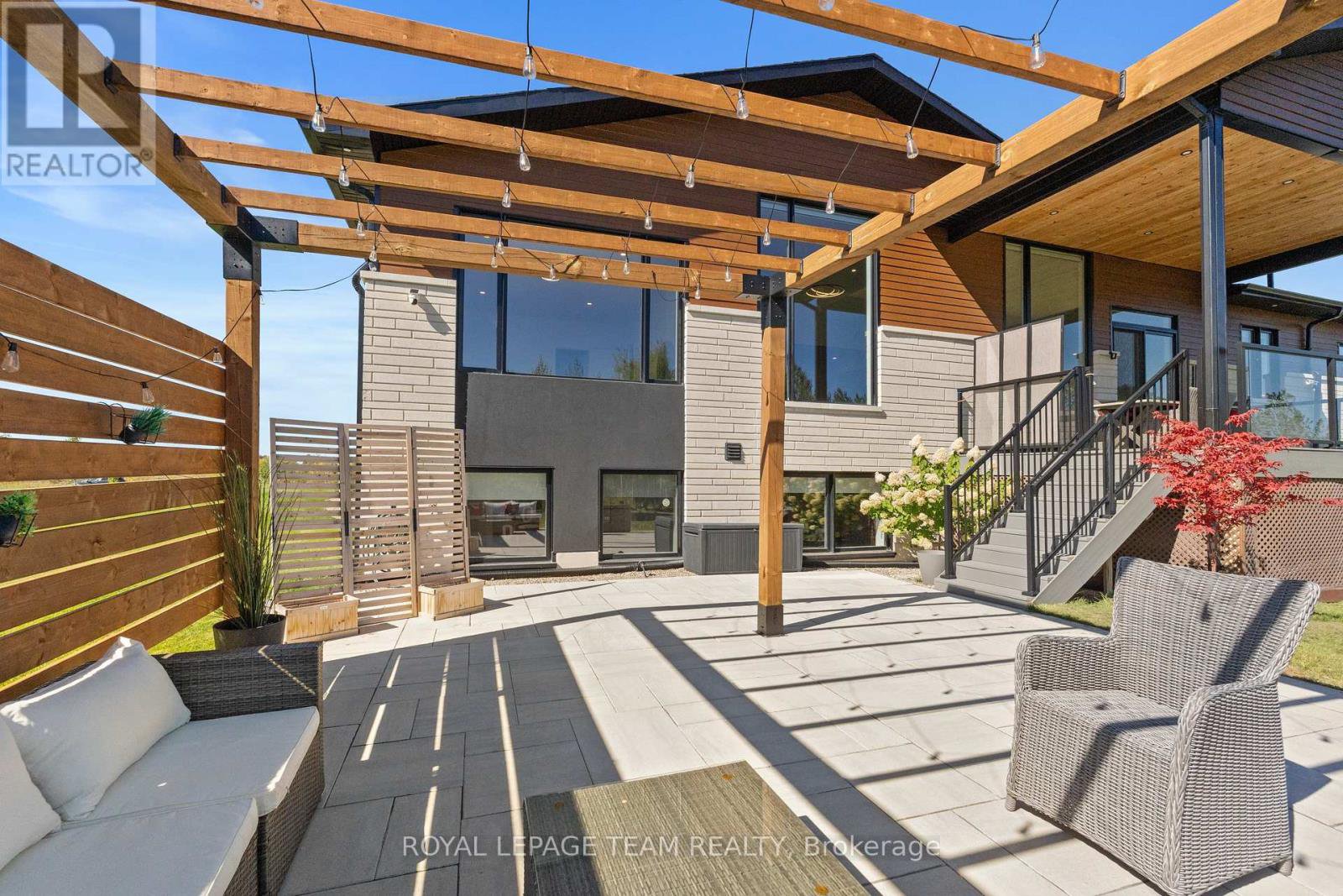 This custom-built luxury bungalow offers over 5600 sq ft of total finished living space, set on a rare estate-sized lot of over 2 acres in an upscale, low-density community. Built in 2023, the home combines modern design with exceptional space and privacy, while remaining conveniently located near major amenities and Ottawa's high-tech employment hub. The thoughtfully designed layout includes 5 bedrooms and 4 bathrooms, with 3 bedrooms on the main level and 2 bedrooms in the lower level, ideal for multi-generational living, flexible family needs, or home office use. Ceiling heights reach up to 15 ft in the foyer and living room, with 10 ft ceilings across the main level, complemented by large black-framed double-pane windows that flood the home with natural light and enhance its architectural presence. The open-concept living area flows seamlessly into a modern kitchen featuring a waterfall quartz island, full-height quartz backsplash, custom soft-close cabinetry, and a premium appliance package. The primary suite offers a private retreat with a spa-inspired ensuite, including a freestanding soaking tub, glass-enclosed rain shower with body jets, and a custom walk-in closet. The lower level extends the living space with a spacious recreation area, electric fireplace (included), dedicated home gym, additional bedrooms, and a full bathroom finished to the same high standard as the main floor. Outdoors, the property features professionally landscaped grounds, interlock patios and walkways, a covered terrace, custom pergola, mature trees, multi-zone irrigation, and architectural exterior lighting. Additional highlights include a 4-car attached garage with epoxy flooring, extensive parking, smart home technology, comprehensive LED lighting, full security system, and electric fireplaces on both levels. This move-in-ready bungalow presents a rare opportunity to enjoy space, privacy, and modern luxury in one of the area's most desirable communities.
