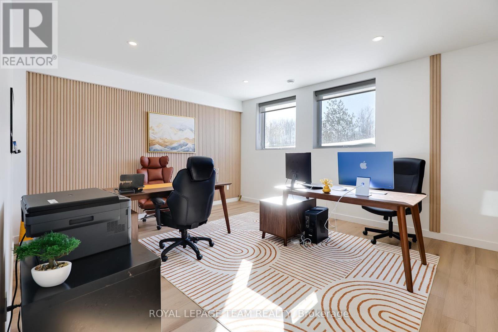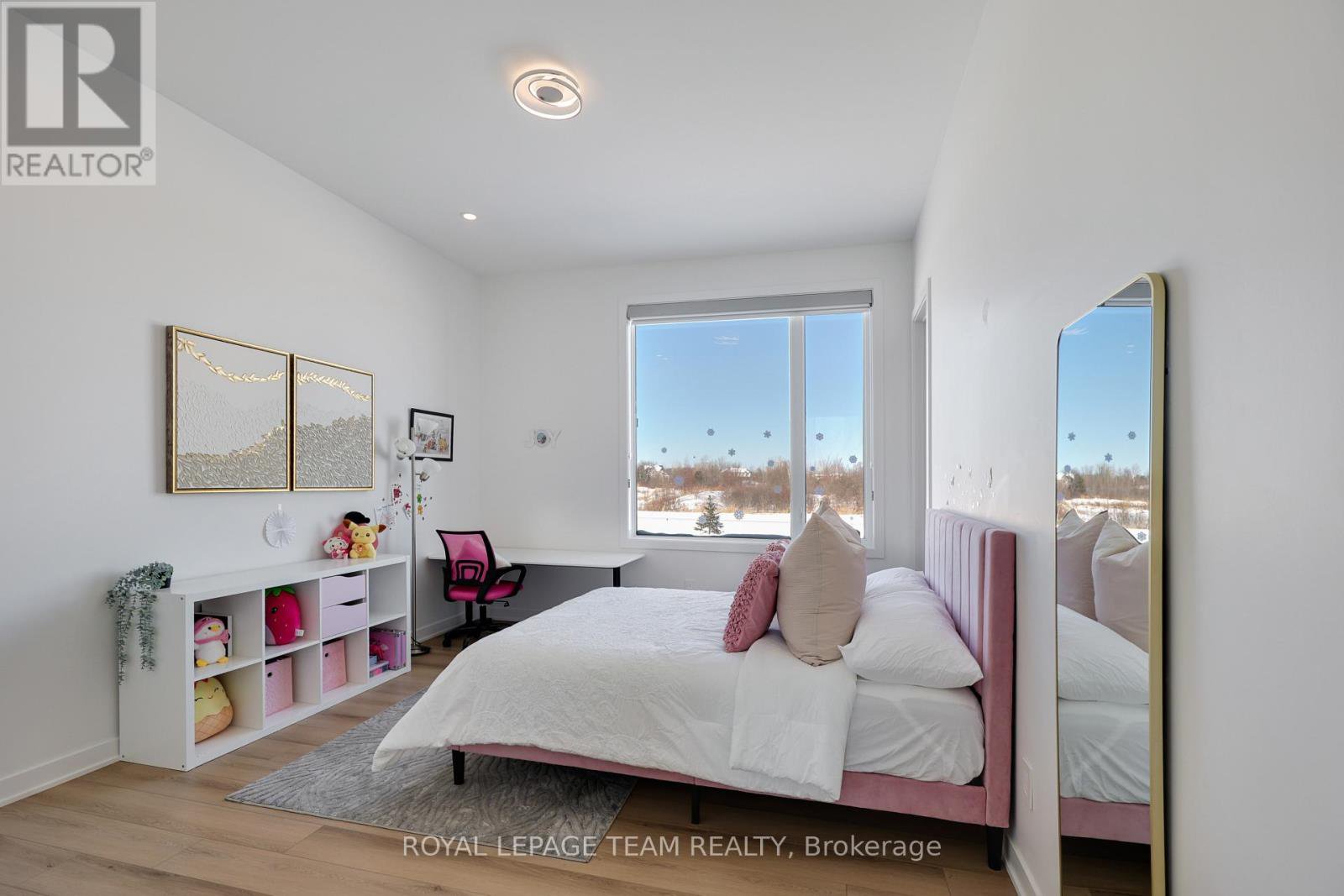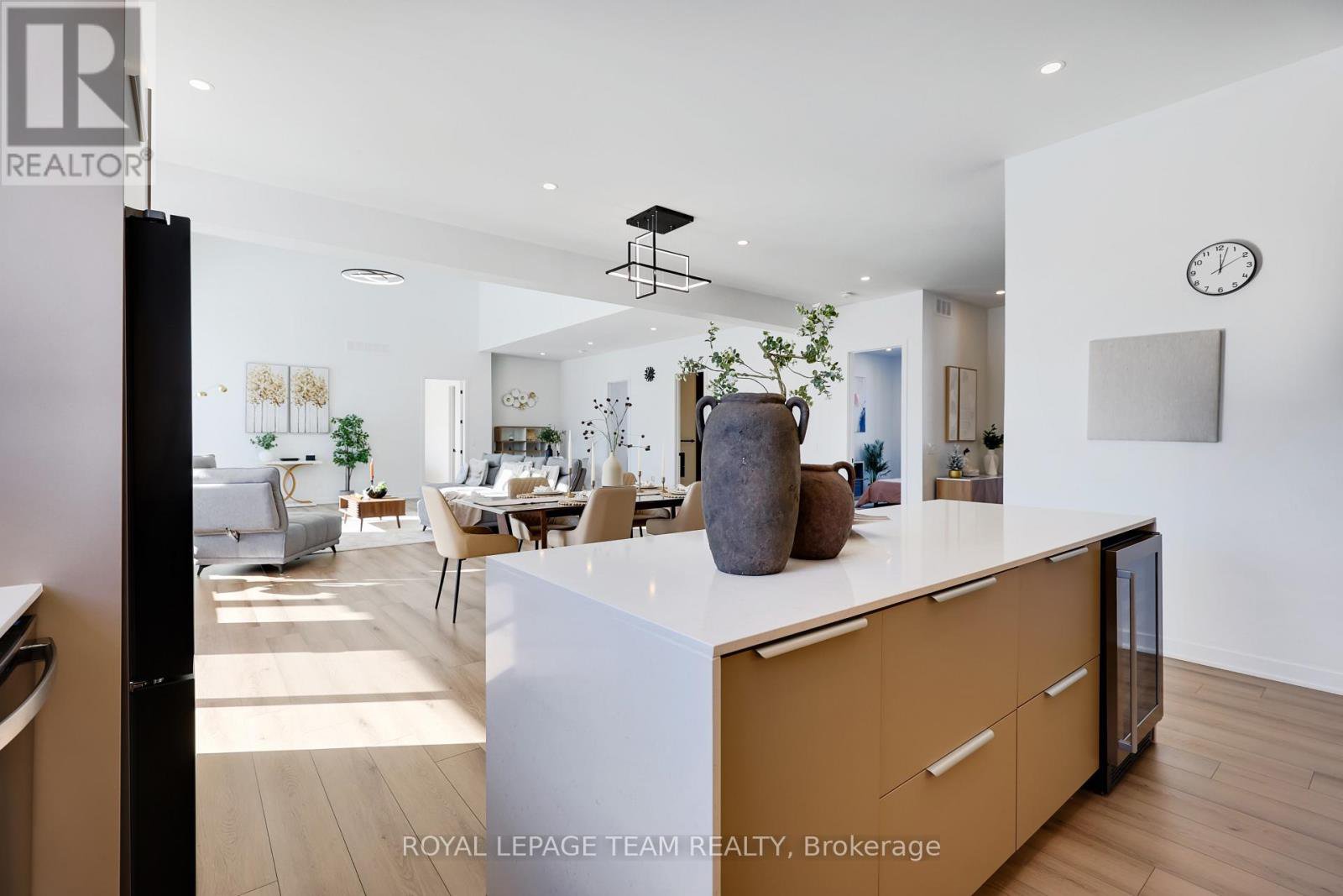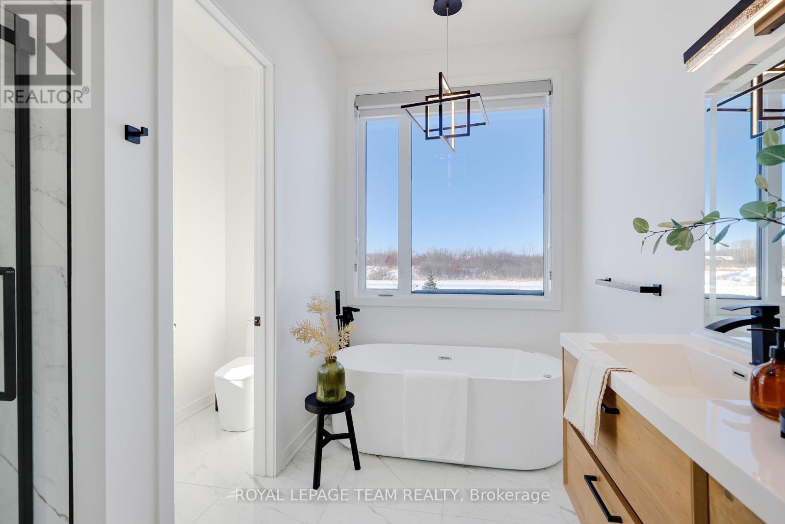 This custom-built luxury bungalow offers over 5600 sq ft of total finished living space, set on a rare estate-sized lot of over 2 acres in an upscale, low-density community. Built in 2023, the home combines modern design with exceptional space and privacy, while remaining conveniently located near major amenities and Ottawa's high-tech employment hub. The thoughtfully designed layout includes 5 bedrooms and 4 bathrooms, with 3 bedrooms on the main level and 2 bedrooms in the lower level, ideal for multi-generational living, flexible family needs, or home office use. Ceiling heights reach up to 15 ft in the foyer and living room, with 10 ft ceilings across the main level, complemented by large black-framed double-pane windows that flood the home with natural light and enhance its architectural presence. The open-concept living area flows seamlessly into a modern kitchen featuring a waterfall quartz island, full-height quartz backsplash, custom soft-close cabinetry, and a premium appliance package. The primary suite offers a private retreat with a spa-inspired ensuite, including a freestanding soaking tub, glass-enclosed rain shower with body jets, and a custom walk-in closet. The lower level extends the living space with a spacious recreation area, electric fireplace (included), dedicated home gym, additional bedrooms, and a full bathroom finished to the same high standard as the main floor. Outdoors, the property features professionally landscaped grounds, interlock patios and walkways, a covered terrace, custom pergola, mature trees, multi-zone irrigation, and architectural exterior lighting. Additional highlights include a 4-car attached garage with epoxy flooring, extensive parking, smart home technology, comprehensive LED lighting, full security system, and electric fireplaces on both levels. This move-in-ready bungalow presents a rare opportunity to enjoy space, privacy, and modern luxury in one of the area's most desirable communities.