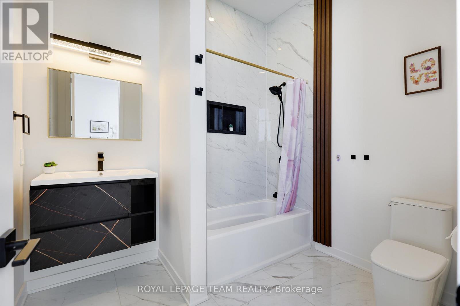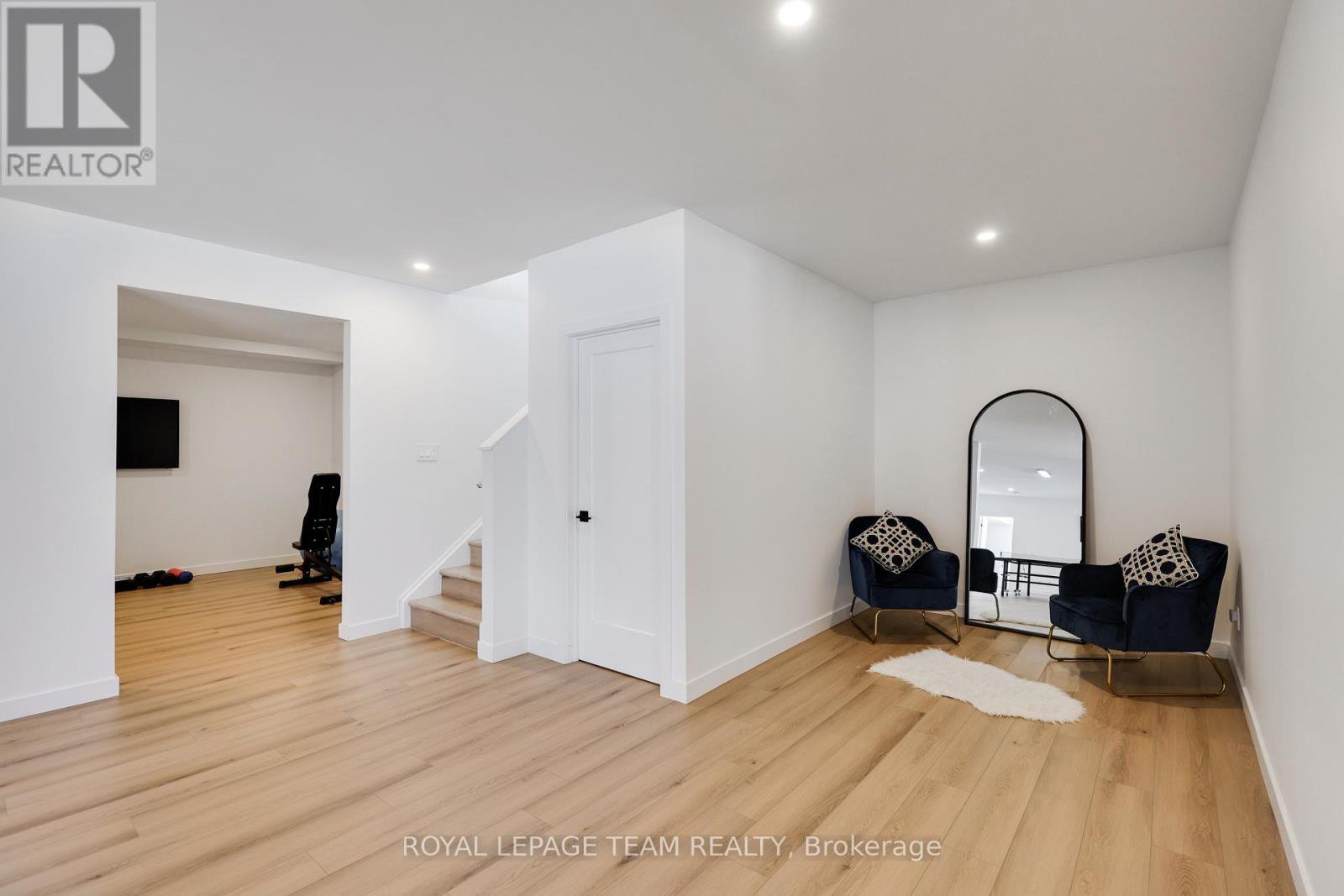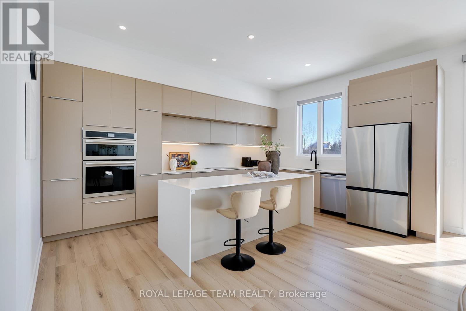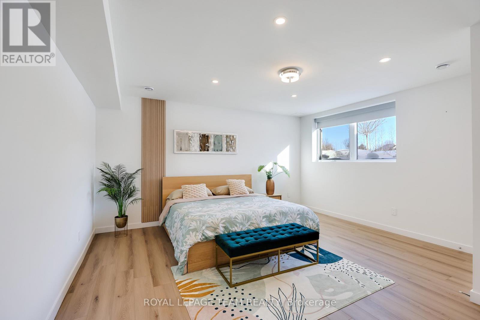 This custom-built luxury bungalow offers over 5600 sq ft of total finished living space, set on a rare estate-sized lot of over 2 acres in an upscale, low-density community. Built in 2023, the home combines modern design with exceptional space and privacy, while remaining conveniently located near major amenities and Ottawa's high-tech employment hub. The thoughtfully designed layout includes 5 bedrooms and 4 bathrooms, with 3 bedrooms on the main level and 2 bedrooms in the lower level, ideal for multi-generational living, flexible family needs, or home office use. Ceiling heights reach up to 15 ft in the foyer and living room, with 10 ft ceilings across the main level, complemented by large black-framed double-pane windows that flood the home with natural light and enhance its architectural presence. The open-concept living area flows seamlessly into a modern kitchen featuring a waterfall quartz island, full-height quartz backsplash, custom soft-close cabinetry, and a premium appliance package. The primary suite offers a private retreat with a spa-inspired ensuite, including a freestanding soaking tub, glass-enclosed rain shower with body jets, and a custom walk-in closet. The lower level extends the living space with a spacious recreation area, electric fireplace (included), dedicated home gym, additional bedrooms, and a full bathroom finished to the same high standard as the main floor. Outdoors, the property features professionally landscaped grounds, interlock patios and walkways, a covered terrace, custom pergola, mature trees, multi-zone irrigation, and architectural exterior lighting. Additional highlights include a 4-car attached garage with epoxy flooring, extensive parking, smart home technology, comprehensive LED lighting, full security system, and electric fireplaces on both levels. This move-in-ready bungalow presents a rare opportunity to enjoy space, privacy, and modern luxury in one of the area's most desirable communities.
