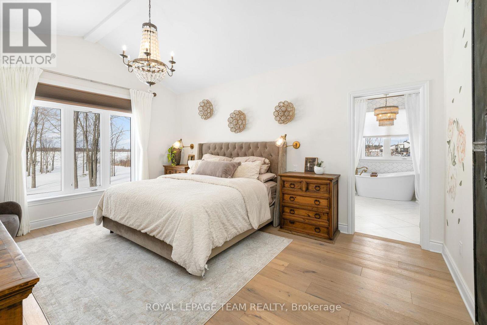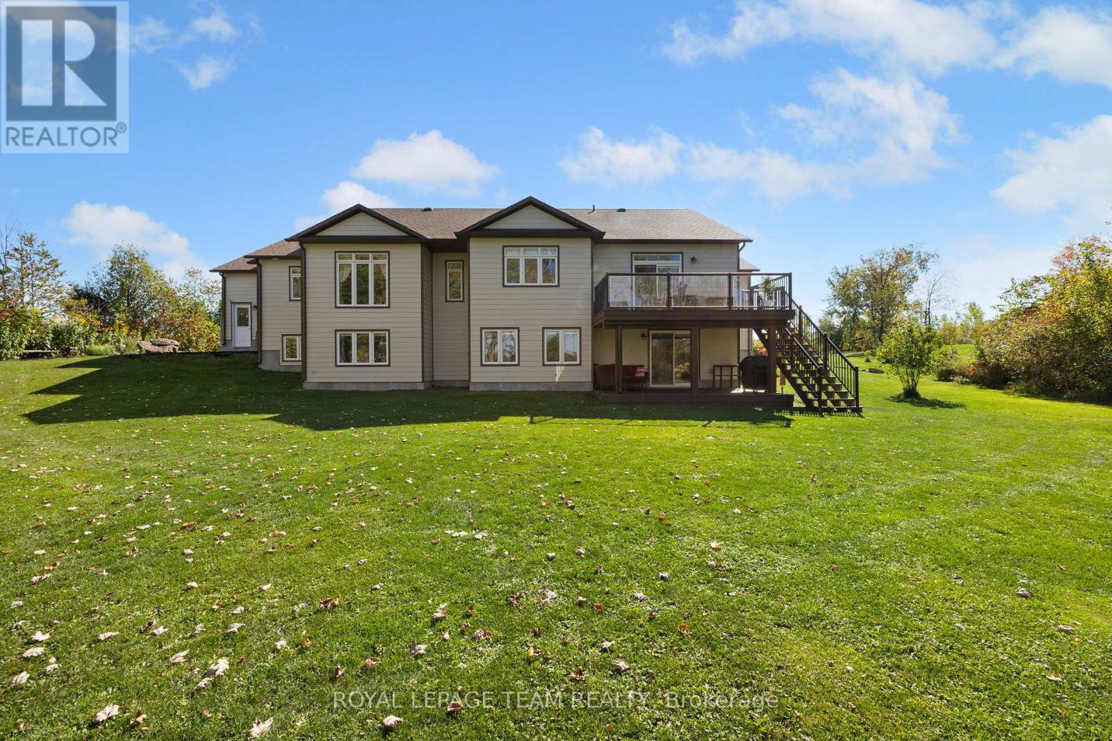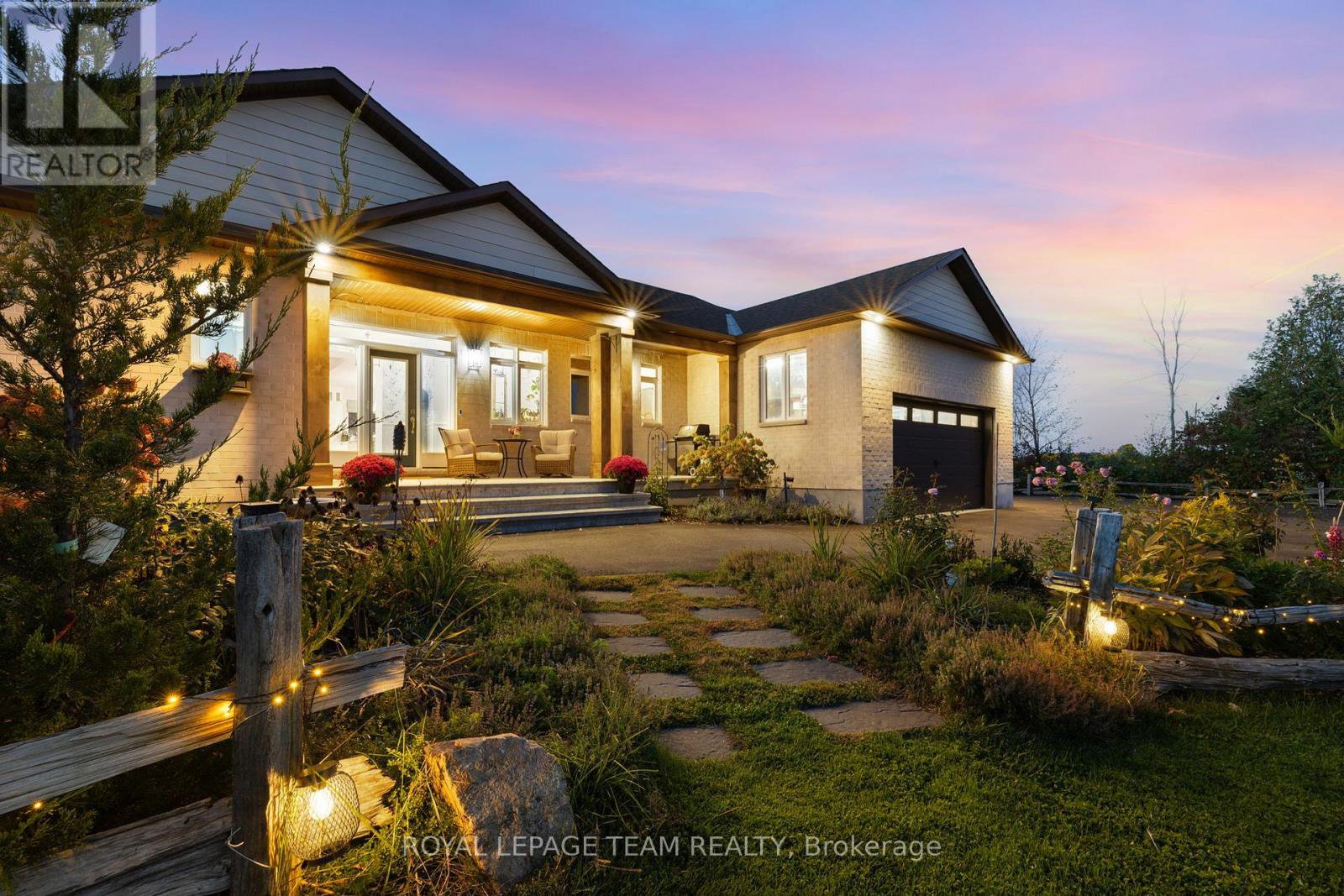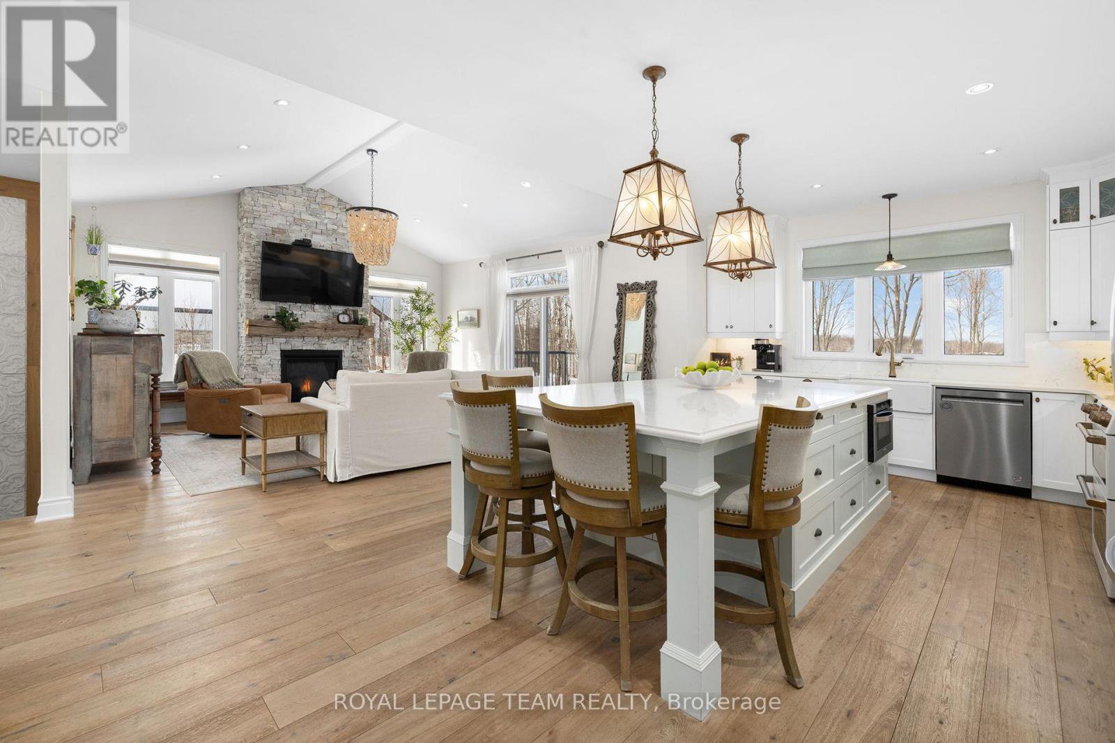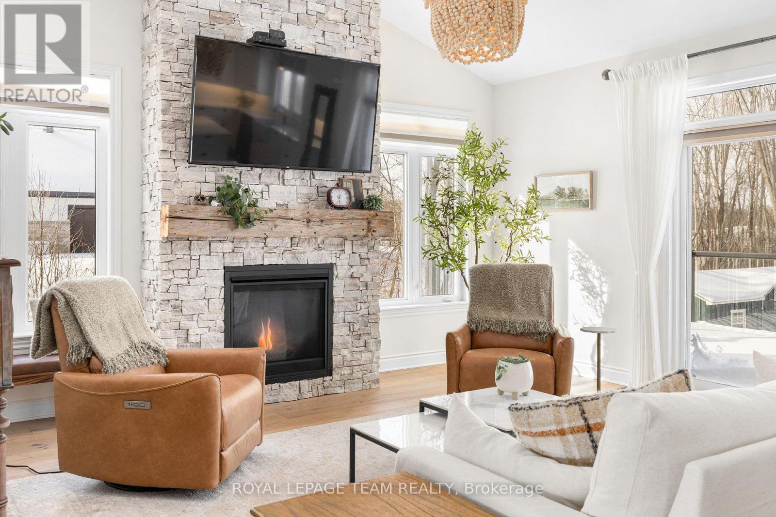 Welcome to 26 Synergy Way, an exceptional custom-built residence located in prestigious March Crest Estates. Nestled on over 2 private, treed acres in rural Kanata and backing onto open farmland, this property offers peaceful surroundings, and sweeping views of the Gatineau Hills. Built in 2018 by Grizzly Homes, this meticulously crafted home blends refined design, thoughtful functionality, and outstanding craftsmanship throughout. The main level features a bright, open-concept layout ideal for both everyday living and entertaining. A chef-inspired kitchen showcases quartz counters & backsplash, extra-tall stacked cabinetry, built-in microwave, pot filler, stainless steel appliances, and an impressive 10' x 5' island with extensive storage and seating. The dining area & vaulted great room offers designer lighting, pot lights, and a striking 12' real stone gas fireplace with reclaimed barn beam mantle. Sliding doors lead to a two-storey TREX composite deck with glass railings, perfect for enjoying panoramic views. Three bedrooms on the main level, including a stunning primary suite with vaulted ceilings, walk-in closet, and award-winning 5-piece ensuite with heated floors. A spacious mudroom/laundry area with built-ins offers convenient access to the heated triple-car garage. Wide-plank brushed white oak hardwood flooring throughout main level. The walk-out lower level includes a fully self-contained 1,600 sq.ft. in-law or nanny suite with two bedrooms, full kitchen, living room with electric fireplace, in-suite laundry, private garage entrance, access to a lower deck & park-like backyard. Additional unfinished space provides excellent storage. Extensive upgrades include an oversized paved driveway, Generlink 12,000W generator, irrigation system, landscaped gardens with mature trees & fruit plantings, firepit, shed, and meticulous ongoing maintenance. Stylish, versatile, and impeccably cared for, this one-of-a-kind home offers an extraordinary lifestyle opportunity.