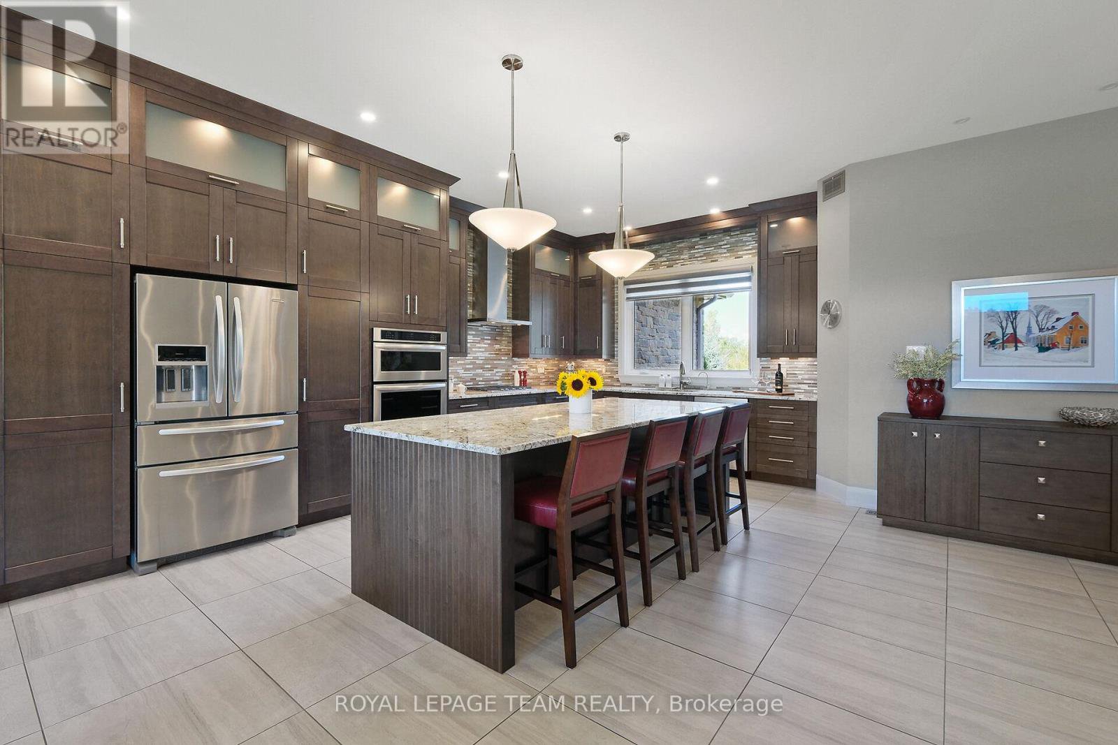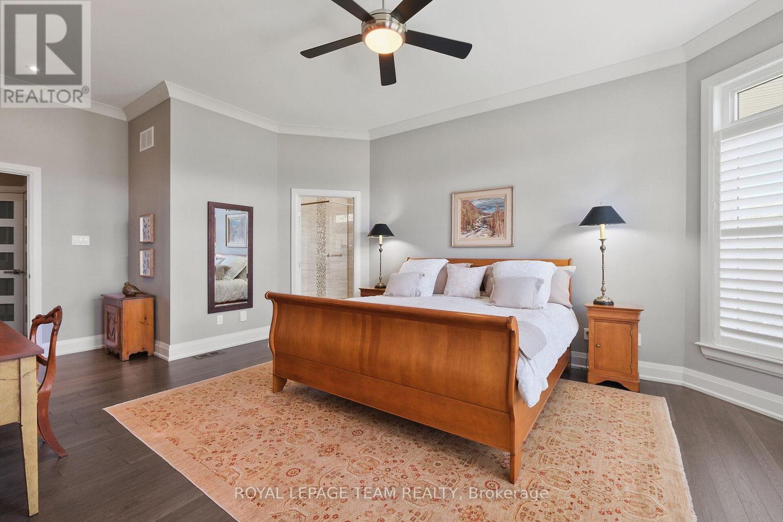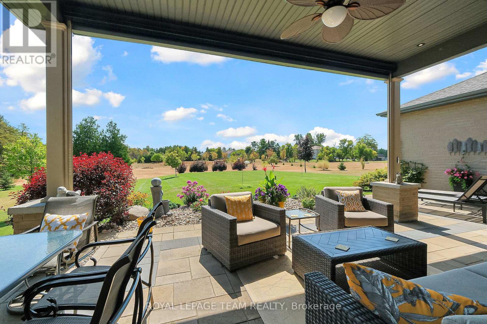 Welcome to this executive-style bungalow offering refined luxury and timeless design on a beautifully landscaped 2+ acre country lot. Impeccably built with a stately stone and brick exterior; this home exudes sophistication with warmth from the moment you arrive. The covered front porch and elegant glass entry open to soaring tall ceilings, rich hand-scraped hardwood floors, and expansive transom windows that flood the home with natural light. The open-concept living space centers around a striking double-sided fireplace and flows seamlessly into the designer Deslaurier kitchen, a true showpiece featuring full-height custom cabinetry, granite countertops, built-in stainless steel appliances, and a grand island with seating for four; perfectly designed for entertaining or for everyday living. The spacious primary suite offers a tranquil retreat with large windows, a walk-in closet, and a spa-inspired ensuite showcasing dual vanities and contemporary finishes. Additional bedrooms and a main-floor office and cozy den provide flexibility for family or remote work. Enjoy the relaxed country air outside under a covered 16ft x 36ft back patio with discreet power sunscreen, while looking out onto manicured lawns, lush gardens, and a completely private backdrop, ideal for gatherings or peaceful evenings as the sun sets. An attached oversized 4-car garage with extra tall insulated doors, direct basement access, a fully paved driveway with decorative lit stone pillars, and impeccable attention to detail complete this exceptional rural property. Experience the perfect blend of luxury, comfort, and craftsmanship in this remarkable bungalow. Truly a home to fall in love with! Welcome Home!