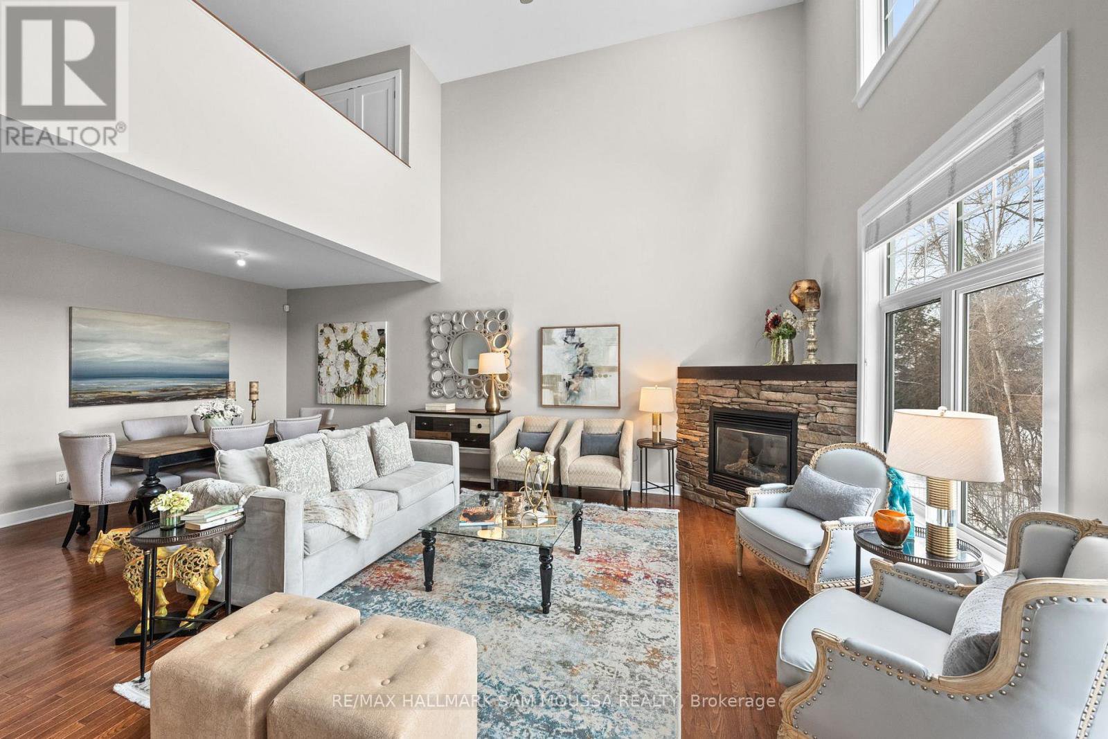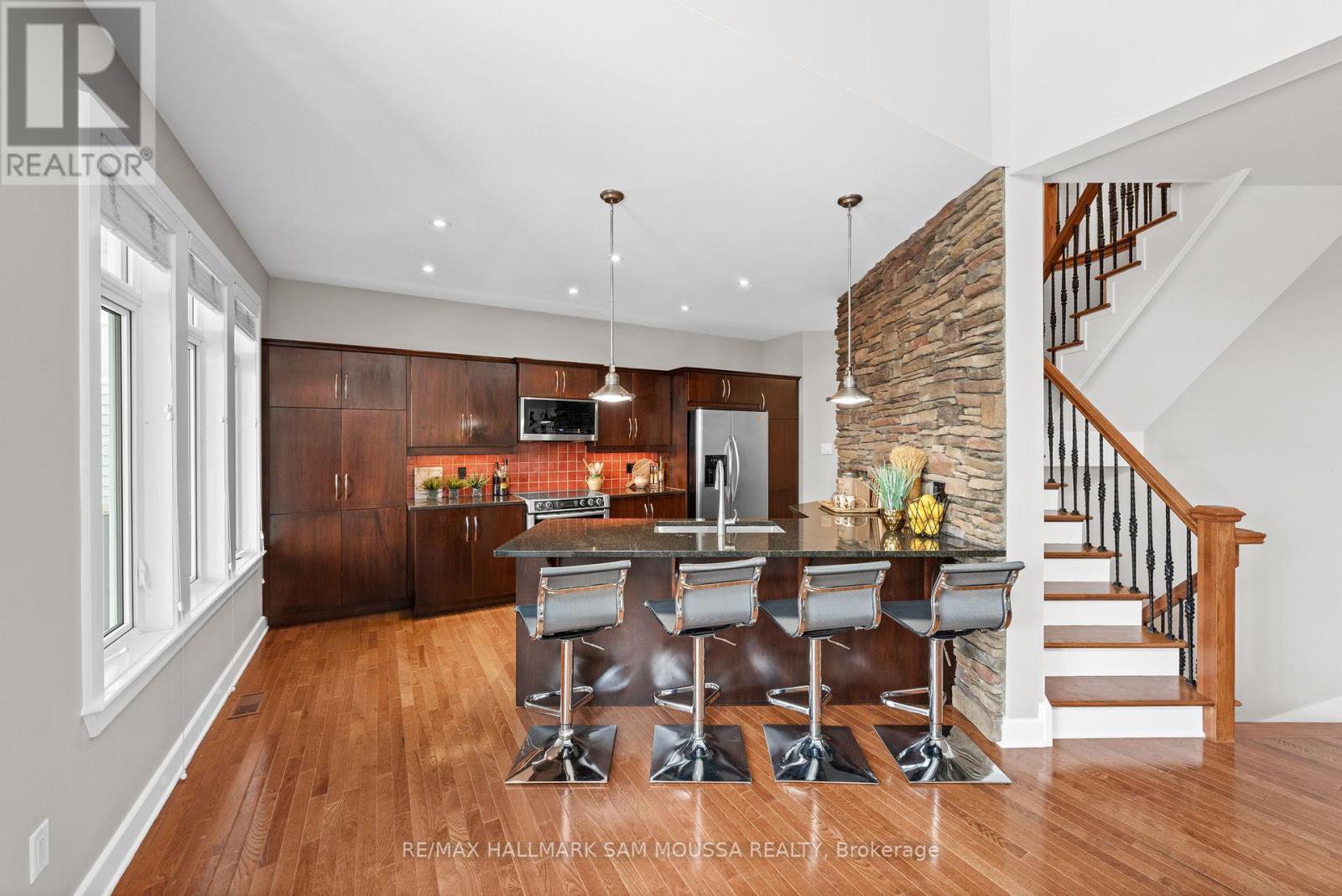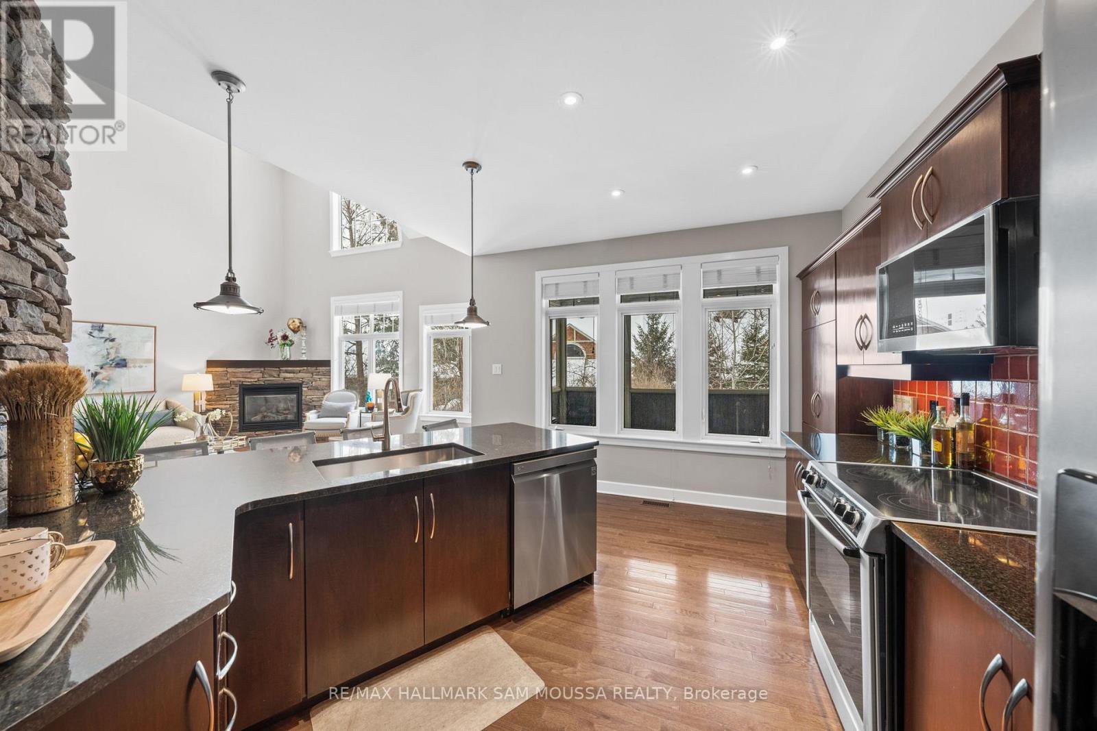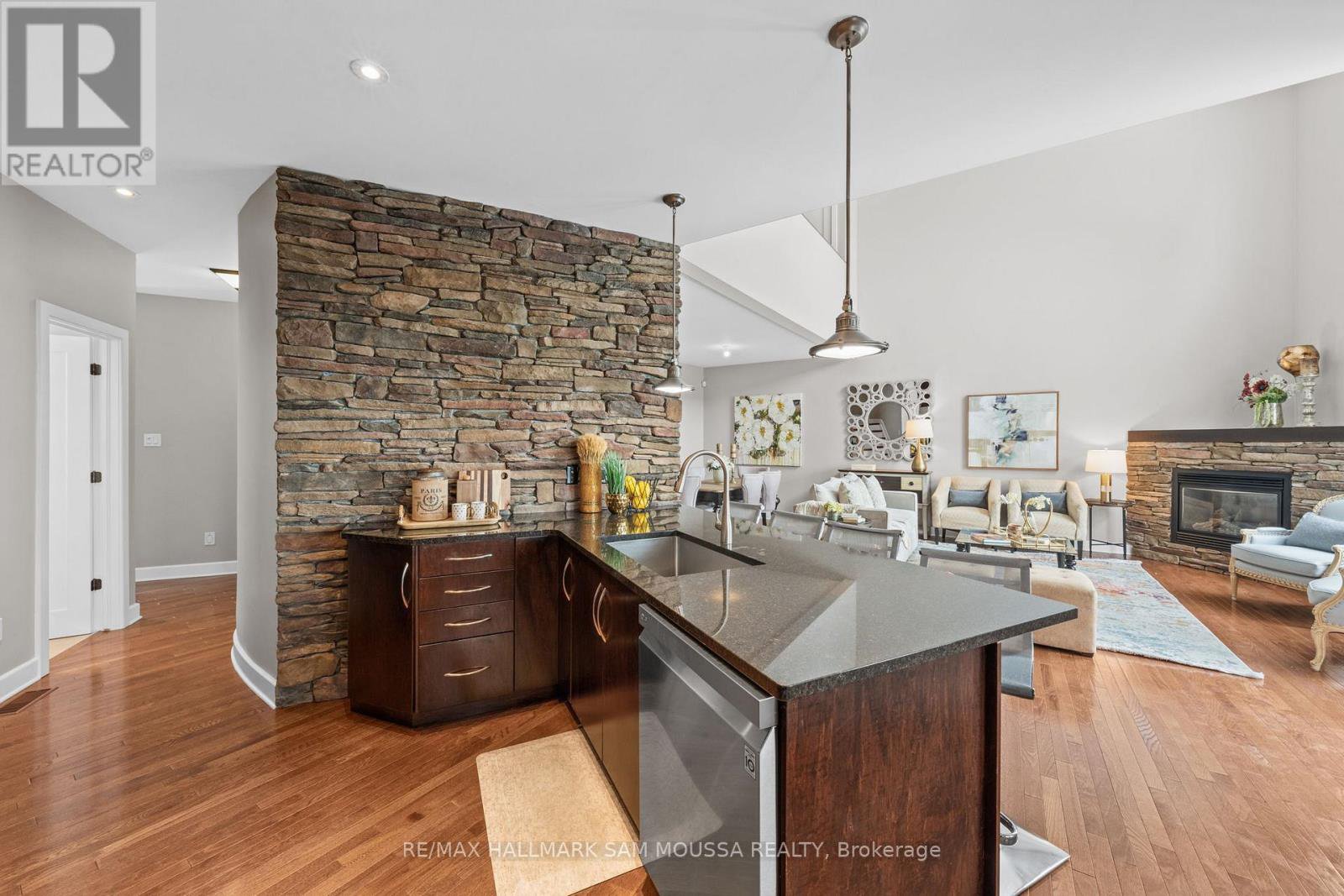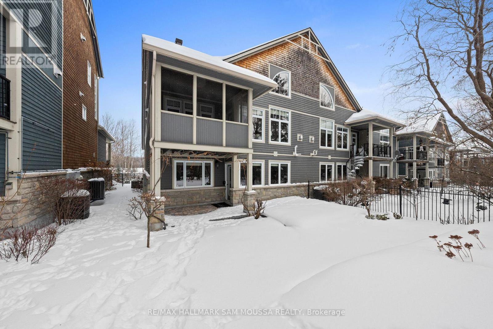 Tucked away in the sought-after enclave of Marshes Village, this beautifully upgraded end-unit townhome offers refined living. Thoughtfully maintained and tastefully enhanced. A foyer with Italian tile sets the tone, opening to open-concept living and dining spaces. Soaring ceilings, expansive windows, and a stone fireplace create a warm atmosphere. The kitchen is a standout, granite counters, stainless steel appliances, and generous cabinetry, all designed with beauty and practicality in mind. A dedicated office, renovated powder room, and laundry area enhance the main level. Off the main living area, a screened-in porch with a gas hookup for BBQ overlooks the back garden. The primary suite is a true retreat, with a large custom walk-in closet and a stunning spa-inspired ensuite. Upstairs, a versatile loft with two closets and a full bath provides flexible living space, ideal for a guest suite or reading nook. Oak hardwood flooring runs throughout, including all three staircases. The finished walk-out lower level offers even more flexibility with a second family room, a spacious bedroom overlooking the garden, a walk-through closet, and a beautifully renovated full bath. This level also features floating oak flooring, adding to the comfort throughout. Outside, professional landscaping enhances the front and rear gardens, a large cedar deck and elegant stone patio provide the perfect backdrop for outdoor entertaining. Recent upgrades include new roof tiles and new wooden front steps. Situated next to the prestigious Marshes Golf Course and just minutes from Kanata Norths high-tech hub, the Brookstreet Hotel, DND, the 417, local shops and restaurants, the Richcraft Rec Complex, and nearby pickleball courts, this home offers a luxurious lifestyle in one of the city's most exclusive communities. Marshes Village Homeowners Association fee is $196/month covers road snow removal, landscaping, general maintenance, audit and insurance with a reserve fund for future needs.