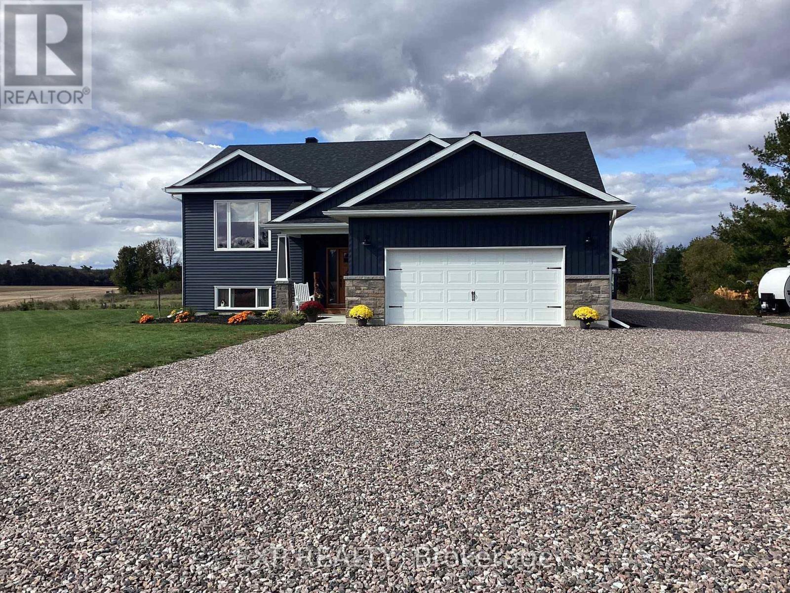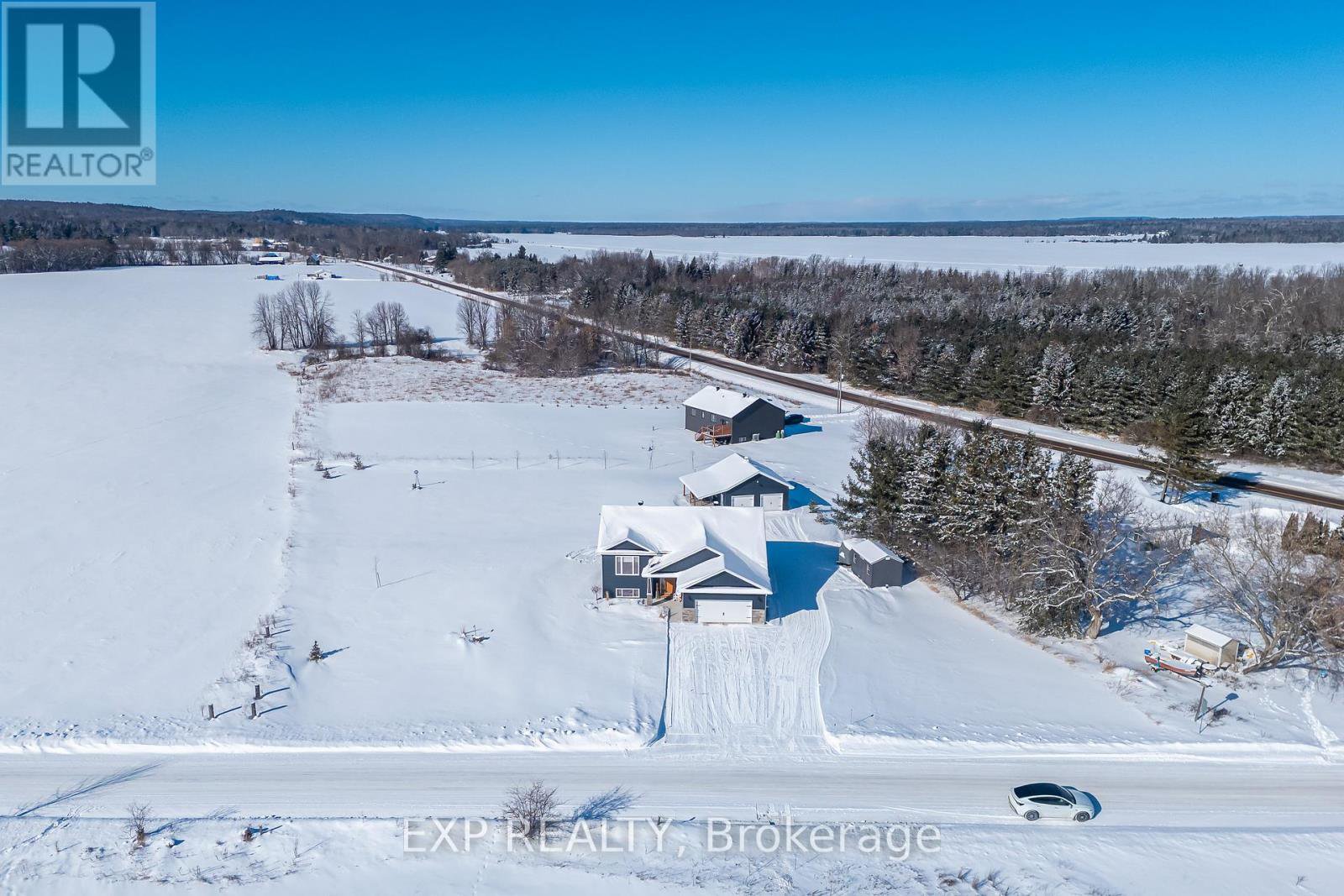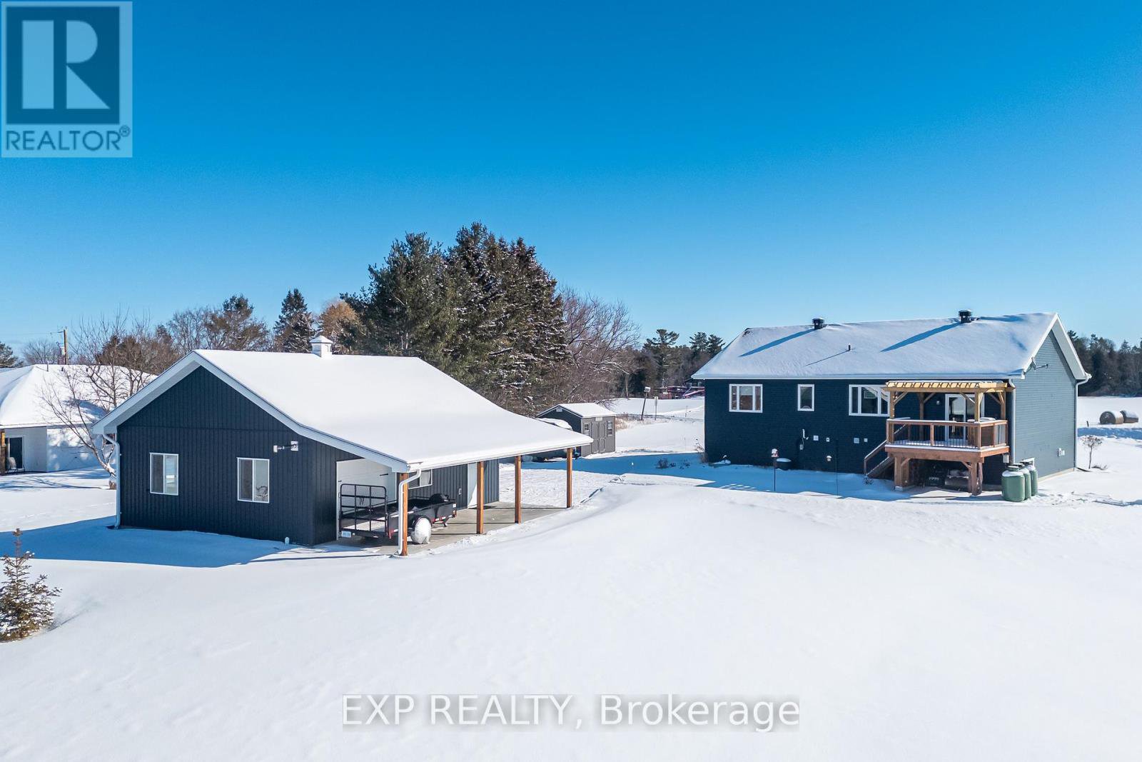 Just minutes to Arnprior, located in Ferguson Beach on the Ottawa River, this exceptionally crafted high bungalow comes with a large workshop only seen in your dreams! It sits on a private, spacious 1.25 acre lot. The home offers approximately 1450 sqft above grade plus a finished basement adding another 1,000+, showcases outstanding attention to detail throughout. The main level features 9 foot ceilings, wide plank luxury vinyl flooring, quartz countertops across the entire level, pot lights, and custom lighting, creating a polished and modern feel. The layout includes four bedrooms and three bathrooms, with one bedroom currently used as a home office or workspace. Both upstairs bathrooms feature his and hers sinks, beautiful vanities and immaculate tile work. Two upstairs back-to-back electric fireplaces add warm and cozy vibes, while the propane fireplace and bar downstairs gives an additional entertainment lounge for the kids and family events. Due to the raised structural approach, the basement is bright with plenty of natural light and offers excellent additional living space for family to spread out in absolute comfort. Outside, enjoy a new deck with a custom pergola, perfect for relaxing or entertaining in the warmer months. The home is equipped with all the bell and whistle systems: water softener and filtration system, new washer and dryer, modern appliances, HRV and GenerLink. What makes this property extra special is the attached heated double garage which is spray foamed and finished with steel cladding. And here's the best for last: The $150,000 detached heated shop which offers 780 sqft of workspace plus a 300 sqft lean to for summer parties and relaxing, complete with running water, floor drains, wiring for welding, massive tube heater and 3 insulated bay doors! A 12 x 16 hickory shed with electricity provides even more storage, making this property ideal for those seeking space, functionality, and quality craftsmanship in a peaceful rural setting.