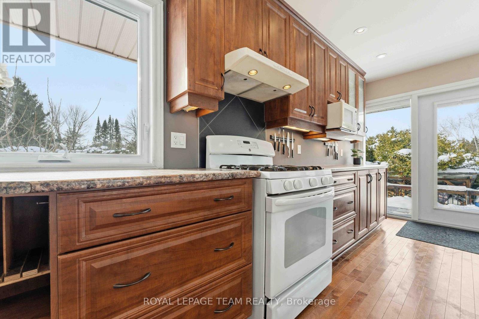 Welcome to this beautifully updated bungalow in the heart of the Village of Osgoode! Ideally located just steps from local amenities in a warm, family-friendly community, this home sits on an impressive 100' x 151' lot offering space, privacy, and natural beauty. Designed with comfort and entertaining in mind, the bright open-concept layout showcases rich hardwood floors and a custom kitchen complete with a central island and functional breakfast bar. The spacious living room features a cozy woodstove insert fireplace, providing incredible warmth and ambiance on cold winter nights.The main level offers three generously sized bedrooms with hardwood flooring and a beautifully upgraded 5-piece bathroom. Downstairs, the fully finished basement expands your living space with a large recreation room, additional 4th bedroom, updated 3-piece bathroom with heated floors, and a generous storage/utility room with laundry. Step outside to your own park-like retreat. Enjoy breathtaking sunsets from the custom deck, mature trees, interlock front walkway with pond, a large custom shed, playhouse with electricity, and a gravel driveway with ample parking. This one-of-a-kind property blends thoughtful updates, practical living space, and serene outdoor charm - all within walking distance to town amenities. Welcome home.