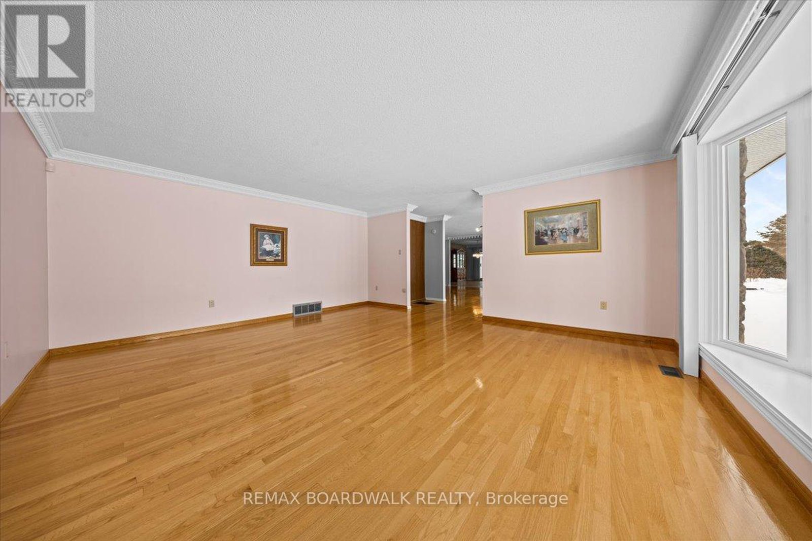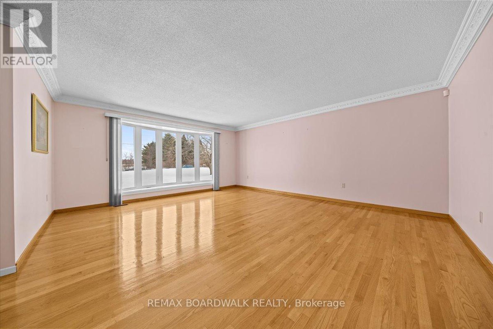 Custom-built all-brick walkout bungalow with in-law suite potential and detached 3-bay heated garage/workshop both with 200-amp service on approximately 52 acres. The main floor features bright, open living spaces with hardwood flooring, crown moulding and bay windows with loads of natural lighting. Eat-in kitchen features wall oven, quartz countertops, undermount sink, breakfast bar, and plenty of cupboard and cabinet space. Main level laundry room, wide hallways, deep closets, and a spacious 4 pc main bathroom. Bedroom wing features three generously sized bedrooms each complemented by serene rural views. Separate storage closet. The fully finished walkout basement offers two additional bedrooms, a full kitchen, eating area, large rec room, office, full bathroom, and a wet bar perfect for entertaining. Separate entrance and lower-level garage, this space is ideal for multigenerational living, guests, or income potential. Vehicle and hobby enthusiasts will appreciate the comprehensive garage setup. Heated upper garage with direct home access, carport with patio door access to kitchen. Detached 3-bay heated garage/workshop with separate 200-amp service, designed to accommodate vehicles, projects, or storage. Elevated deck, expansive outdoor space, and the tranquil rural setting extend the home's living experience, offering privacy, leisure, and room to enjoy. All this is just minutes from Boundary Rd. and the 417, with big box amenities only 15 minutes away. Appliances are considered to be in an as-is / where-is condition. Rogers Fiber available. 24 hour irrevocable on all offers.