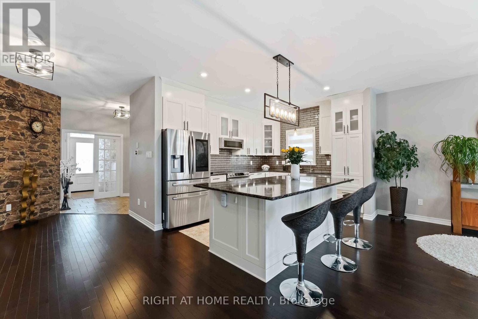 Stunning 2+1-bedroom, 3-full-bathroom Tamarack-built bungalow offers over 3,000 sq. ft. of beautifully finished living space, blending timeless elegance with everyday comfort. Perfectly positioned in the heart of Stittsville, this home sits on an exceptional oversized, fenced pie-shaped lot with over 10,000 sq. ft., complete with a lush garden, fruit trees, and an irrigation system- your own private backyard retreat. Step into the inviting foyer. The open-concept gourmet kitchen featuring high-end SS appliances, a large centre island, quartz countertops, and an abundance of cabinetry-ideal for both entertaining and daily living. The sun-filled living and dining area boasts 9-foot ceilings, rich hardwood flooring, a cozy gas fireplace, and oversized windows that flood the space with natural light. The primary suite offers a walk-in closet and a luxurious 5-piece en-suite. A second versatile bedroom on the main level is perfect as a home office or guest room, complemented by main-floor laundry and a full bathroom. Downstairs, the fully finished lower level impresses with a massive family room anchored by a second fireplace, an additional bedroom, a full bathroom, a dedicated gym area, and ample storage space. This home delivers a rare blend of space, luxury, and lifestyle. Opportunities like this don't come often in Stittsville-this is more than a home, it's the one you've been waiting for.