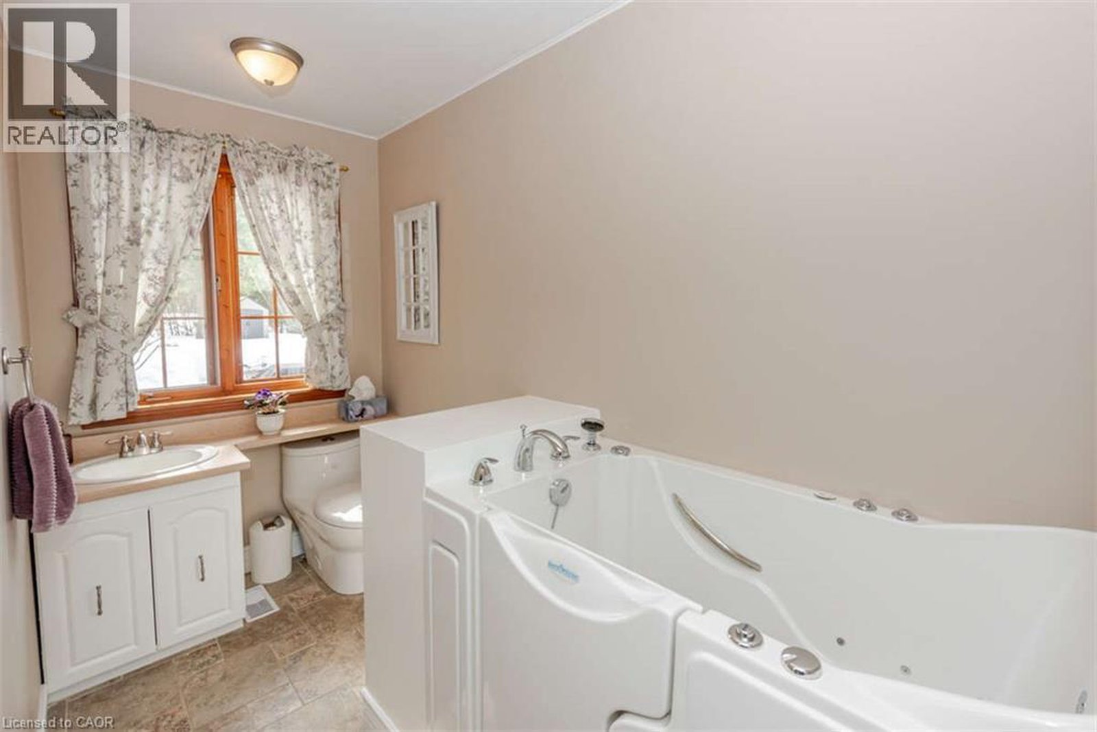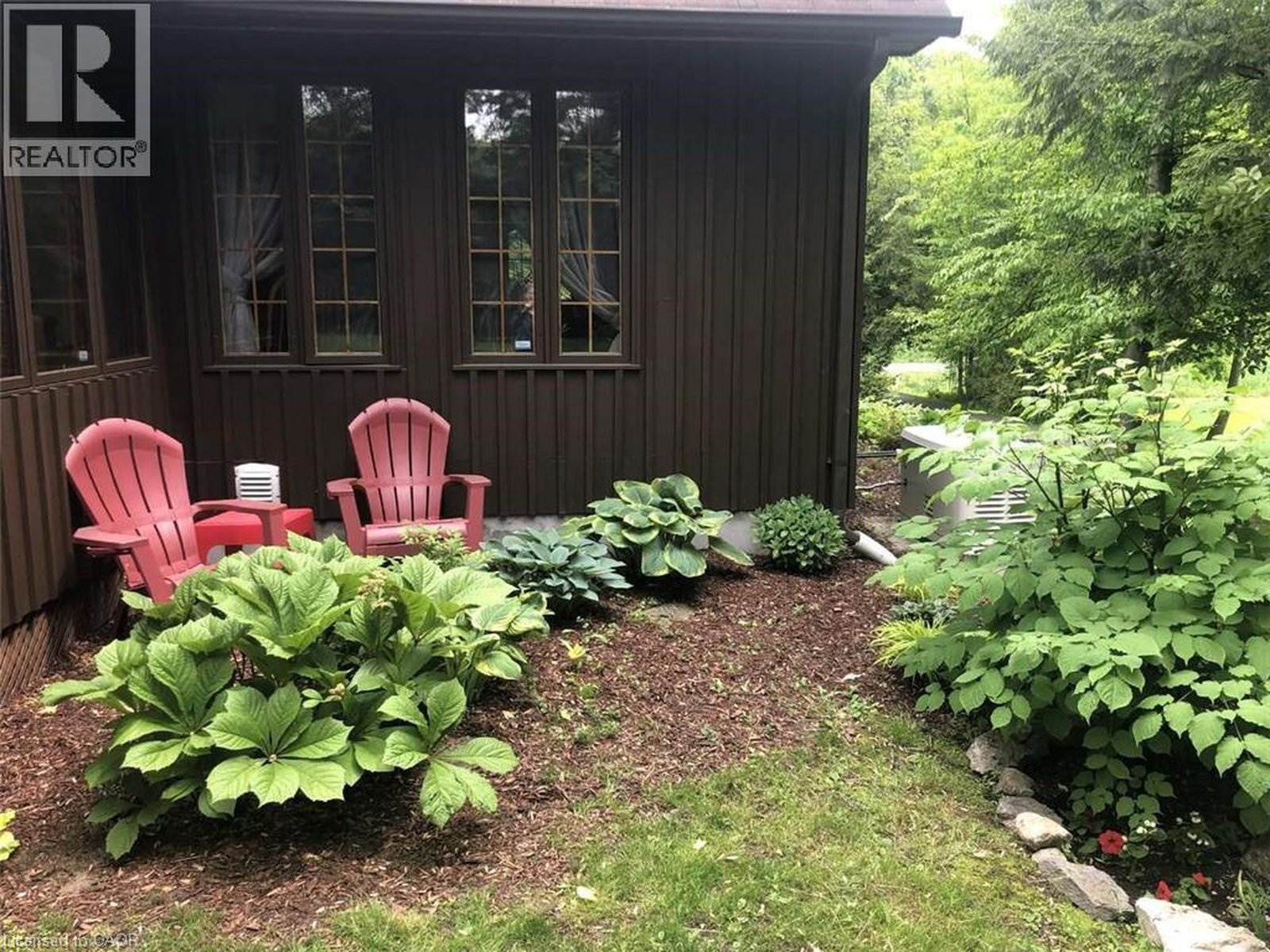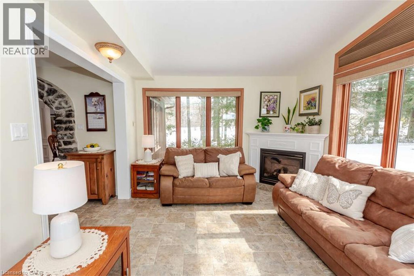 For more info on this property, please click the Brochure button. This charming custom-built Canadiana-style home offers peaceful country living on a beautifully treed, low-maintenance half-acre lot, with no front neighbours and just 10 minutes from all essential amenities and the hospital. The home features a freshly stained (2024) stone façade and board-and-batten wood siding. Elegant stonework flows from the driveway to the front entrance and into the backyard patio, which includes a fire pit, hot tub hookup, and natural gas line for a BBQ. Mature perennial gardens surround the home, adding colour and charm year-round. Inside, rich hardwood floors span the main and upper levels. The living room features a cozy wood-burning fireplace and opens into the dining area. A beautiful stone archway connects the dining space to the kitchen, which offers granite countertops and ample cabinet space. At the rear of the home, the sun-filled solarium provides a peaceful retreat with large windows overlooking the private yard and a natural gas fireplace for comfort. A den with Murphy bed sits adjacent to a full bathroom with a walk-in tub, making the main level ideal for guests or multigenerational living. Upstairs, a lovely hardwood staircase leads to three spacious bedrooms, including a generous primary suite with a walk-in closet. A 5-piece bathroom with in-suite laundry completes the upper floor. The finished basement features a family room with electric fireplace and surround sound, a bathroom with shower, cold storage, and a cedar closet. The attached single-car garage offers direct home access. Inclusions: Kitchen and laundry appliances, Murphy bed, drapes, and blinds. Extras: Bell Fibe, Generac generator, central vacuum, top-tier water system (2022), furnace (2021), AC, hot water tank (2021), well pump (2023), backup sump (2024), vinyl flooring (2023). A rare blend of rural charm and modern convenience.