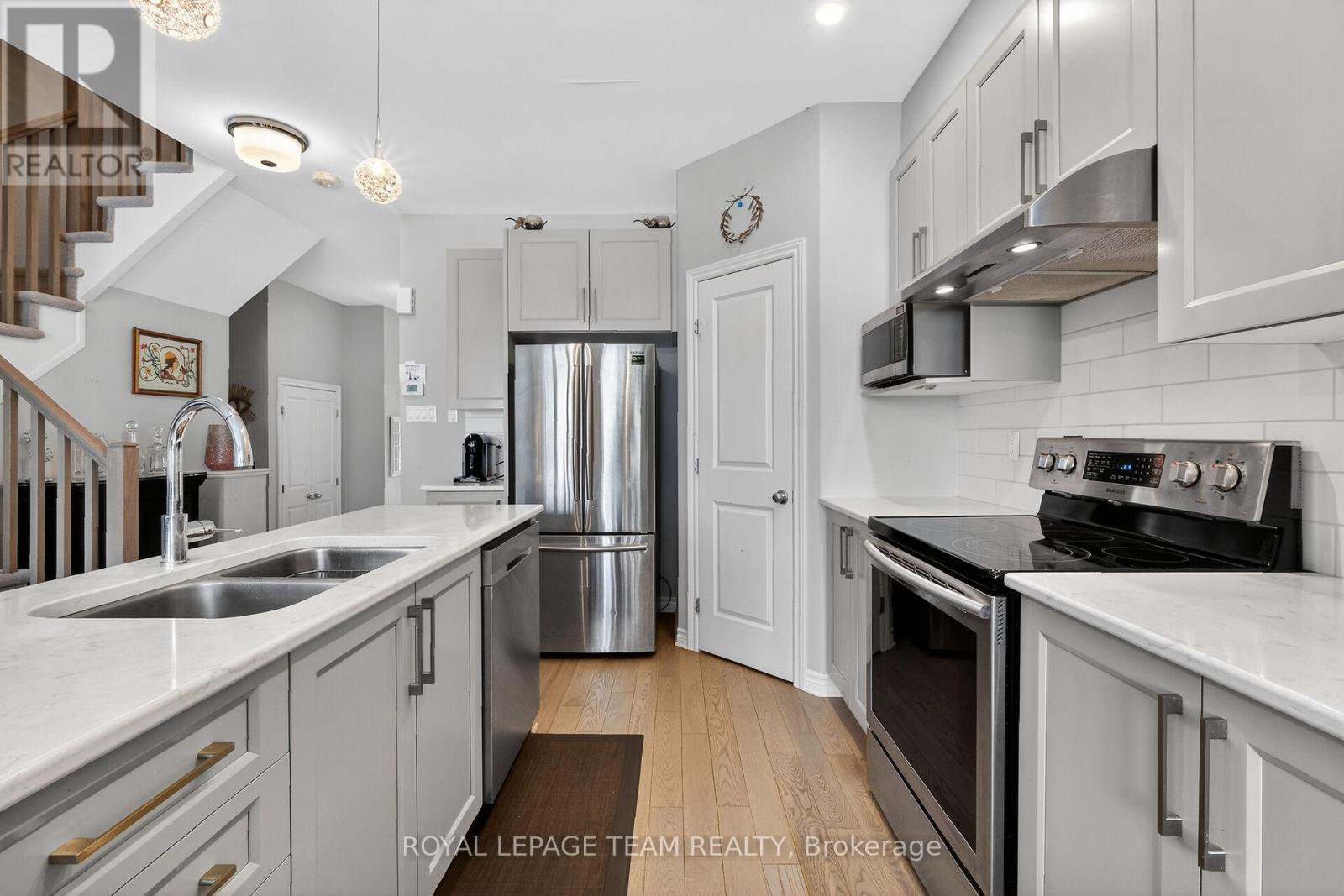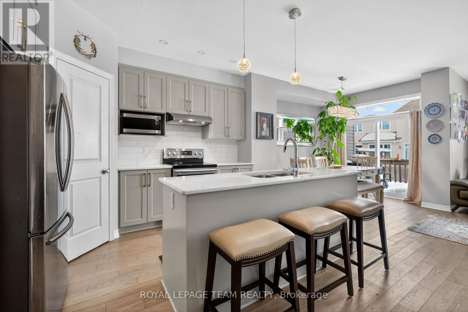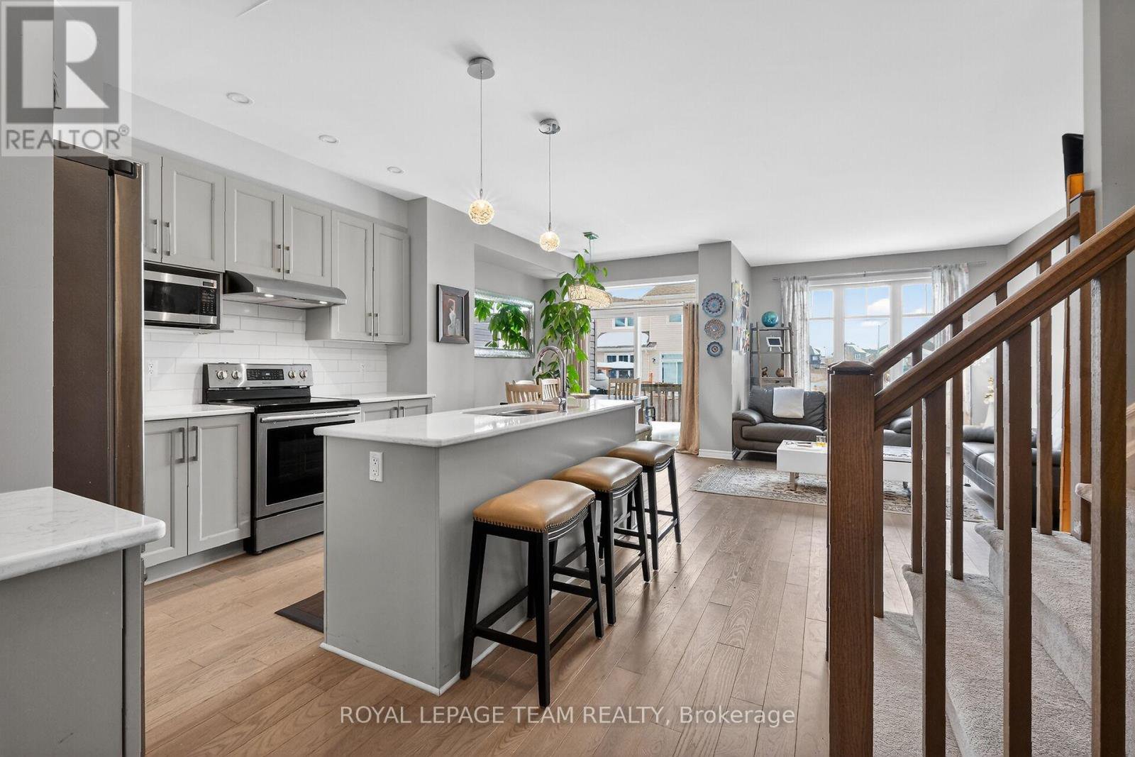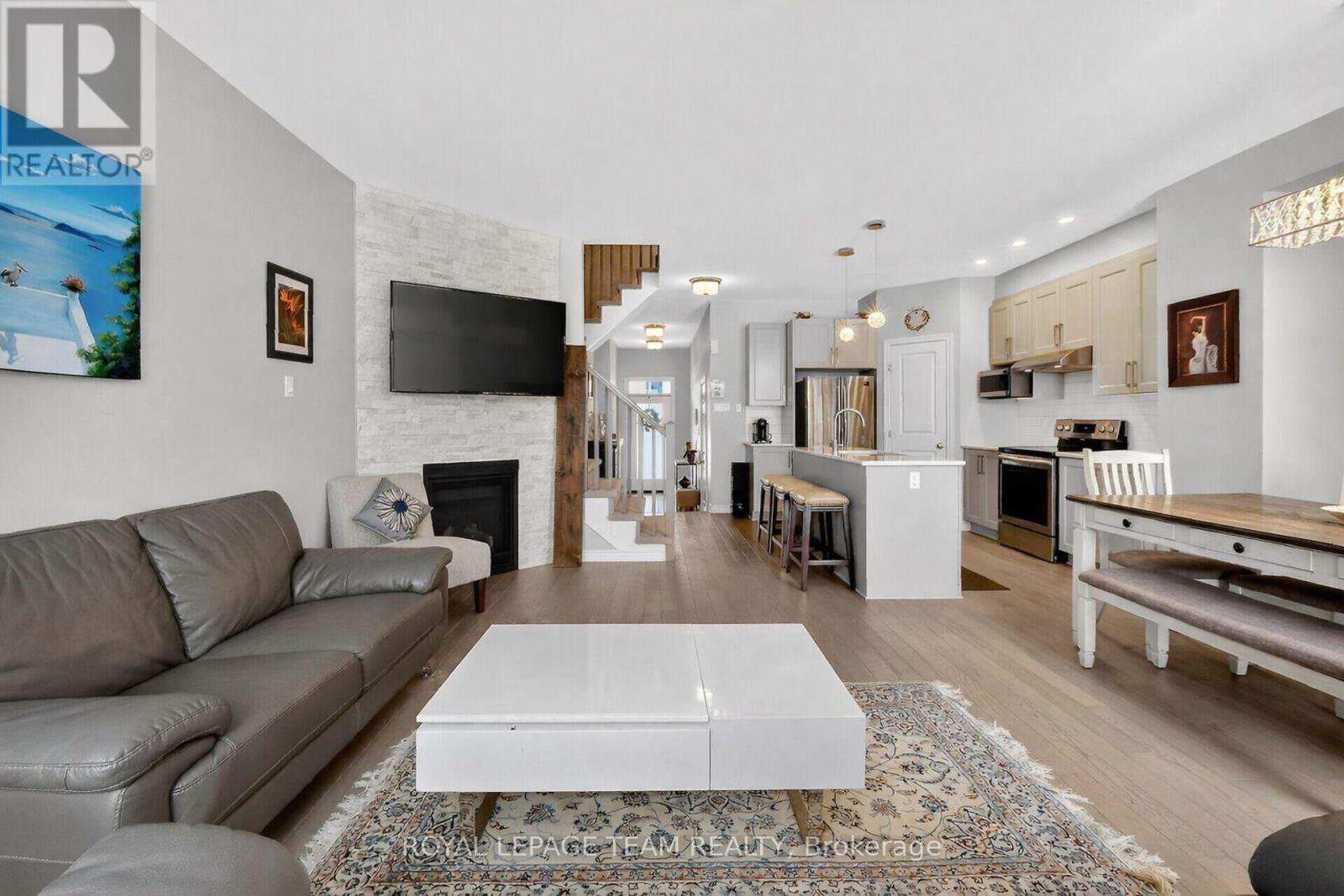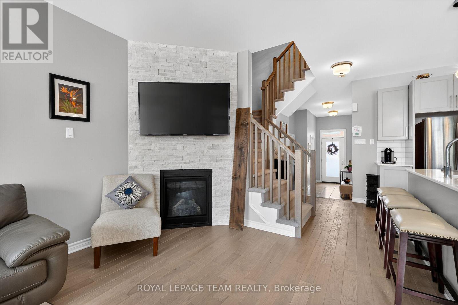Welcome to the beautifully maintained 3 bedroom, 2.5 bath townhome located in the vibrant and family friendly community of Findlay Creek! The chef-inspired kitchen features quartz countertops, ample cabinetry, and generous prep space-ideal for hosting family and friends. Hardwood flooring flows throughout the main level, complimented by a cozy fireplace that creates a warm and inviting atmosphere. Spacious eating area can accommodate a large table and chairs. On the second level, you will find 3 spacious bedrooms, including a well-appointed primary retreat with ensuite bath with separate tub and shower. Two other well sized bedrooms, 4 pc main bath and 2nd floor laundry room. The lower level is spacious with a family room and also an area for your work-out equipment. Step outside to the meticulously maintained yard-hours spent on creating the perfect lawn, offering a beautiful outdoor space to relax and enjoy. Located just steps to parks, schools, shopping, restaurants and transit, this home truly offers the best of community living. An exceptional opportunity in one of Ottawa's most desirable neighbourhoods-perfect for families, empty nesters, and first time buyers. Upgrades include: hardwood floors, fireplace and quartz counters.
