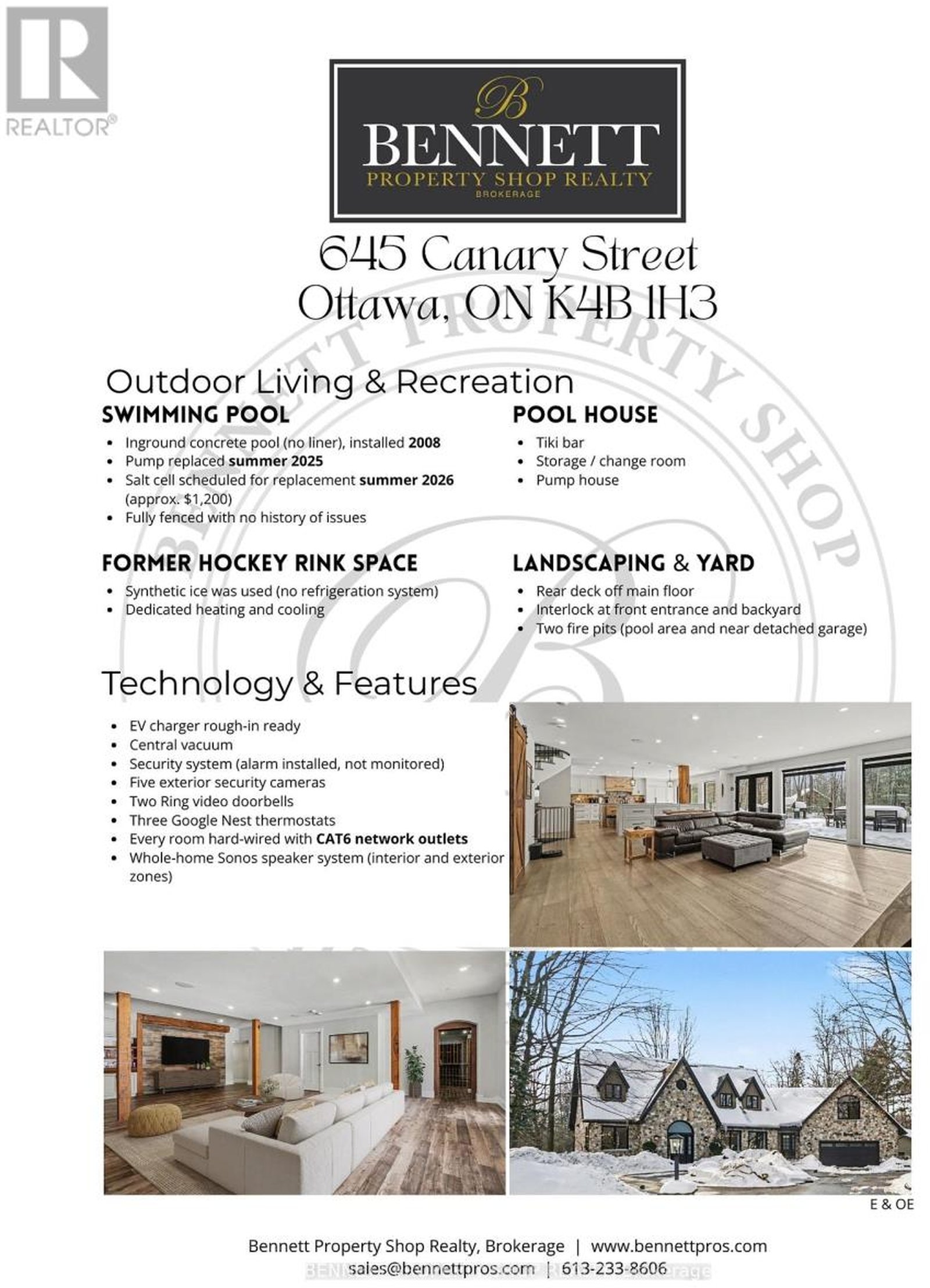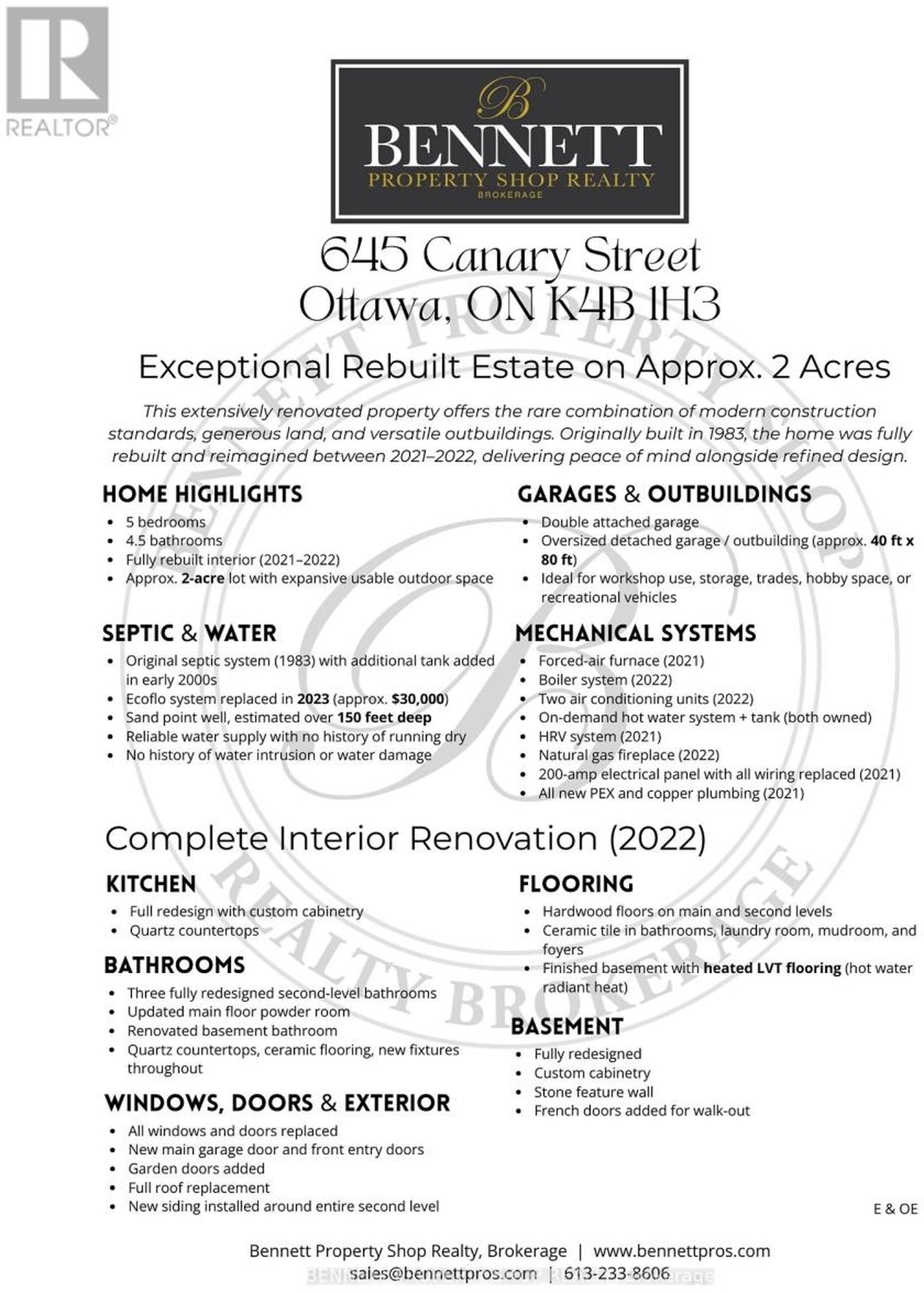 Exceptional estate-style home with 5,079 total sq ft and set on over 2 acres, offering space, privacy, and extensive modern upgrades. This thoughtfully designed residence features 5 bedrooms and 4.5 bathrooms, making it ideal for families seeking room to grow, or Multi-Generational living. Extensive upgrades completed between 2021-2022 include a forced-air furnace (2021), boiler system (2022), two air-conditioning units (2022), on-demand hot water system plus tank (both owned), HRV system (2021), natural gas fireplace (2022), roof (2022), all new PEX and copper plumbing (2021), and complete electrical replacement with a 200-amp panel (2021). The kitchen was fully redesigned with custom cabinetry and quartz countertops, while all bathrooms have been updated with new cabinetry, quartz counters, ceramic flooring, and modern fixtures. Hardwood flooring spans the main and second levels, complemented by ceramic tile in high-traffic areas. The finished basement offers heated LVT flooring, a stone feature wall, custom cabinetry, and walk-out access through new French doors. A rare and highly desirable feature is the oversized detached garage/outbuilding, approximately 40 ft x 80 ft, with heat and air conditioning, in addition to the heated double attached garage. This space is ideal for trades, hobbyists, collectors, or extensive storage needs. Outdoor amenities include a rear deck, fenced inground swimming pool, interlock landscaping, and multiple firepit areas, creating a private and inviting setting for entertaining and everyday enjoyment. Additional features include CAT6 wiring throughout, a whole-home Sonos system, Ring doorbells, exterior security cameras, EV charger rough-in, Gererac generator rough-in on the side of the attached garage, and Google Nest thermostats. A truly turnkey property offering exceptional functionality, and privacy, with major upgrades already completed. 72hrs' irrevocable. 24hrs notice for all showings. Some photos are digitally enhanced.