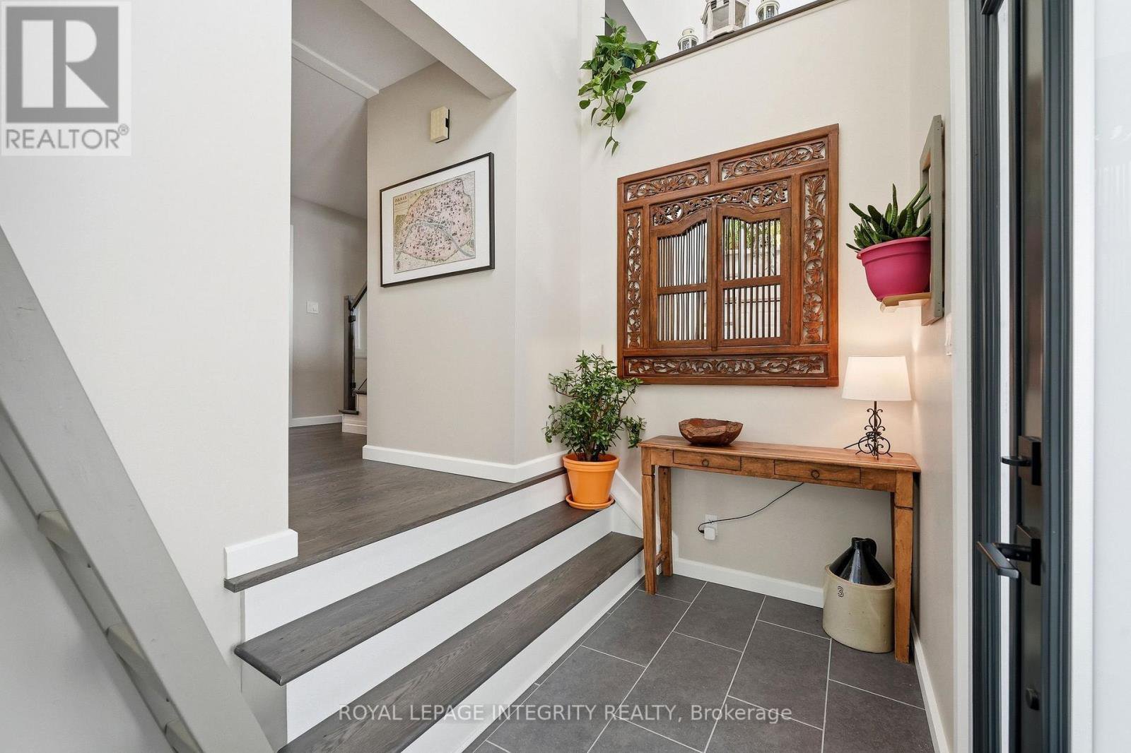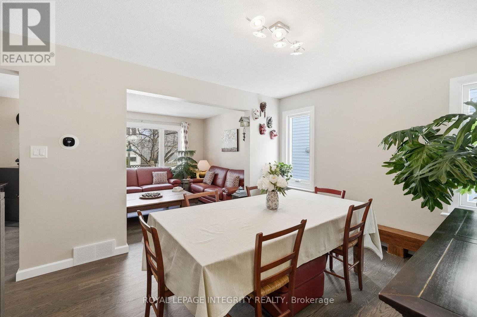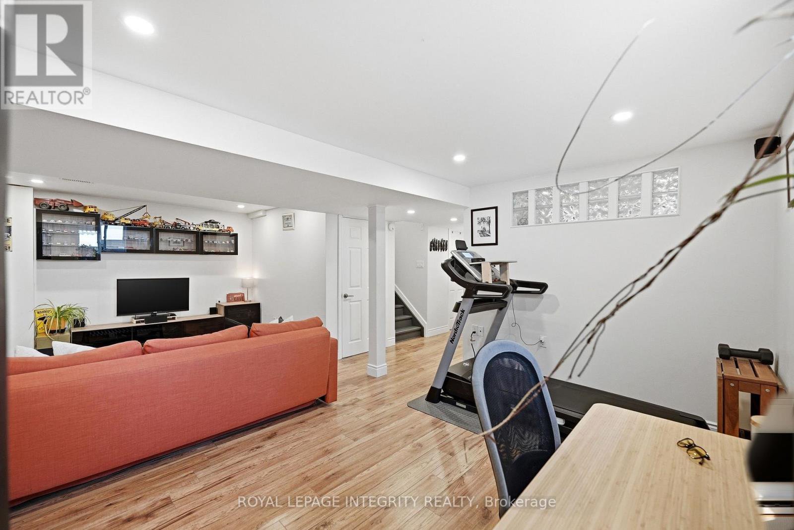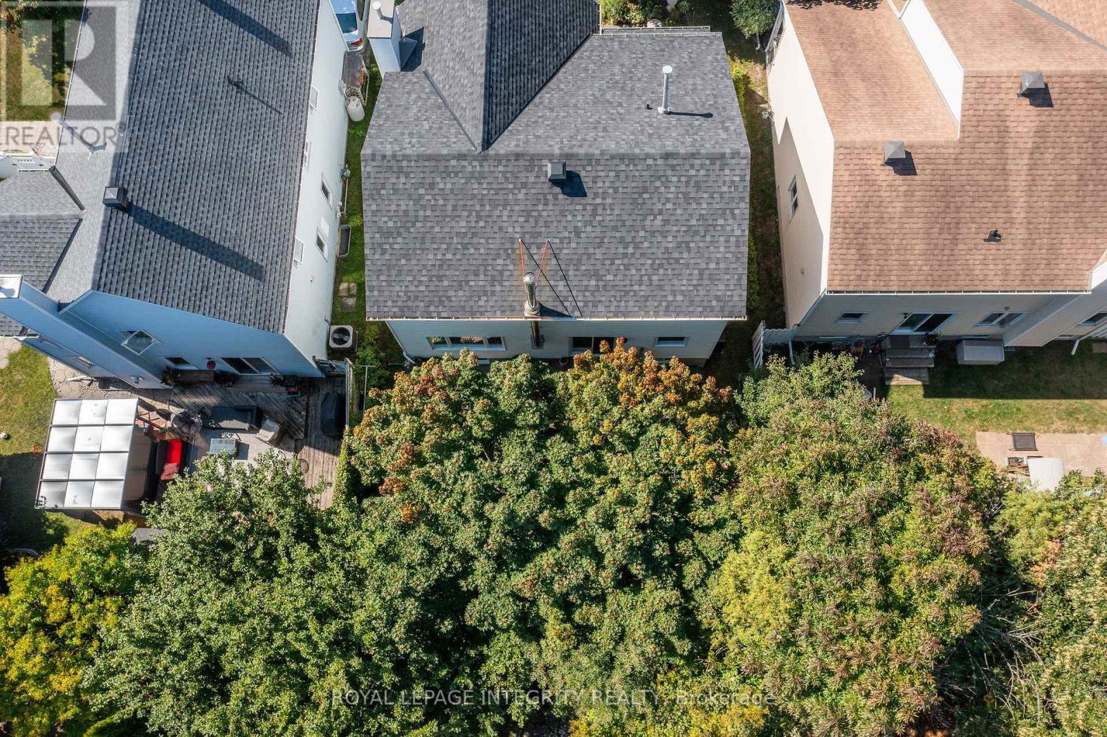 Stunning 4-bedroom, 4-bathroom home on a quiet street showcasing true pride of ownership! From the moment you arrive, you'll notice the beautiful curb appeal with a double-wide driveway, interlock walkway, and covered front porch. Step inside to a welcoming, impressive foyer with high ceilings and a large closet. A few steps up, the main floor offers a functional layout featuring an updated kitchen with glossy white and striking dark blue cabinetry, quartz counters, stainless steel appliances including a refrigerator with ice and water dispenser, glass backsplash, LED pot lights, and a spacious eating area for casual dining. A walk-in pantry with counters and cabinets provides excellent food prep space and additional storage. From the eating area, patio doors lead to the private backyard with a large deck, mature trees and greenery, and a storage shed - perfect for entertaining or relaxing after work. The sun-filled living room with a large window overlooks the backyard and offers a wood fireplace to cozy up on cooler evenings, and flows seamlessly into the dedicated dining area, both finished with gleaming hardwood floors. Beautiful woods stairs and glass railings lead you upstairs, where the flooring continues into the cozy loft style family room perfectly centered with a gas fireplace. Upstairs, you'll find the primary bedroom with two closets and a 3-piece ensuite featuring a walk-in glass shower, along with two additional generously sized bedrooms and a full bathroom. The fully finished basement offers a versatile recreation room, fourth bedroom, full bathroom, laundry area, and ample storage. Ideally located just steps to many amenities and with easy highway access for daily commuting - this home is a must see!
