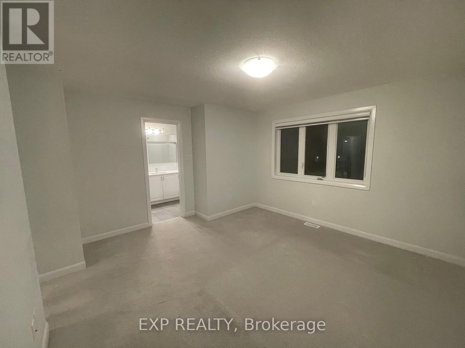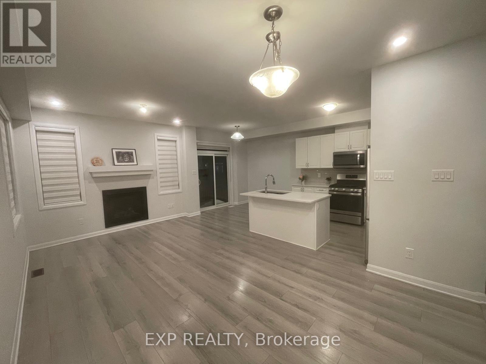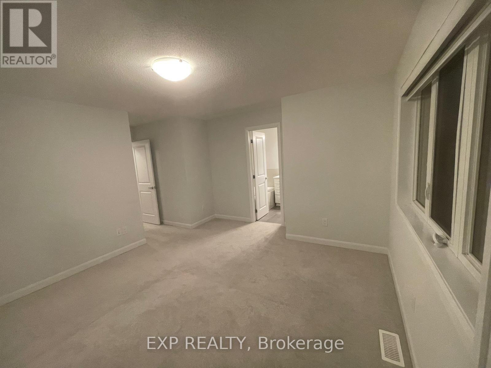 Immediate possession available! END UNIT offering 4 bedrooms and 4 bathrooms in the highly desirable Quinn's Pointe community. The main level welcomes you with a spacious foyer and features an open-concept living and dining area with hardwood flooring throughout. The modern kitchen is equipped with quartz countertops, tiled backsplash, gas stove, stainless steel appliances, a large island with breakfast bar, and ample cabinetry. A main-floor den provides the perfect space for a home office or study.Hardwood stairs lead to the second level, where the hallway continues in hardwood. The primary suite includes a generous walk-in closet and a 4-piece ensuite with quartz vanity, soaker tub, and glass shower. Three additional well-sized bedrooms, a full bathroom, and a convenient laundry room complete the upper floor.The fully finished basement offers a spacious recreation room, a 2-piece bathroom, and abundant storage. Additional features include central A/C, inside access from the single garage, and an extended driveway accommodating up to two extra vehicles. Ideally located close to parks, schools, nature trails, and the Minto Recreation Complex. Access to future greenbank road leading to the highway 416
