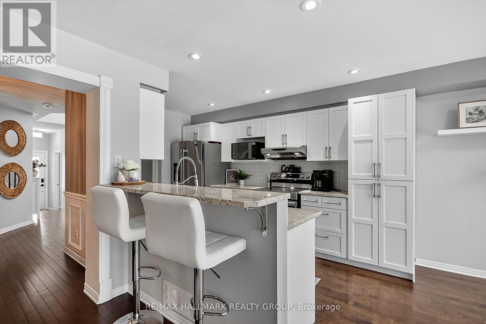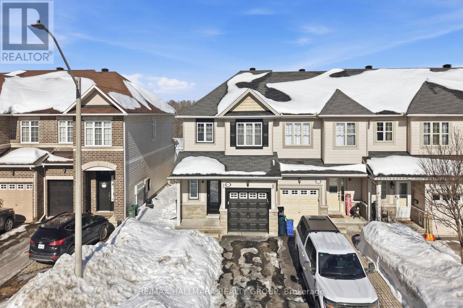 Enjoy inspirational lifestyle living in this Luxurious End Unit Townhome with No Rear Neighbors nestled in the sought-after community of East Village in Orleans. Located minutes from high-rated schools, parks, shopping, and the renowned Millennium Sports Park. This luxurious townhome combines comfort, space, and convenience is perfect for families or first-time buyers. No Rear Neighbors means added privacy and serene views, making this home stand out from the rest. Inside, you'll find luxurious finishes and spacious living spaces that features 3 good size bedrooms, 2 1/2 bathrooms, and a partially finished basement - Ideal for modern family living. The main floor showcases hardwood flooring and a bright, inviting living space layout. The luxurious kitchen features a pantry and includes "rich" granite countertops, beautiful glass tile backsplash and a generous breakfast eat-in area to quietly enjoy breakfast while overlooking gorgeous views of the green space behind your backyard - the elegant dining room features beautiful decor and a luxurious modern light fixture - the living room features a large wall of bright windows overlooking the breathtaking green space at the back of the townhome. The second floor features sparkling new laminate/vinyl flooring - a primary bedroom retreat that features a bonus room great as a private office or private study, walk-in closet, and a private Ensuite bathroom "oasis" that features a soaker tub & separate stand up shower Plus 2 good size bedrooms. The partially finished basement boasts quality laminate flooring and offers ample room for a home theatre, playroom, or another home office. The good size backyard features no rear neighbors and a good size deck. Special highlights include new carpet in both stairways, new laminate/vinyl flooring on the 2nd floor, all windows including the front & back door have been replaced. Don't miss your chance to own this beautifully maintained, move-in ready luxurious townhome/Flexible Posses