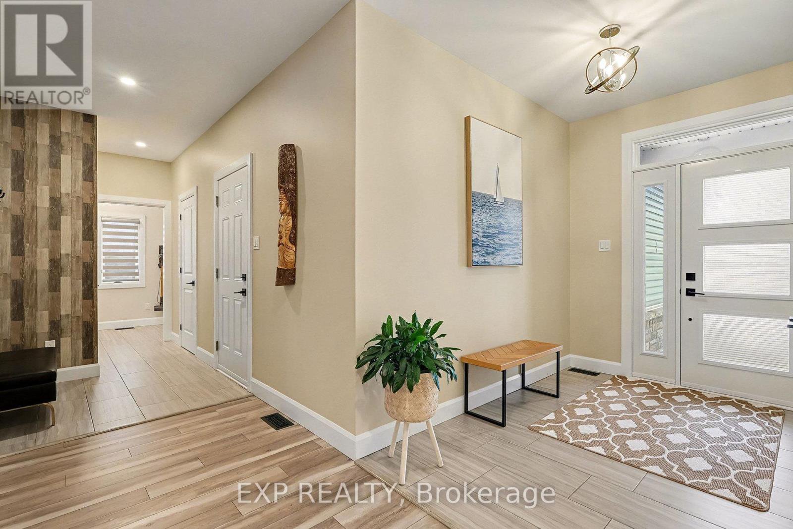 Discover this turnkey, upgraded 3+1 bedroom bungalow ideally situated on a desirable corner lot with a rare side driveway in the peaceful community of Cheney. Less than 5 years old and built by Fossil Homes, this property showcases quality craftsmanship and thoughtful finishes throughout. Bright and open, the home features 9-foot ceilings, quality laminate flooring on the main level with tile in wet areas, and a hardwood staircase leading to a fully finished basement. The pristine custom kitchen boasts quartz countertops, large breakfast bar island, modern backsplash, premium shelving, high-end appliances including a gas stove. The open concept living/dining area opens to a spacious covered rear deck (336 sq.ft.) complete with ceiling fan and natural gas BBQ connection - perfect for entertaining or just enjoying the warmer months. The main floor offers three bedrooms, including a primary suite with walk-in closet and luxurious ensuite with walk in shower and quartz countertops, plus the bonus of direct access to the rear deck. The finished lower level adds a fourth bedroom and a large recreation space ideal for hosting, relaxing or adding that home gym or office space and convenient 2 pc bath. Outside, the generous yard provides plenty of room for kids, pets, or gardening enthusiasts. Additional highlights include a fully insulated and finished attached two car garage, paved driveway for six vehicles (2023), municipal water, central A/C, upgraded lighting/plumbing fixtures. The side driveway accommodates two or more RVs with electrical hookup, and the powered, insulated Old Hickory shed with wood stove offers versatile year-round use. Nothing to do but move in & enjoy!