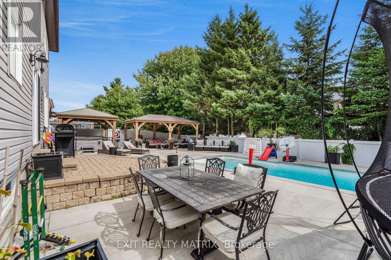 This stunning corner-lot dream home in Embrun is a perfect blend of timeless luxury and modern comfort, offering a lifestyle that feels like a private retreat. Step inside to discover a spacious main level designed with elegance and functionality in mind. The living room greets you upon entry and seamlessly flows into a formal dining area, creating the perfect atmosphere for both family gatherings and entertaining. At the heart of the home, the chefs kitchen boasts a sleek peninsula, abundant cabinetry, exquisite finishes, and a walk-in pantry. A bright breakfast area with patio doors opens to the backyard, while the expansive family room, enhanced by a cozy fireplace and oversized windows, provides an inviting space to relax. Completing the main floor is a versatile bedroom/office space and a stylish bathroom. Upstairs, five generous bedrooms and two bathrooms await, along with a conveniently located laundry room. The primary suite is a true sanctuary, offering a luxurious five-piece ensuite and a walk-in closet. The fully finished lower level expands the living space with a family room, a games room, and a bathroom, creating endless possibilities for entertainment and leisure. Outdoors, the property transforms into a private resort. The beautifully landscaped and fully fenced yard is anchored by a saltwater inground pool with a slide, a new heater, and a safety cover. An interlock patio and a charming gazebo complete this backyard oasis, making it the ultimate space for summer fun and relaxation. This home has been meticulously updated to ensure comfort and peace of mind. The property also features a new pool heater, a landscaped backyard, a new fence, updated eavestroughs, permanent LED holiday lighting, a new 200-amp panel with EV car charger, and upgraded overhead lighting in all bedrooms. With its spacious design, luxurious finishes, and resort-style outdoor living, this Embrun masterpiece is more than a home, it's a lifestyle.
