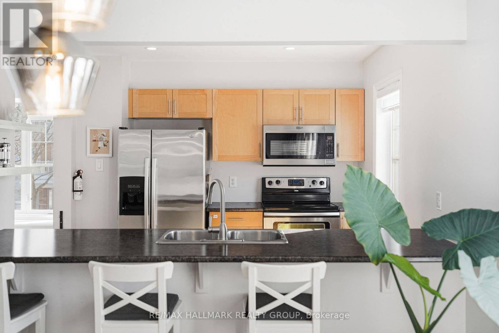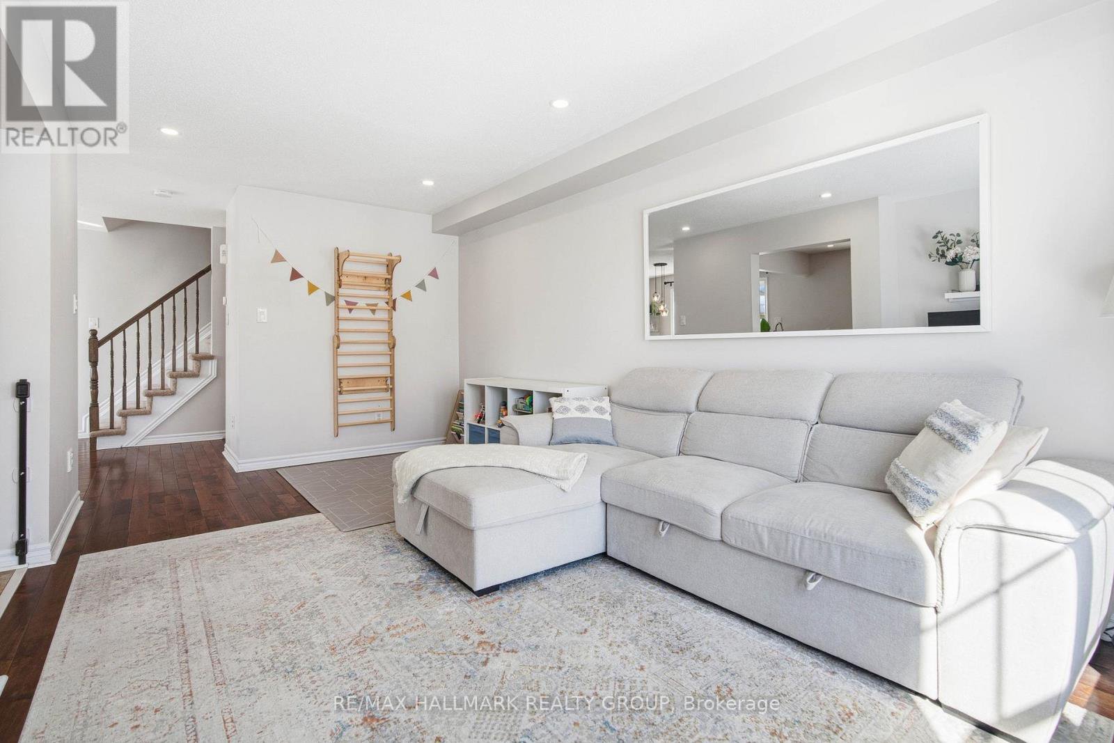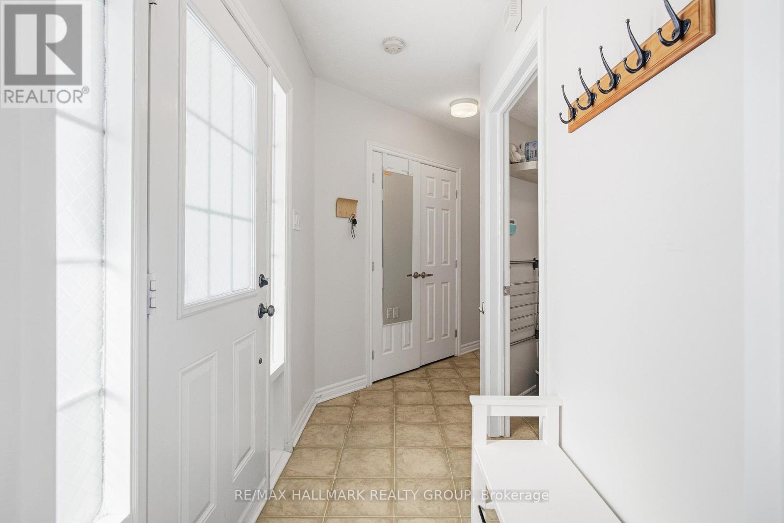 OPEN HOUSE - Sunday, March 1st 2:00-4:00PM! Welcome to this bright and well-kept three-storey corner townhome, offering a functional layout and excellent natural light throughout. Enjoy the convenience of an attached garage with direct access to the main level, plus a dedicated main-floor office/den-perfect for working from home.The second level features a spacious living room, a separate dining area, and an open-concept kitchen with walk-out to a south west-facing balcony-ideal for relaxing or entertaining. Hardwood flooring flows through the main living areas, complemented by ceramic tile in the kitchen and powder room, and stylish pot lights in the living space and kitchen.Upstairs, the primary bedroom offers a walk-in closet and a private 3-piece ensuite. The second bedroom features a vaulted ceiling and access to a full 3-piece bathroom. Additional highlights include interlock front parking, stainless steel appliances, pull-out kitchen shelving, central vacuum, and updated light fixtures.Recent updates include a new washer and dryer (2023), hot water tank (2023), kitchen pot lights (2024), microwave/vent (2025), refreshed powder room paint, and ensuite bathroom upgrades including quartz counters, new toilet, and updated tiles (2025). Most windows feature blinds for added privacy and comfort.Conveniently located near Tanger Outlets, grocery stores, restaurants, Canadian Tire Centre, public transit, and with easy access to the Queensway. Situated in a family-friendly community-this home is move-in ready and a must-see!