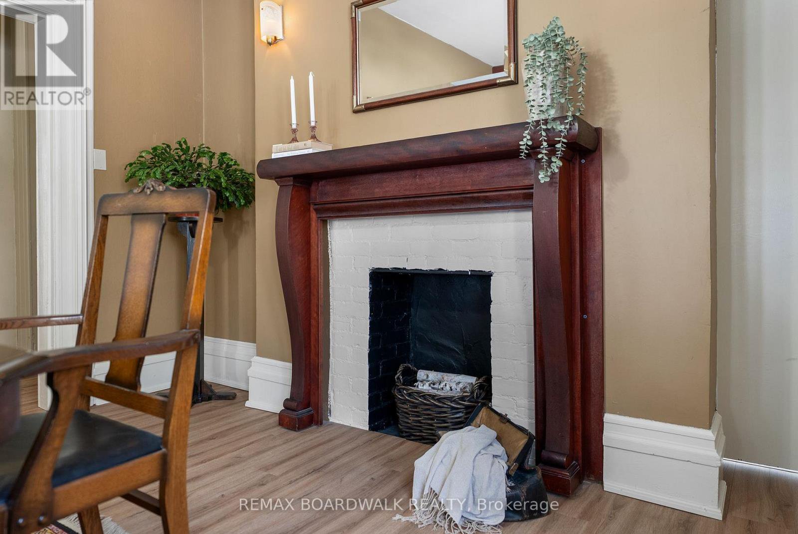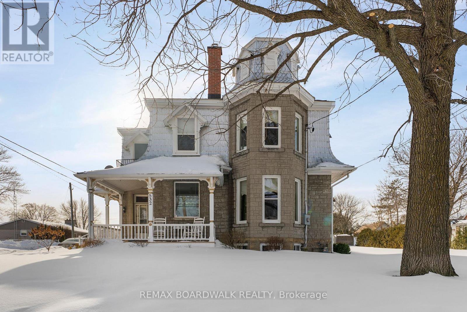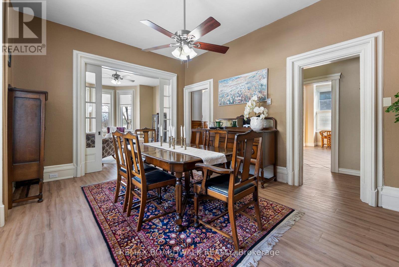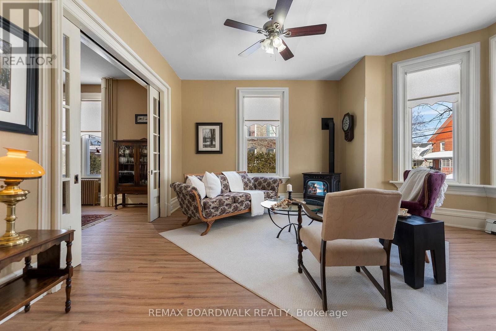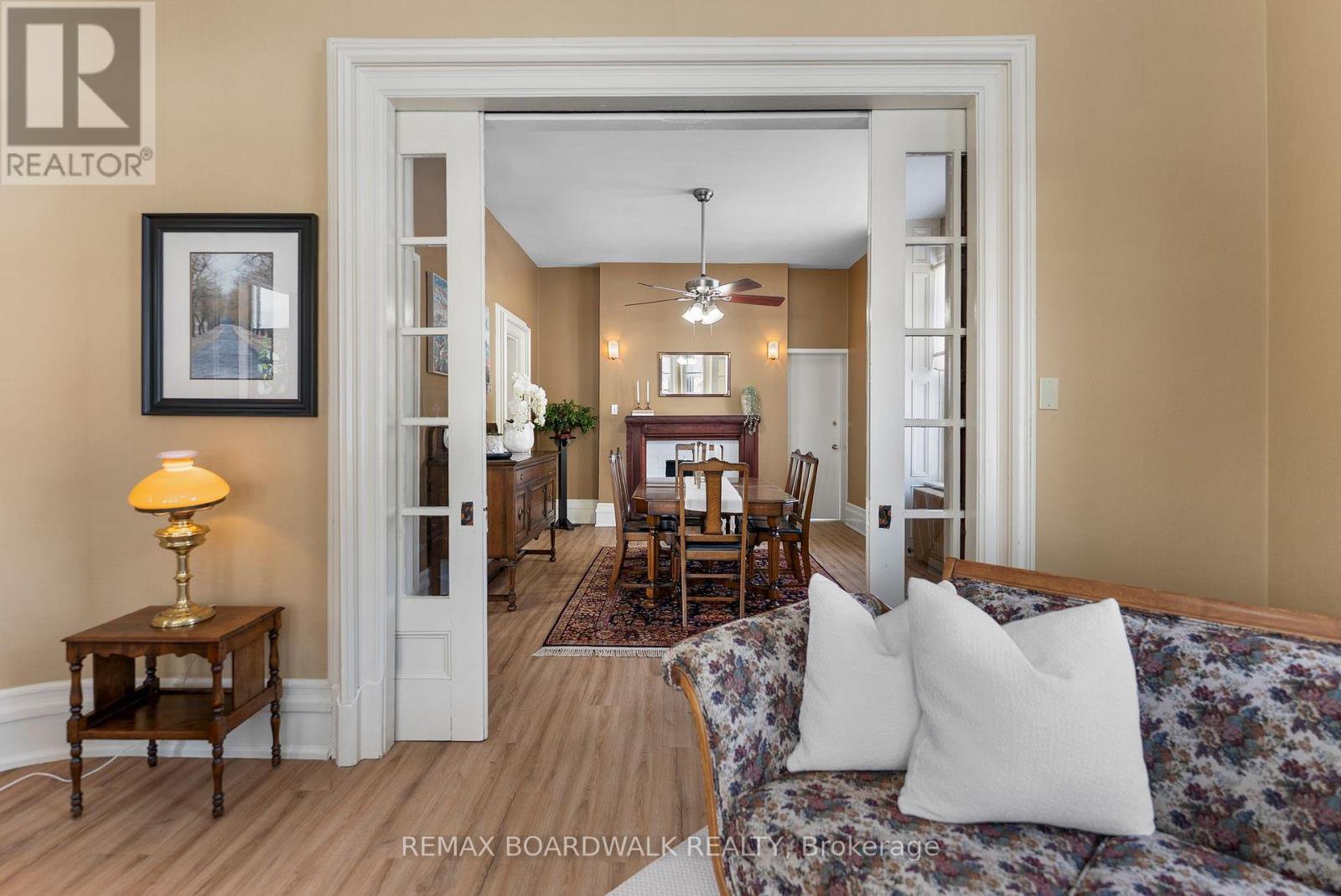 Nestled on a prominent corner lot in the heart of Winchester, this distinguished early-1900s residence offers appx. 4000 sq ft of beautifully preserved character paired with thoughtful modern updates.Originally built for a local doctor, the home reflects a timeless elegance with a stately turret, classic mansard roofline, & inviting front & side porches that enhance its grand curb appeal.Step inside to welcoming rich original wood trim, detailed wainscotting, and craftsmanship that speaks to history. The main level offers an updated kitchen designed for everyday functionality.The formal dining room flows seamlessly from the living room, separated by original pocket doors-perfect for both intimate dinners and larger gatherings A pellet stove anchors the living room, creating a warm and inviting atmosphere.The rear of the home, the doctor's original office has been thoughtfully adapted into a versatile living space featuring a family room w/gas fireplace, 2nd kitchen, updated full bathroom.This additional living quarters ideal for potential in-law suite/rental unit.The 2nd level has original hdwd flooring & wood detail following the main level. One staircase leads to a spacious primary bedroom complete with a comfortable sitting area, two generously sized secondary bedrooms & a den/office space.These rooms share an updated 5 pc bathroom that blends modern convenience with classic style. From the den, a large room presently used as storage that lead to an expansive bonus room above the double car garage.Whether envisioned as a home theatre, fitness studio, games room, or creative workspace, the possibilities here are truly endless! A 2nd staircase on this side of the home leads to a bright laundry room at the rear of the home. Set on a large, beautifully positioned corner lot, this property offers both presence and privacy. With its distinctive architectural features, substantial living space, & rare combination of history & versatility, you will be proud to call home.