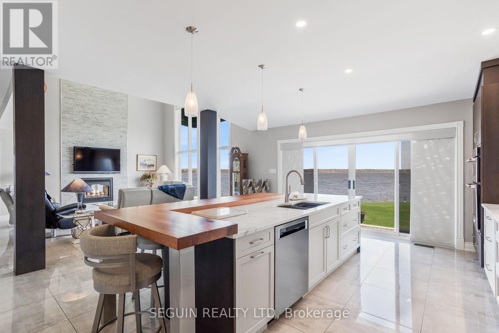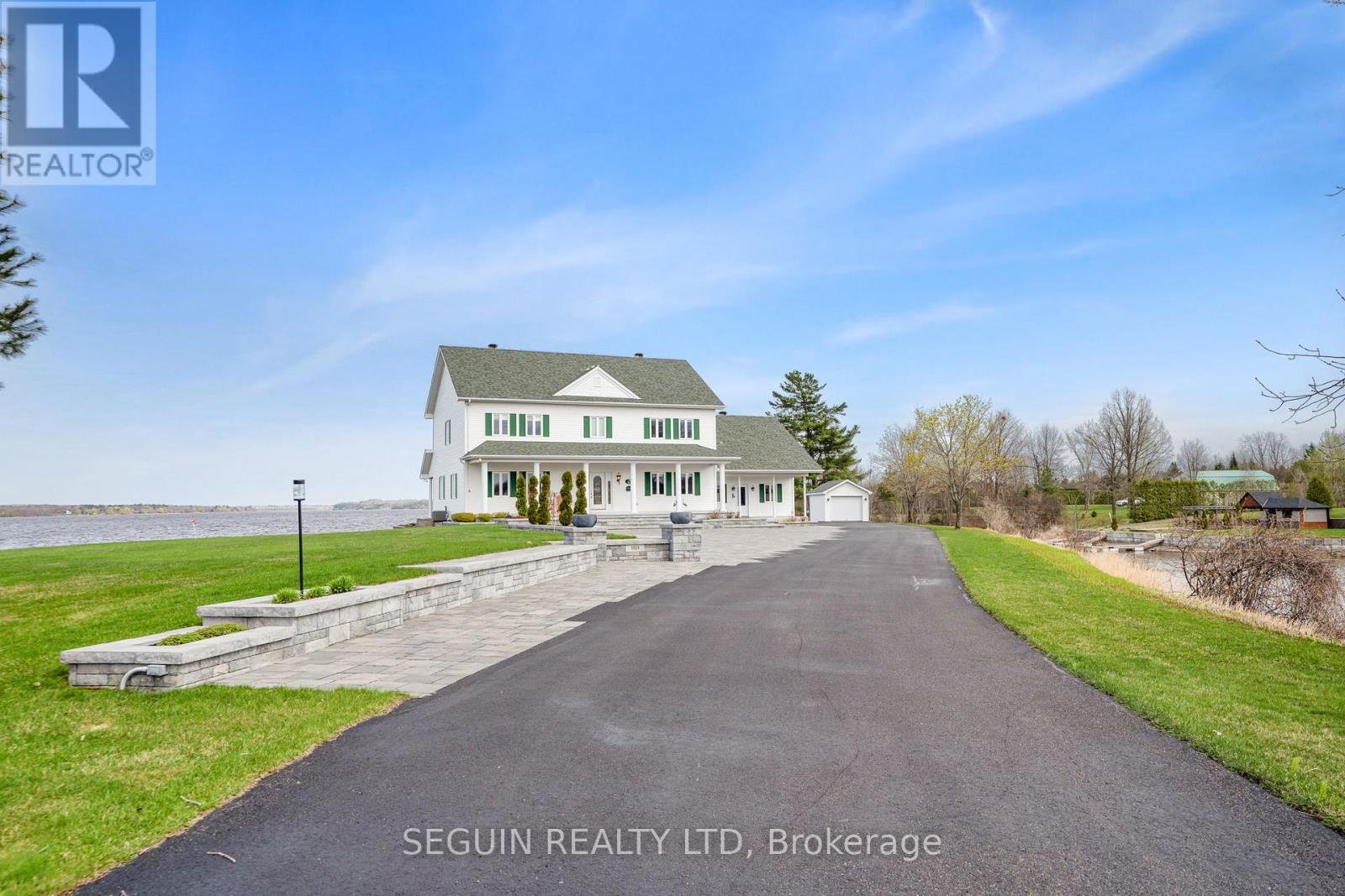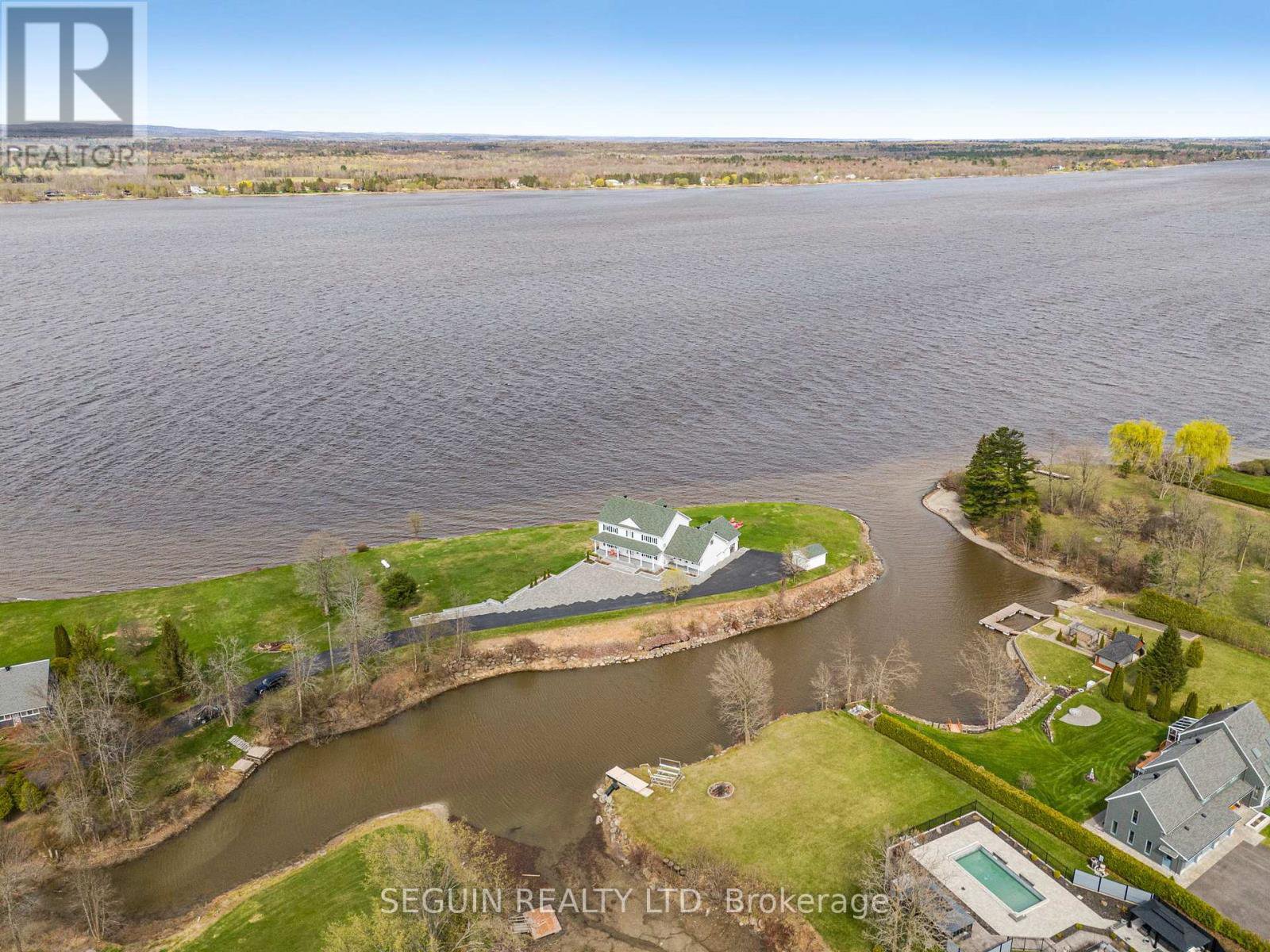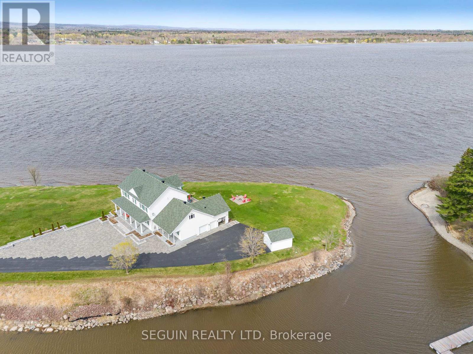 A once-in-a-generation opportunity to own one of the most exceptional waterfront properties in the area. Set on a breathtaking 1.93-acre private peninsula with over 360 feet of pristine shoreline along the majestic Ottawa River, this rare estate offers unmatched privacy, panoramic water views, and an extraordinary lifestyle. Designed with elegance and intention, the home features 9-foot ceilings throughout and a spectacular 19-foot cathedral ceiling in the grand family room. Expansive floor-to-ceiling windows frame the river like artwork, while a striking double-sided fireplace adds warmth and architectural presence. The open-concept chef's kitchen is the heart of the home, showcasing an oversized island and premium appliances - ideal for both everyday living and upscale entertaining. Two spacious living rooms provide flexibility for formal gatherings or relaxed family time. A dedicated home office overlooking the water creates the ultimate work-from-home sanctuary. The main floor also includes a powder room, a separate laundry room, and direct access to a triple-car garage with private entry to the fully finished basement. Upstairs, the luxurious primary suite offers a spa-inspired ensuite with radiant heated floors, a fireplace, and an expansive walk-in closet. Two additional well-appointed bedrooms and a stylish full bathroom complete the upper level. Outdoors, professionally landscaped grounds and a full sprinkler system maintain the lush setting with ease. A secluded private bay offers protected docking and effortless boating access - a rare feature along this stretch of the river. This is more than a home; it's a legacy property, a private retreat, and a true showcase of refined waterfront living.
