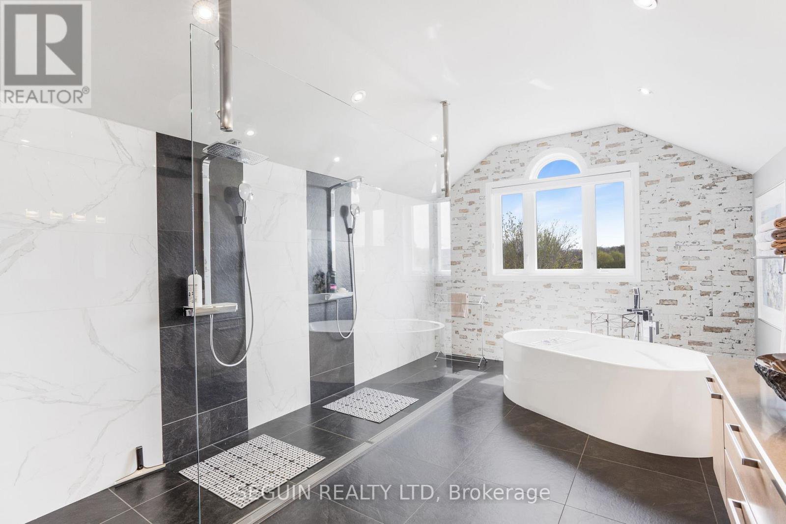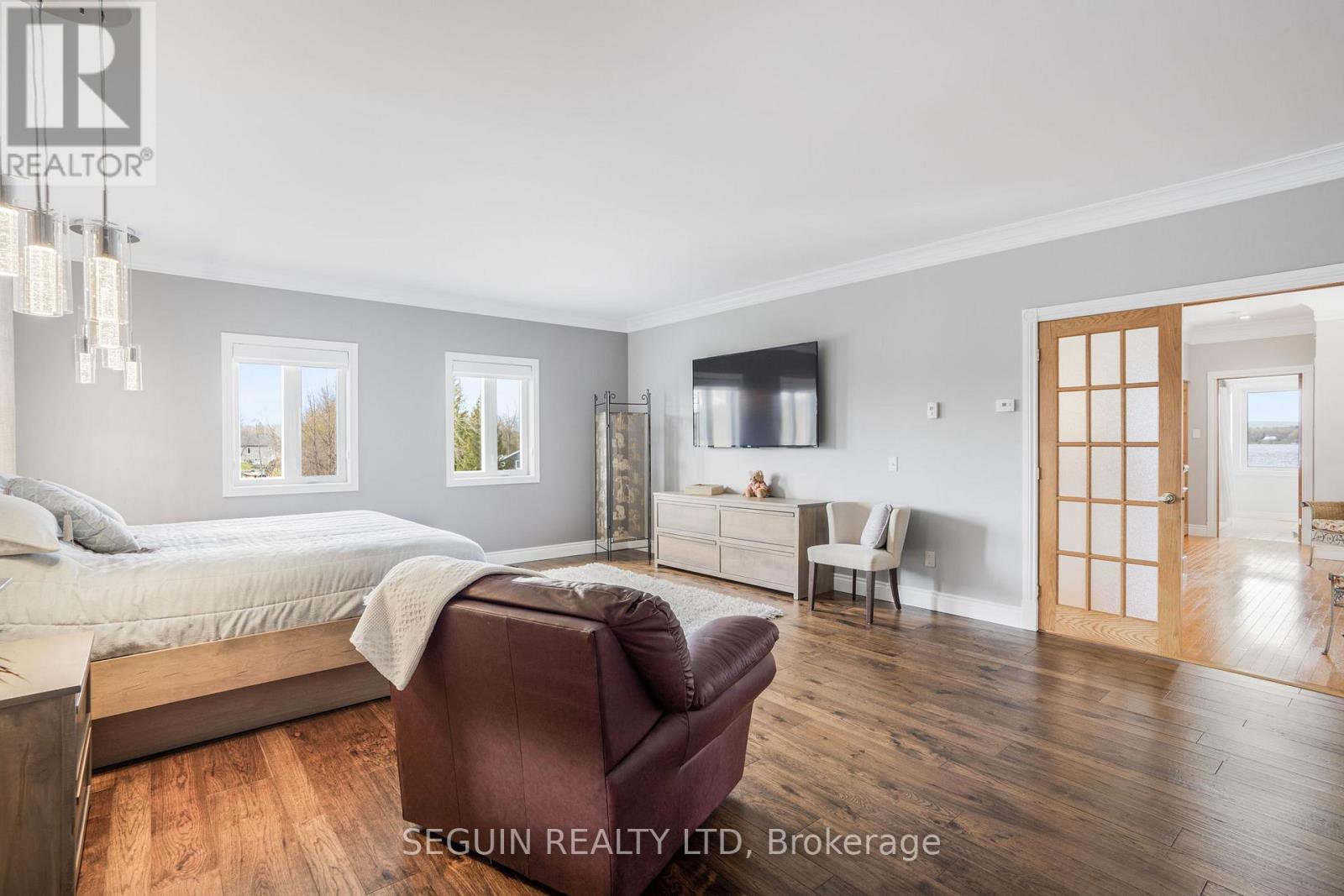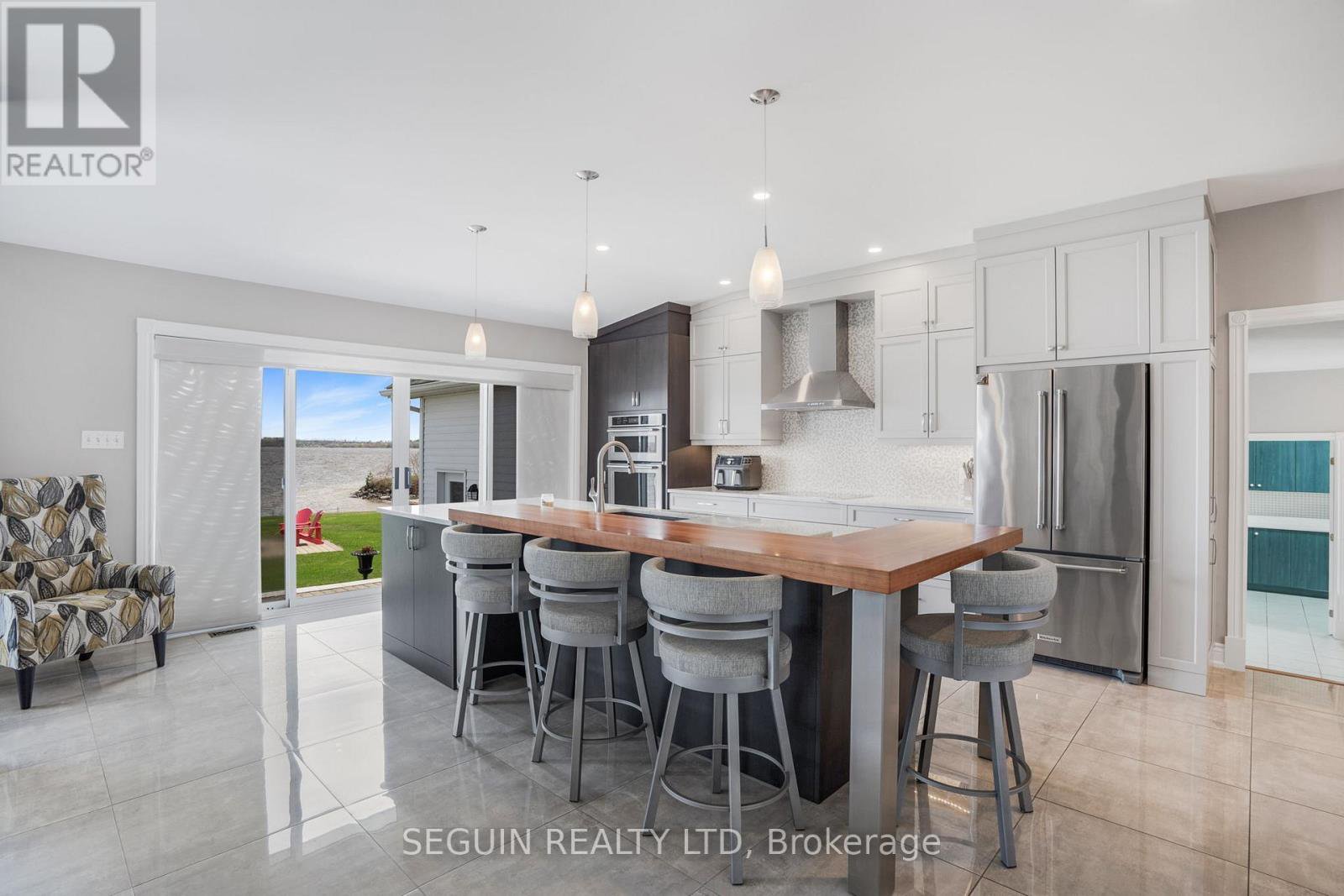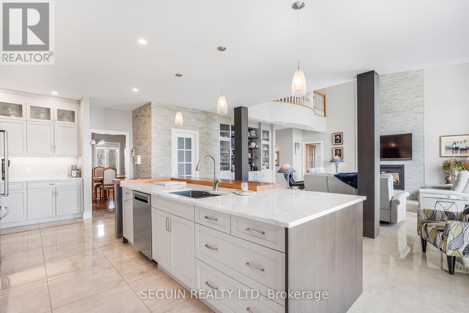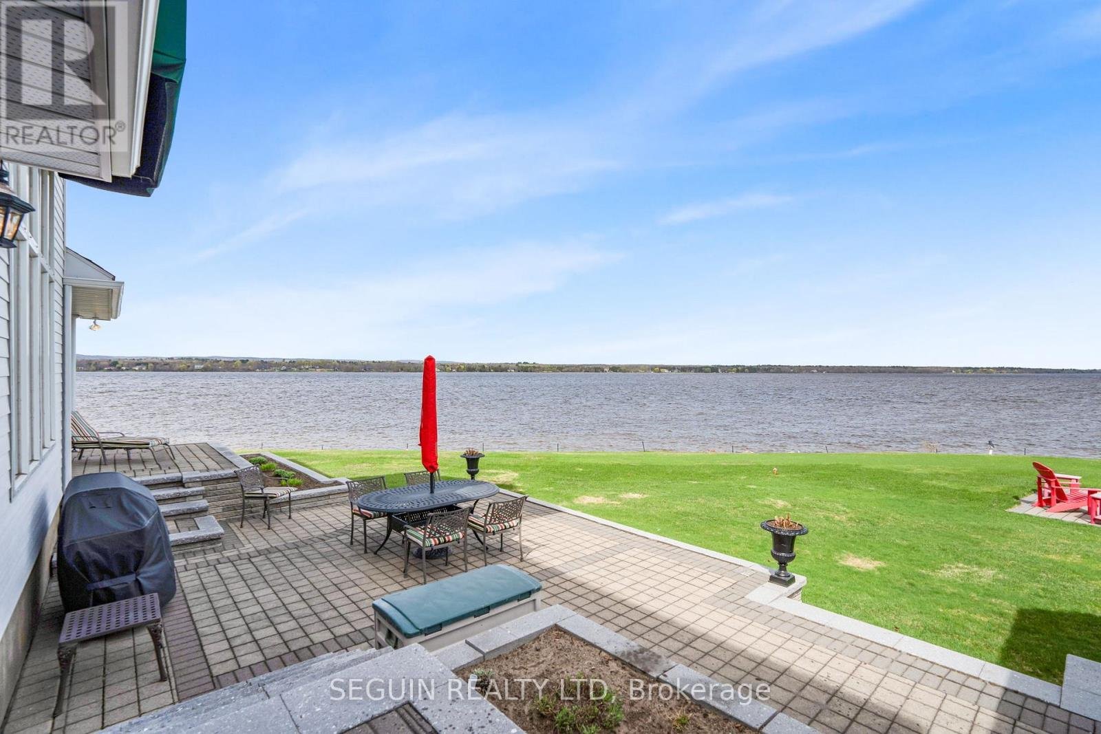 A once-in-a-generation opportunity to own one of the most exceptional waterfront properties in the area. Set on a breathtaking 1.93-acre private peninsula with over 360 feet of pristine shoreline along the majestic Ottawa River, this rare estate offers unmatched privacy, panoramic water views, and an extraordinary lifestyle. Designed with elegance and intention, the home features 9-foot ceilings throughout and a spectacular 19-foot cathedral ceiling in the grand family room. Expansive floor-to-ceiling windows frame the river like artwork, while a striking double-sided fireplace adds warmth and architectural presence. The open-concept chef's kitchen is the heart of the home, showcasing an oversized island and premium appliances - ideal for both everyday living and upscale entertaining. Two spacious living rooms provide flexibility for formal gatherings or relaxed family time. A dedicated home office overlooking the water creates the ultimate work-from-home sanctuary. The main floor also includes a powder room, a separate laundry room, and direct access to a triple-car garage with private entry to the fully finished basement. Upstairs, the luxurious primary suite offers a spa-inspired ensuite with radiant heated floors, a fireplace, and an expansive walk-in closet. Two additional well-appointed bedrooms and a stylish full bathroom complete the upper level. Outdoors, professionally landscaped grounds and a full sprinkler system maintain the lush setting with ease. A secluded private bay offers protected docking and effortless boating access - a rare feature along this stretch of the river. This is more than a home; it's a legacy property, a private retreat, and a true showcase of refined waterfront living.