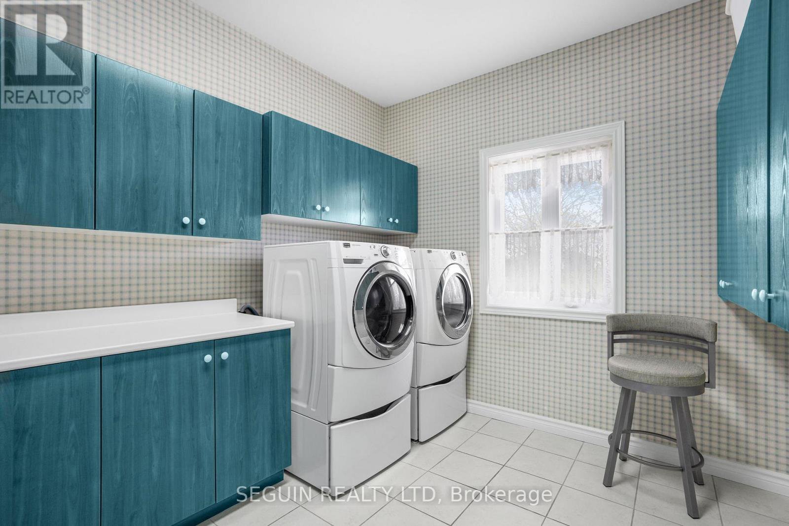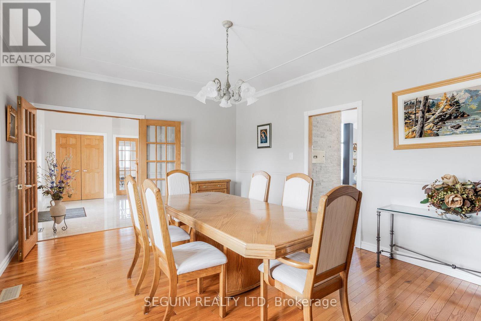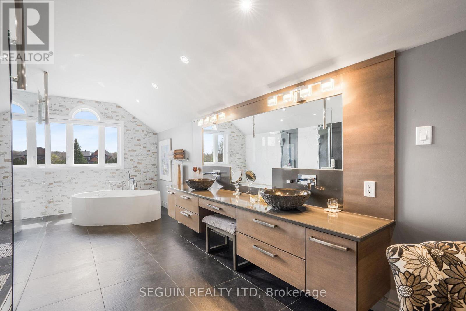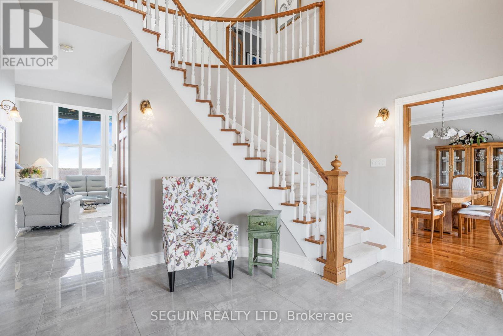 A once-in-a-generation opportunity to own one of the most exceptional waterfront properties in the area. Set on a breathtaking 1.93-acre private peninsula with over 360 feet of pristine shoreline along the majestic Ottawa River, this rare estate offers unmatched privacy, panoramic water views, and an extraordinary lifestyle. Designed with elegance and intention, the home features 9-foot ceilings throughout and a spectacular 19-foot cathedral ceiling in the grand family room. Expansive floor-to-ceiling windows frame the river like artwork, while a striking double-sided fireplace adds warmth and architectural presence. The open-concept chef's kitchen is the heart of the home, showcasing an oversized island and premium appliances - ideal for both everyday living and upscale entertaining. Two spacious living rooms provide flexibility for formal gatherings or relaxed family time. A dedicated home office overlooking the water creates the ultimate work-from-home sanctuary. The main floor also includes a powder room, a separate laundry room, and direct access to a triple-car garage with private entry to the fully finished basement. Upstairs, the luxurious primary suite offers a spa-inspired ensuite with radiant heated floors, a fireplace, and an expansive walk-in closet. Two additional well-appointed bedrooms and a stylish full bathroom complete the upper level. Outdoors, professionally landscaped grounds and a full sprinkler system maintain the lush setting with ease. A secluded private bay offers protected docking and effortless boating access - a rare feature along this stretch of the river. This is more than a home; it's a legacy property, a private retreat, and a true showcase of refined waterfront living.