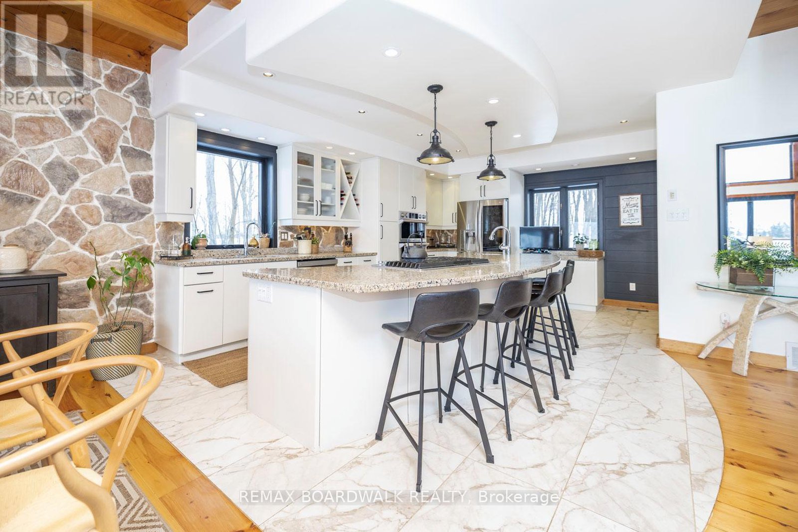 WELCOME TO LAKE LIVING, boasting arguably the most breathtaking westerly views and pristine shoreline the lake has to offer. Outside, you'll find over 100 feet of private waterfront, featuring your own sandy beach, stunning shoreline, two docks, a floating raft, a sauna, hot tub, and a custom bonfire all designed to captivate lake vistas. As you step inside, the home exudes luxury and pride of ownership. Souring ceilings, expansive floor-to-ceiling windows throughout provide panoramic views of the lake from nearly every room. The custom chef's kitchen is a dream, featuring top-of-the-line appliances, a wine fridge, ample cabinetry, and generous counter space, all centered around a spacious island ideal for family gatherings and entertaining. The home offers four bedrooms on the upper level, including a lavish primary suite complete with a stunning ensuite. With four bathrooms in total, there's plenty of space for comfort and privacy. The fully finished lower level is a true highlight, offering walkout access to a screened-in patio that lets you soak in the peaceful lake views. This turnkey home is ready for you to enjoy the unparalleled lifestyle that waterfront living offers. Whether you're cooling off in the water, boating, fishing, or playing ice hockey in the winter, this property is a true gem, an exceptional opportunity not to be missed. $50/month in road fees.