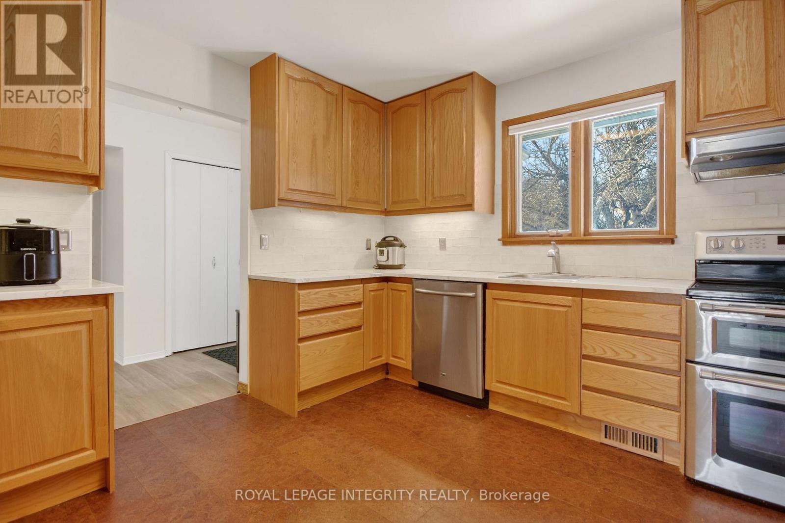 Timeless bungalow on a premium 100 ft x 200 ft lot (.46 acres) in the heart of Stittsville, offering exceptional development potential and flexibility for a future home-based business. This expansive property provides a rare opportunity in a prime location. The home features an open concept living and dining area with large sliding doors that provide access to the backyard and allow for plenty of natural light. The upgraded kitchen includes a stylish tile backsplash and stainless steel appliances, making it both functional and accessible. The main level offers a spacious primary bedroom and 2 secondary bedrooms both with ample closet space and a full bathroom. The finished lower level expands the living area with a comfortable family room featuring a cozy gas stove, a fourth bedroom and a full bathroom with a glass shower. Additional lower level space includes generous storage and a dedicated laundry area. Step outside to enjoy the beautifully landscaped and fully fenced yard, complete with a deck and storage shed, perfect for outdoor entertaining or relaxing in your private green space. The attached double car garage and oversized driveway provide excellent parking and future possibilities. Located in a highly desirable neighbourhood close to parks, schools, trails and the shops and restaurants along Stittsville Main Street. This property combines comfortable living with outstanding long-term potential. Upgrades Include: Flooring 2025, AC 2023, Paint 2022, Kitchen and washrooms refreshed in 2019, Fridge, Stove, dishwasher, washer dryer 2014, Steel roof - 2016, Soffit/Fascia - 2016, Garage door 2013, kitchen countertop 2019, gas furnace 2012 (warranty to 2027).