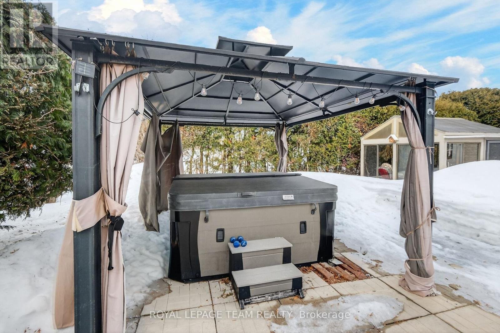 Stop the Car! Nestled in a peaceful country setting, this charming raised bungalow offers space, comfort and exceptional outdoor amenities. Welcoming front porch opens to a generous foyer. A beautiful eat-in kitchen featuring abundant cabinetry and spacious dining area along with a breakfast bar. Large living room is warm and inviting with a cozy brick fireplace (insert) note the crown mouldings. Hardwood and tile throughout the main level. Main level offers 2 bedrooms, convenient powder room and a stunning spa-like bath with jetted tub & separate shower. The lower level provides excellent additional living space with good sized windows for natural light, rec room with another fireplace (insert), 3 more bedrooms and a 3pc bath/laundry combo. There is a second entrance/foyer at the back of the home. Total of 4 points of entry. The property features a detached 2 car garage an insulated/heated workshop, another shed attached to garage, a garden solarium and a patio with a gazebo / hot tub (2022) Central Air was installed in 2021. Enjoy the privacy with lots of mature hedges, as well as the very thorough security system. Parking for at least 8 cars.