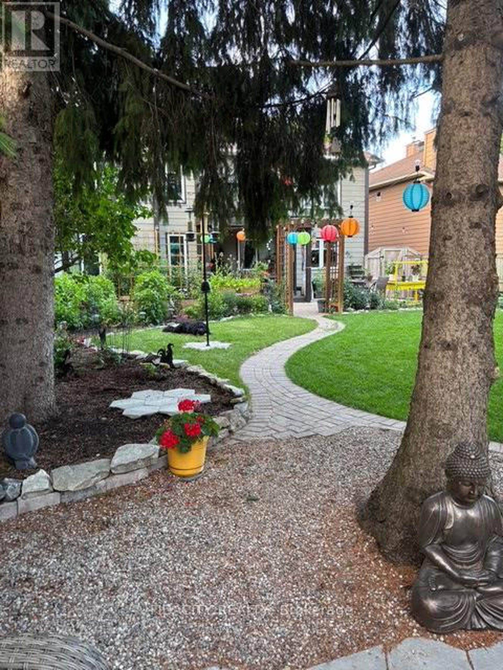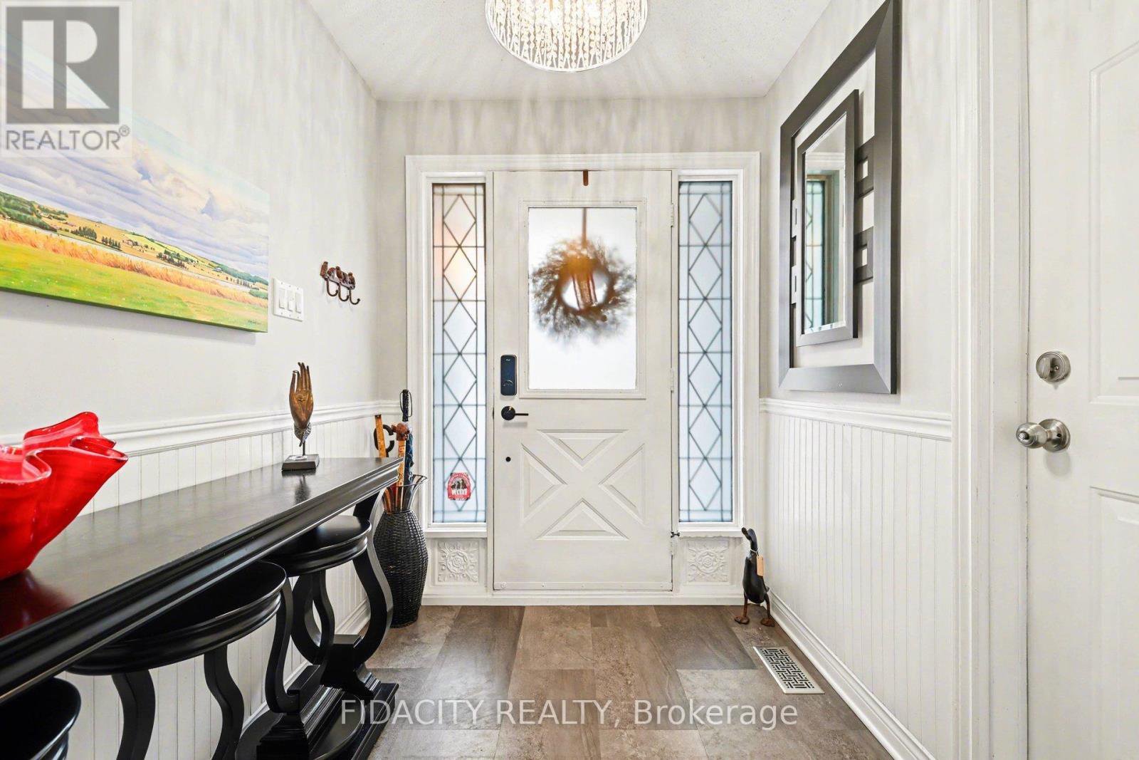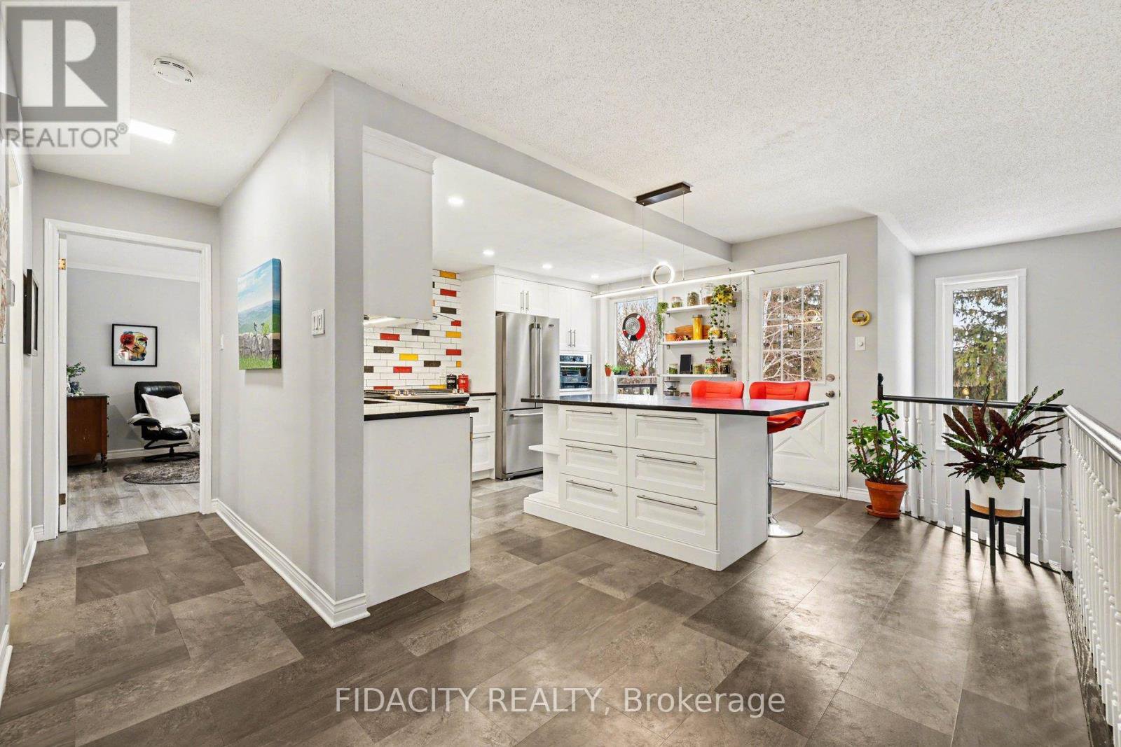 Fully renovated bungalow with walkout basement located in a mature neighbourhood with no rear neighbours. The backyard is a private oasis with mature trees and established gardens, creating a peaceful setting.The main floor is bright and welcoming with a spacious living and dining area finished with high-end vinyl flooring throughout - no carpeting. The fully renovated kitchen (2020) features quartz countertops, Spanish tile backsplash, stainless steel appliances, a large island and breakfast bar, and direct access to a raised deck overlooking the backyard-perfect for entertaining or relaxing outdoors.The primary bedroom is generously sized and includes a walk-in closet and a unique semi-ensuite bath layout featuring a soaker tub and vanity, with a separate adjoining area that includes an additional vanity and shower for added functionality.The fully walkout lower level is bright and sunny offering excellent additional living space with a dramatic two-storey family room and fireplace, plus access to an enclosed porch that opens in the summer to enjoy fresh air and breezes. This level also includes 2 bedrooms, a full bathroom, laundry area, and ample storage, with potential for a 4th bedroom or an in-law suite thanks to the bright walkout design. Meticulously maintained and thoughtfully updated throughout.Major updates include: fully renovated kitchen and new appliances (2020), vinyl flooring throughout (2020), downstairs bathroom remodel (2021), new patio door (2021), 9 new windows (2024), driveway repaved (2023), exterior repainted (2025), furnace and water heater (2016), and A/C (2017).