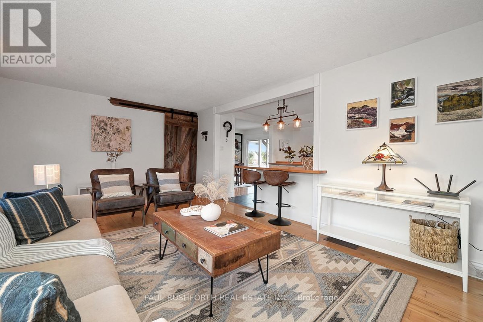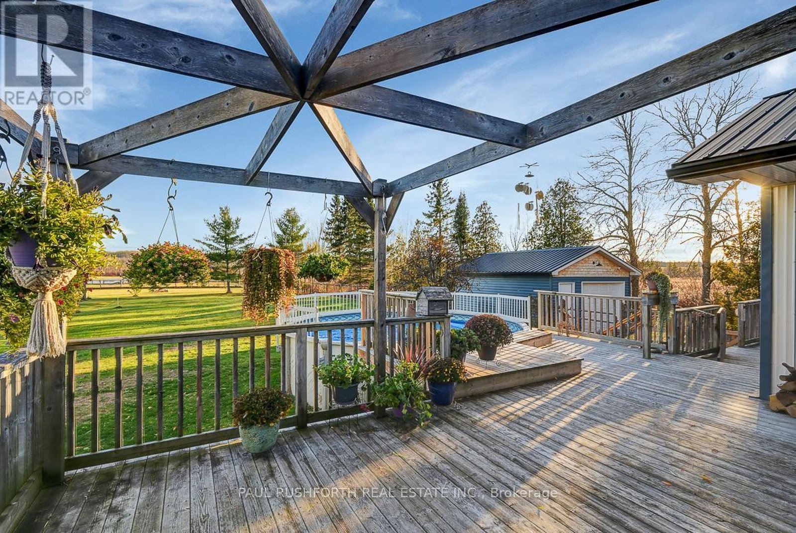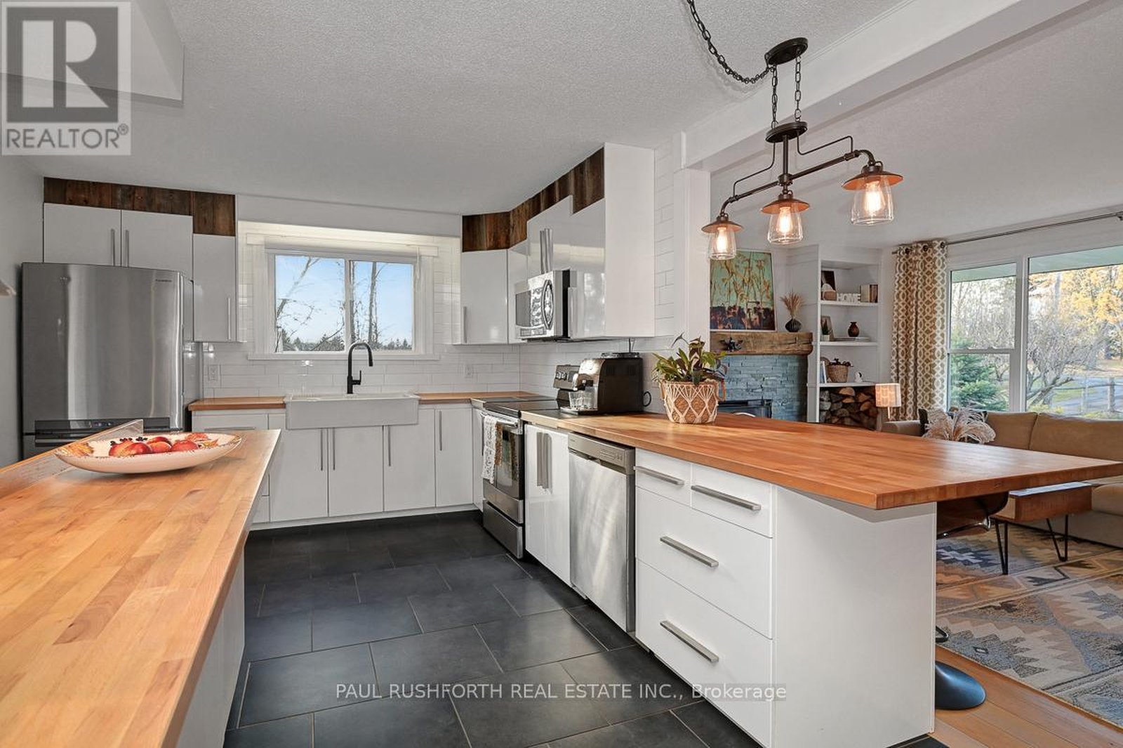 Your peaceful country retreat awaits. Discover the perfect blend of charm, comfort, and space in this meticulously maintained 2+1 bedroom, 2 full bath bungalow, set on over an acre picturesque lot surrounded by nature. Step inside to find rich hardwood floors and a bright, bistro style kitchen that radiates warmth and character. Flooded with natural light and freshly painted, the open concept layout flows seamlessly into a cozy living room with a wood burning fireplace, the perfect place to unwind on cool evenings. A separate dining area opens to a large deck overlooking the above ground saltwater pool, perfect for entertaining or relaxing in your private oasis. The main floor features two inviting bedrooms, including a primary suite, and an elegant full bath with his and her sinks. Downstairs, the fully finished lower level offers a third bedroom, a large entertainment or family room, a second full bath, and generous storage. Outside, enjoy your fully cedar fenced backyard, detached garage with two additional carports- 1 is covered, 1 is frame only, a durable steel roof, and ample parking for all your vehicles and toys. Whether you're entertaining friends, raising a family, or simply seeking tranquility, this property delivers it all. Come experience the serenity. This is home!