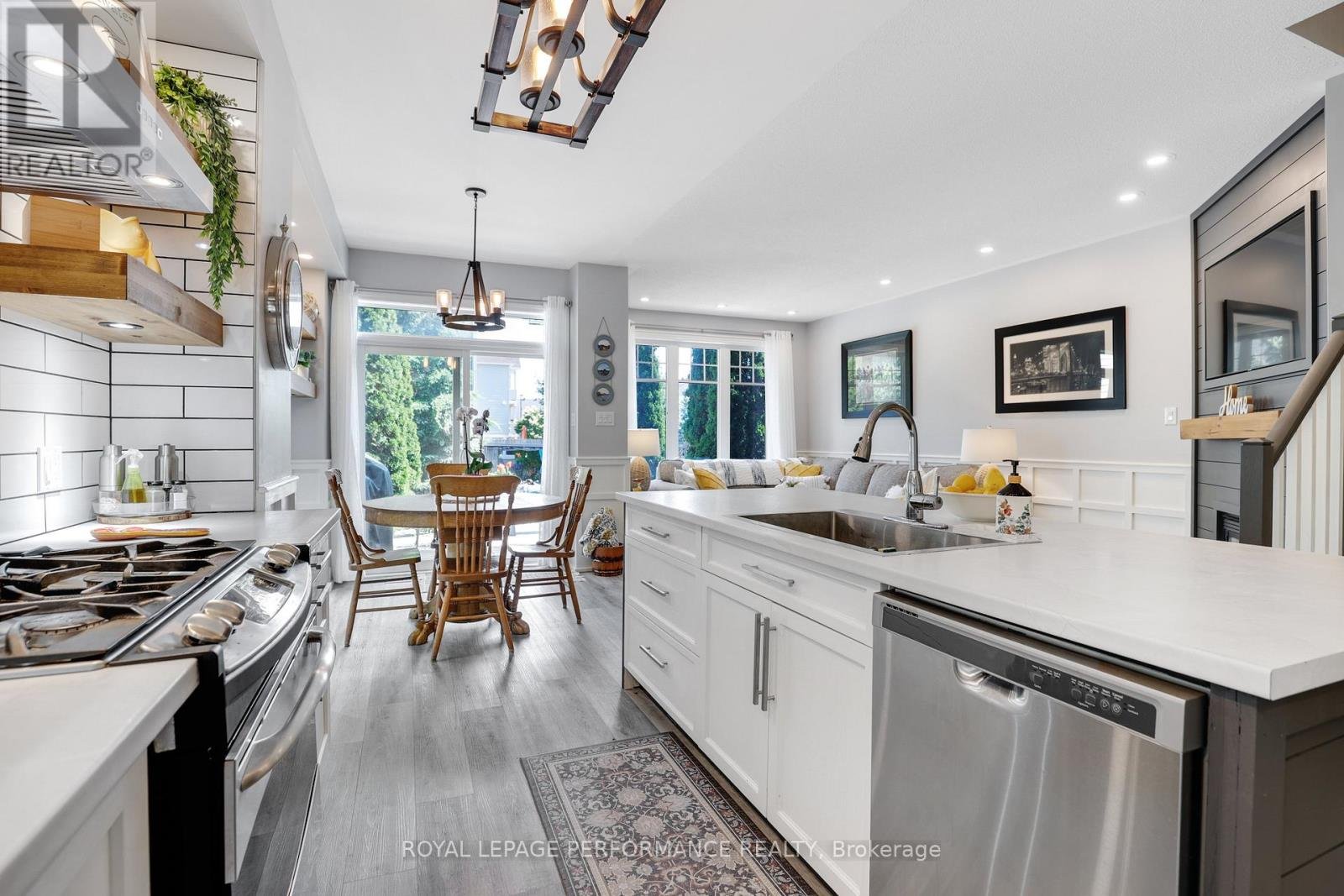Beautifully redesigned and styled Tamarack townhome (2118 finished sq ft). Right from the "get go" this place is impressive with the landscaped front yard, extra long new driveway, interlock and a view of the park at your front door. The front entrance features a wood slat accent wall and beautiful chandelier style lighting which adds a warm modern touch instantly. The sellers have excellent taste and have skillfully upgraded this home. Lighting and flooring has been improved and upgraded through out the home. The kitchen was redesigned to add additional counter space and open shelving, and undermount lighting. Beautiful wainscoting adds a richness and classic style to the home. Gas stove with a convenient pot filler tap. Stainless quality appliances, fridge with ice and water dispenser. Convenient breakfast bar at large island. Spacious eating area. Living room with lots of light, gas fireplace and a view to the spectacular backyard with perennials, stamped concrete and extra deep and private fenced yard. Natural gas BBQ hookup. Second floor features a luxurious primary bedroom with customized walk in closet, renovated ensuite bath. Main bath beautifully updated. Convenient second floor laundry area with storage. Finished basement with updated flooring, lighting and accent wall. Plenty of built in storage in the basement utility room. Best location in the area across from quiet Tiger Lily park and just a block away from all the convenient shops and restaurants in the neighborhood. AC replaced 7-8 yrs ago. Hot water on demand.