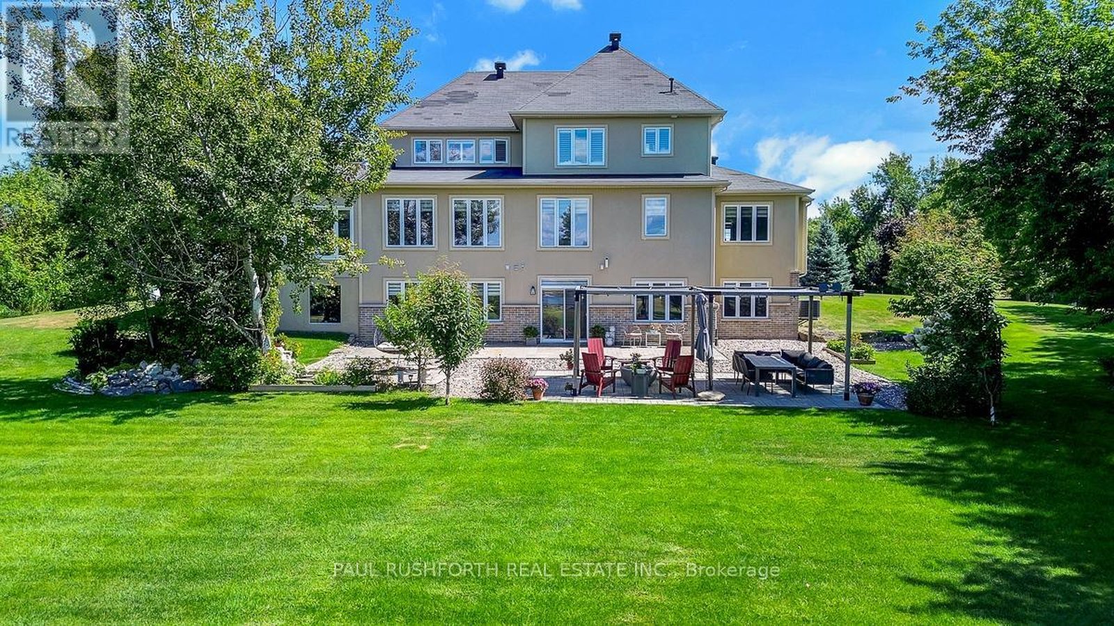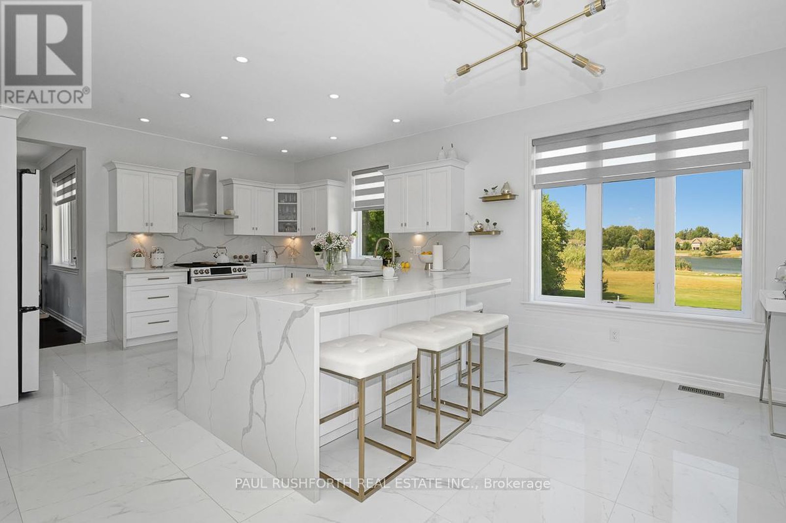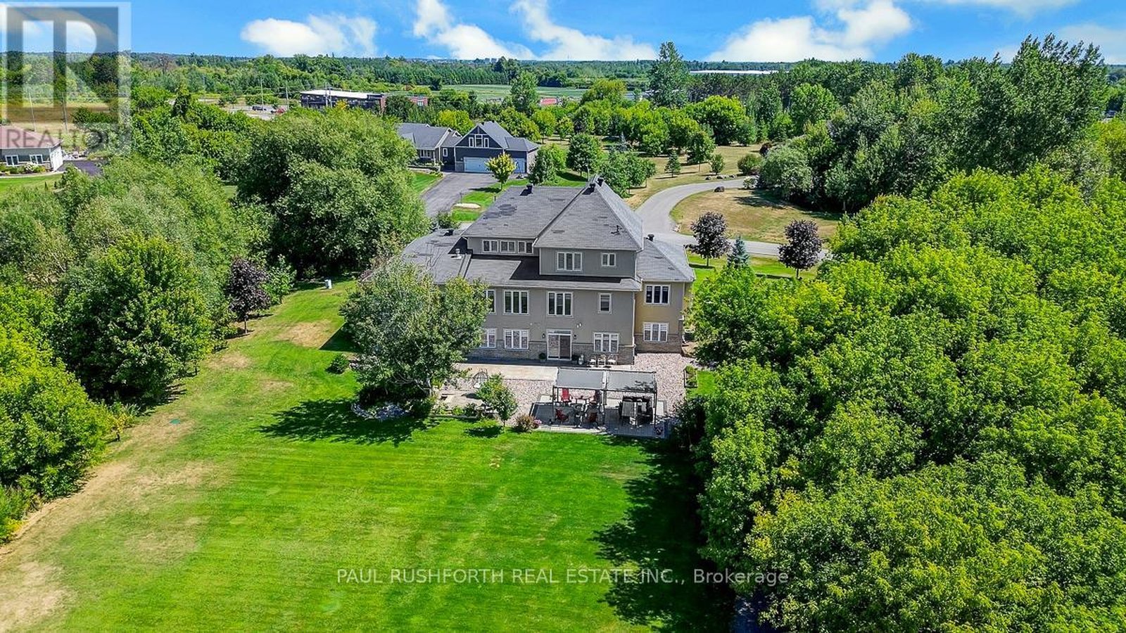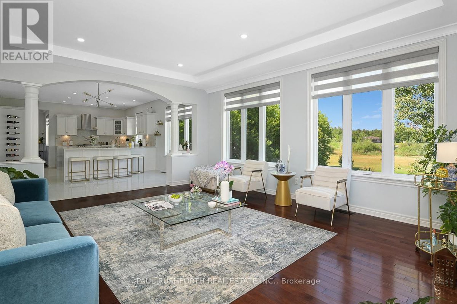 Experience the ultimate in waterfront living with this exceptional 5 bedroom, 5 bath residence set on a private 2.3 acre lot with over 120 feet of direct lake frontage in sought after West Lake Estates. Offering rare year round access to the water, this property delivers a lifestyle that is peaceful, private, and just minutes from the city. Perfectly located only 10 minutes from Kanata's tech hub, shopping, and dining, and just 5 minutes to Highway 417 for an easy downtown commute. Custom built in 2010 and offering approximately 5,000 sq ft of finished living space, this residence has been extensively upgraded with over $500,000 in renovations, blending timeless craftsman design with refined modern finishes. The main level showcases its waterfront setting with expansive living and dining areas, oversized windows, and stunning lake views. The chef's kitchen features Calcutta quartz counters and backsplash, white shaker cabinetry, oversized peninsula, and high end appliances. A bright breakfast area and inviting family room with gas fireplace flow into a sun-filled three season room with panoramic lake views. A dedicated office, oversized mudroom, and convenient laundry with garage access complete this level. Upstairs, three suite style bedrooms offer comfort and privacy, including a primary retreat with tranquil views and a spa inspired ensuite with freestanding tub, dual vanities, and glass walk in shower. The fully finished walkout lower level adds two bedrooms, a full bathroom, recreation space, and ample storage. Outdoors, enjoy landscaped grounds with mature trees, stone patio, pergola, fruit-bearing orchard, and direct lake access perfect for relaxing or entertaining. Additional features include a three car garage, 10 zone sprinkler system, GenerLink wiring, 40amp EV receptacle, new furnace, A/C, owned water heater, and epoxy-coated porch. Annual co-tenancy fee of $100 covers lake maintenance.