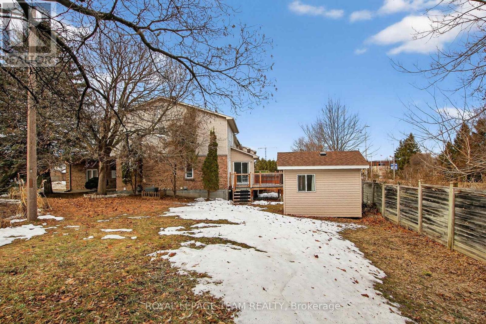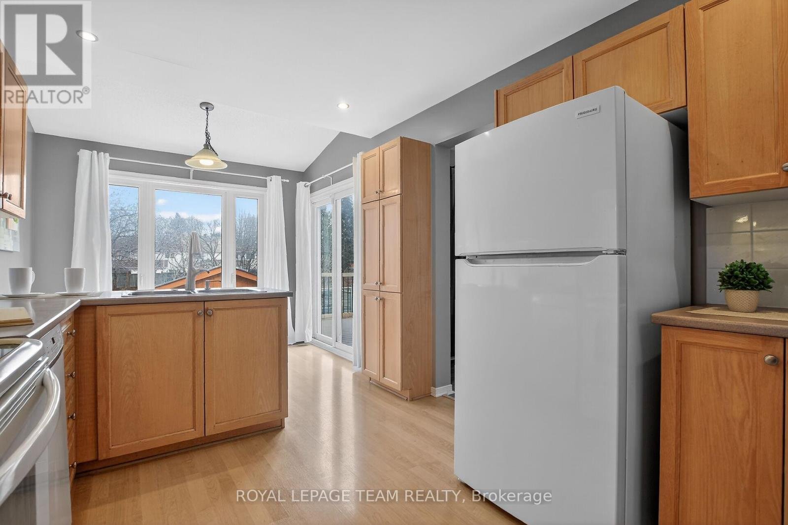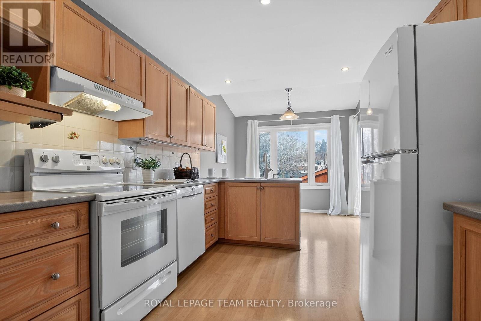 Lovely Holitzner built end unit townhome, located on a private court and on an amazing large lot with mature trees, in the central neighborhood of Katimavik. Three bedrooms, three baths, open plan living & dining room, eat-in kitchen with patio door to composite deck plus finished lower level with gas fireplace. Bonus free standing building/coach house (2022) used as an office, could also be a hobby room. Insulated, power, recessed lighting, engineered hardwood flooring (carpet tile on top).Private enlarged double driveway (4 car parking) with interlock near garage & interlock walkway to covered front porch. Tiled foyer and reception area, has a cut out with view of living room, double closet and entry to the garage is close by. Open living and dining room with updated laminate flooring and several updated windows, fantastic space for entertaining. Kitchen has many tall cabinets, tile backsplash, double stainless steel sink, updated faucet & appliances are included. Eating area in kitchen has vaulted ceiling and recessed lighting and beautiful views of yard. Patio door opens onto the composite deck, great for barbecues and relaxing. Powder room has newer vanity, sink and mirror. Second level with three good-sized bedrooms and two full baths. The primary bedroom has a big window with views of the court and a spacious walk-in closet. The ensuite bath has a vanity with sink, medicine cabinet, glass shelf and double shower with seat. Two more bedrooms with neutral decor, double closets, big windows and overhead lights. The linen closet and full bath is conveniently close by. The main bath has a combined tub and shower with tile surround and vanity with sink and medicine cabinet. Lower level with spacious family room, office area, plus a library area, laundry & utility room. Walk to many parks, schools, shops and Leisure Center. Minutes to bus on Castlefrank & convenient access to 417. Updated windows (2018), garage door & more. 24 hours irrevocable on all offers.