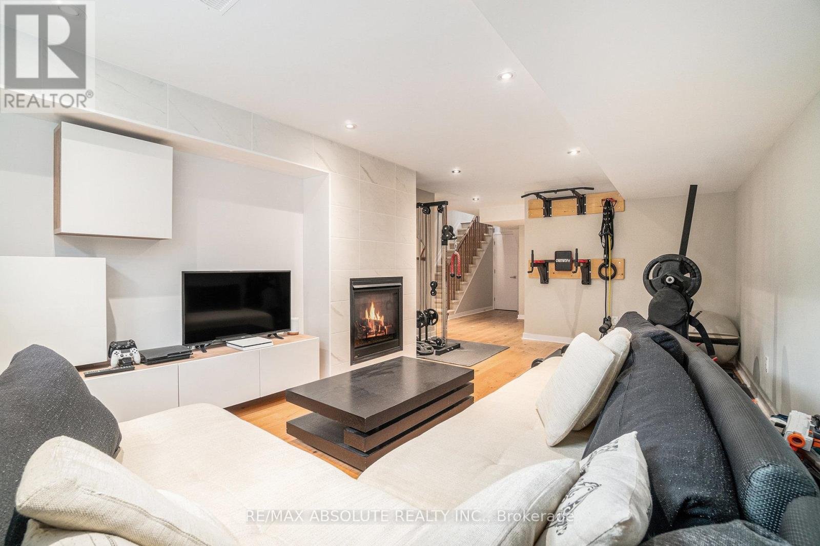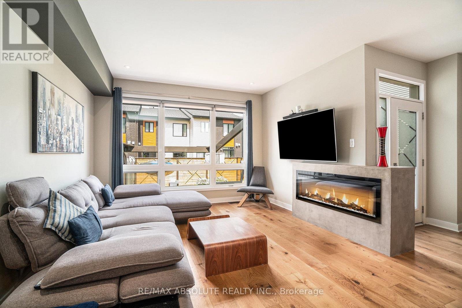 Welcome to this stunning corner-unit townhome in the heart of Stittsville. From the moment you enter this bright, sun-filled home, you'll notice the upscale finishes, soaring ceilings, and thoughtfully designed layout that blends style with everyday comfort.The main level features a tiled foyer and convenient powder room, leading into an open-concept living space highlighted by rich hardwood flooring throughout two levels. The dramatic living room boasts floor-to-ceiling windows and an impressive open-to-above design that fills the home with natural light, while a cozy electric fireplace creates a warm and inviting atmosphere.The chef-inspired kitchen is perfect for entertaining, offering quartz countertops, stainless steel appliances, a gas stove, pot lighting, a spacious island with breakfast bar seating, and generous pantry cabinetry. The adjacent dining area opens through sliding doors to a fully fenced private backyard with a gas BBQ hookup-ideal for outdoor dining and relaxing.Upstairs, the spacious primary suite features a large walk-in closet and a spa-like ensuite complete with an oversized glass and tile shower. Two additional bedrooms, a modern 4-piece bathroom, and convenient second-floor laundry provide both functionality and comfort for family living.The finished basement adds valuable living space with a versatile recreation room perfect for a home gym, media room, or play area, along with ample storage.Additional highlights include Smart Home features such as a Nest thermostat. As a corner unit, the property offers extra windows for abundant natural light, a private driveway, enhanced privacy, and a larger outdoor area.Ideally located just steps from trails, parks, schools, shopping, and dining, this home offers the perfect balance of tranquility and convenience in one of Stittsville's most desirable communities.
