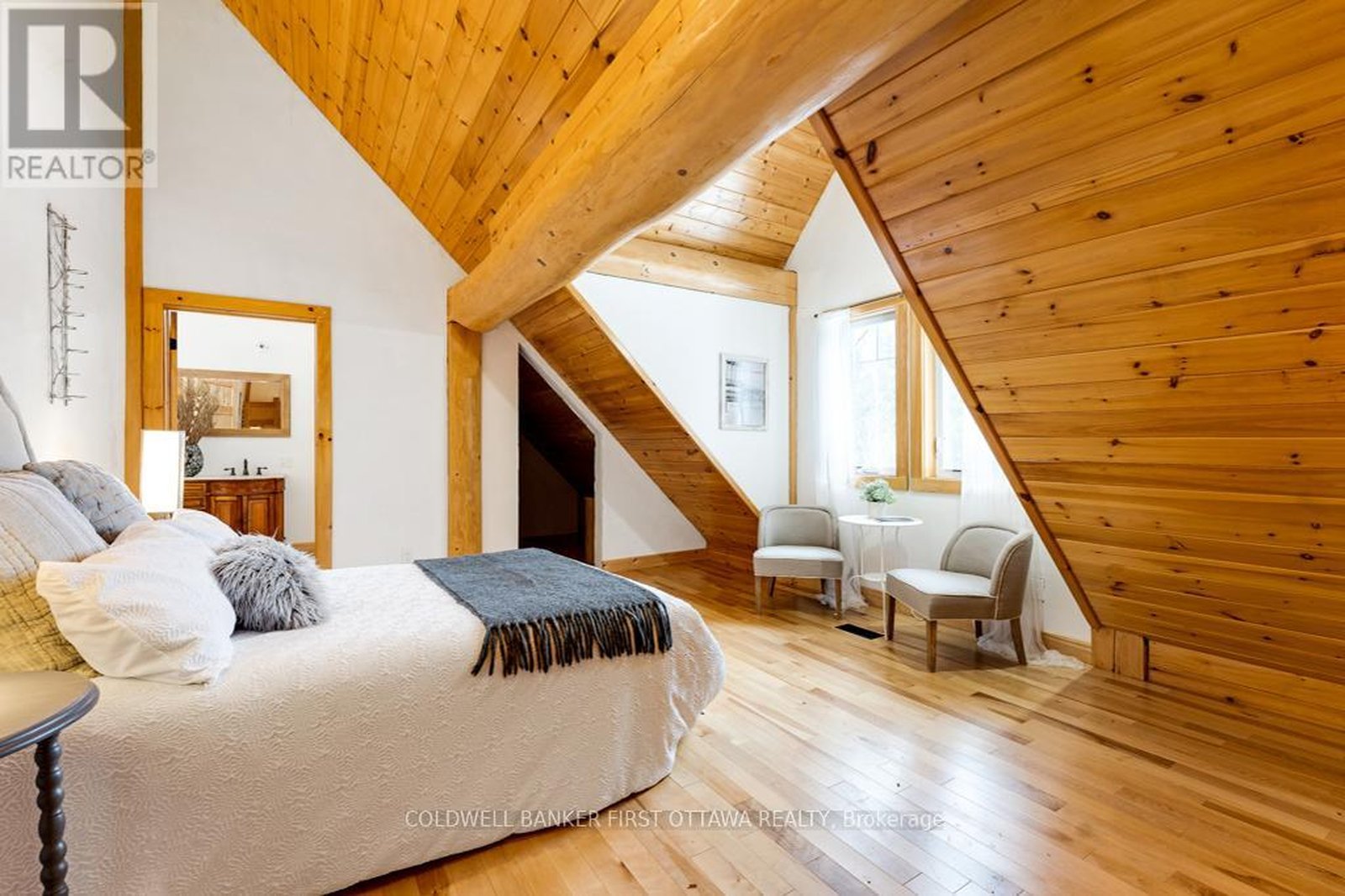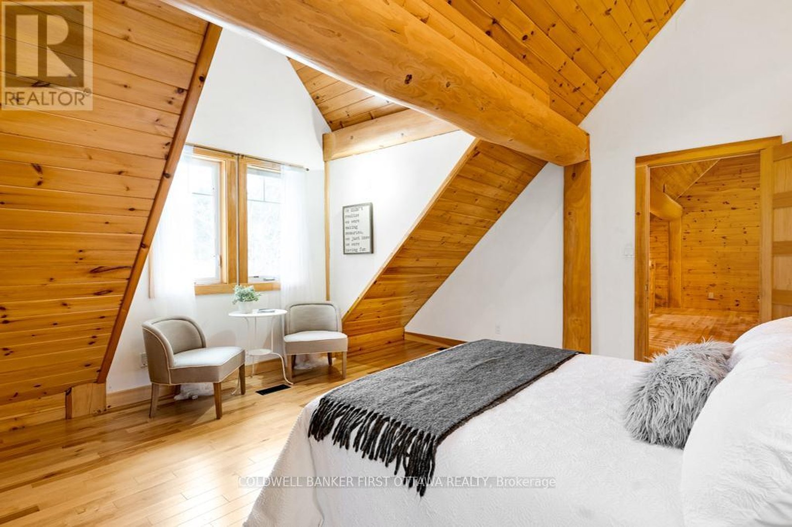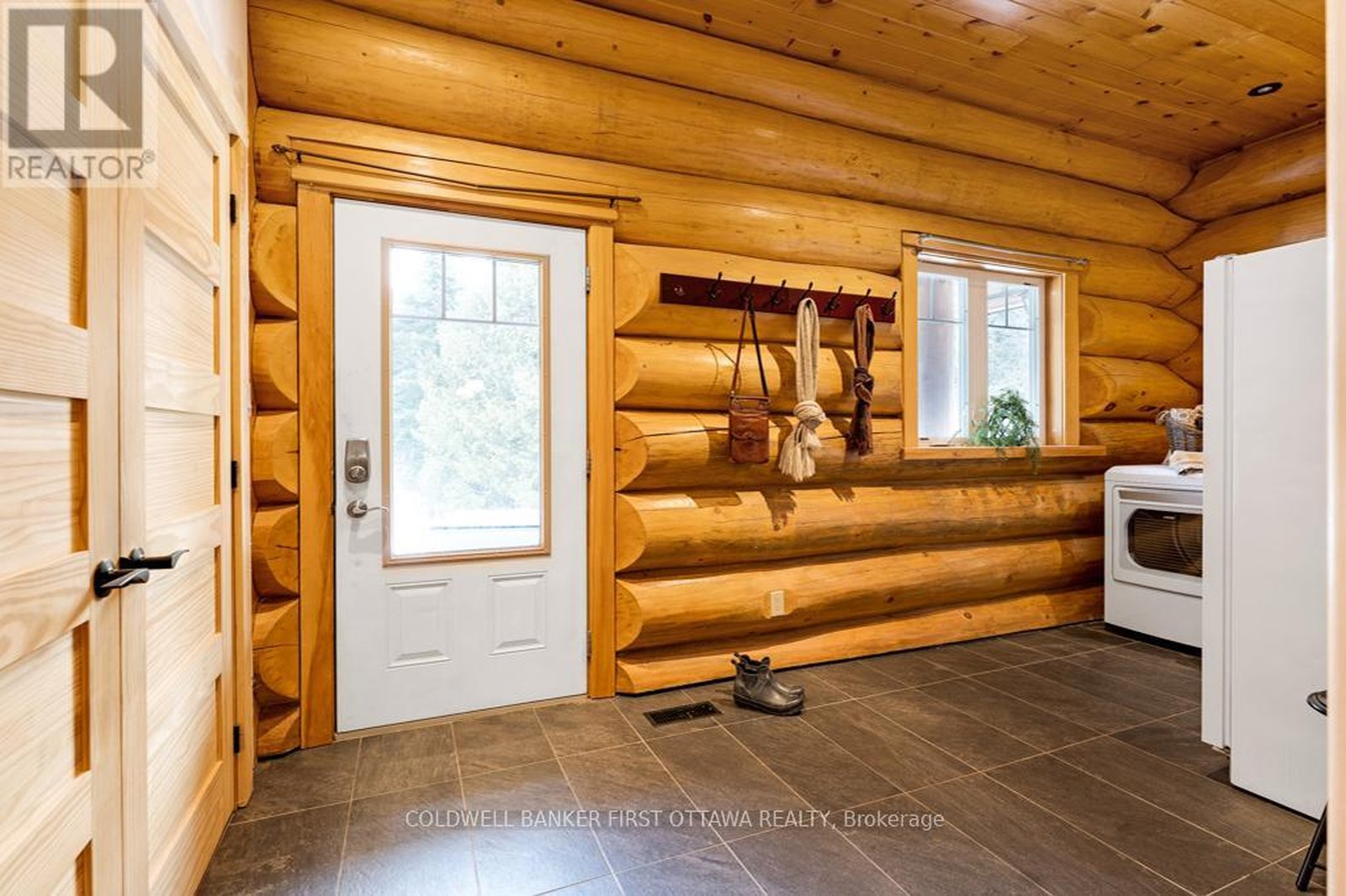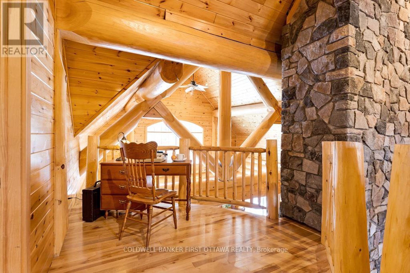It is so quiet on this 60 acres, you can hear the sound of crickets and songs of birds. The big beautiful sky has Canada geese flying back home and in the evening, starry galaxy. Tucked into all this beauty, quality built log home with amazing spaces. The huge 1ft diameter logs are an architectural marvel, adding solid character. The 4 bedroom, 4 bathroom home has easy flow layout, soaring ceilings, walls of windows with deep sills and floors of select-ash hardwood plus ceramic tile. Front foyer welcomes you with dramatic 22' high ceiling and dream walk-in closet. Great Room showcases majestic two-storey cultured stone fireplace and impressive cathedral ceiling with honey-hued, light-reflecting, beams. Expansive dining room connects Great Room to kitchen and has door to covered verandah. Exquisite kitchen a culinary delight with phenomenal select-cherry cabinetry, Cambria quartz counters, breakfast bar and deep window sills. Added design feature is refrigerator being integrated into the cabinetry. Modern Elmira cookstove makes food prep easier with its four propane burners, three electric burners and electric oven. Main floor generous primary suite offers two walk-in closets and patio doors to the great outdoors; spa 5-piece ensuite has marble floor, marble counters on the two teak vanities, large deep soaker tub and glass shower. On other side of the home is the family-sized mudroom with easy-clean ceramic tile floor, oversized closet and laundry station. Main floor also has powder room. Log staircase leads to second floor landing with flex space. Two extra-large bedrooms share 5-piece Jack & Jill bathroom. Fourth bedroom includes luxury 5-piece ensuite. Outside, the yard provides lots of space for gardening & play. The bunkie need some finishing for guests or, possible studio. The forest backs onto Indian River where, depending on the season, you can canoe to Robbs Lake. Hi-speed & cell service. On township maintained road, 25 mins to Almonte. 45 mins Kanata.