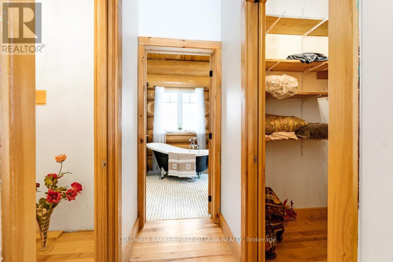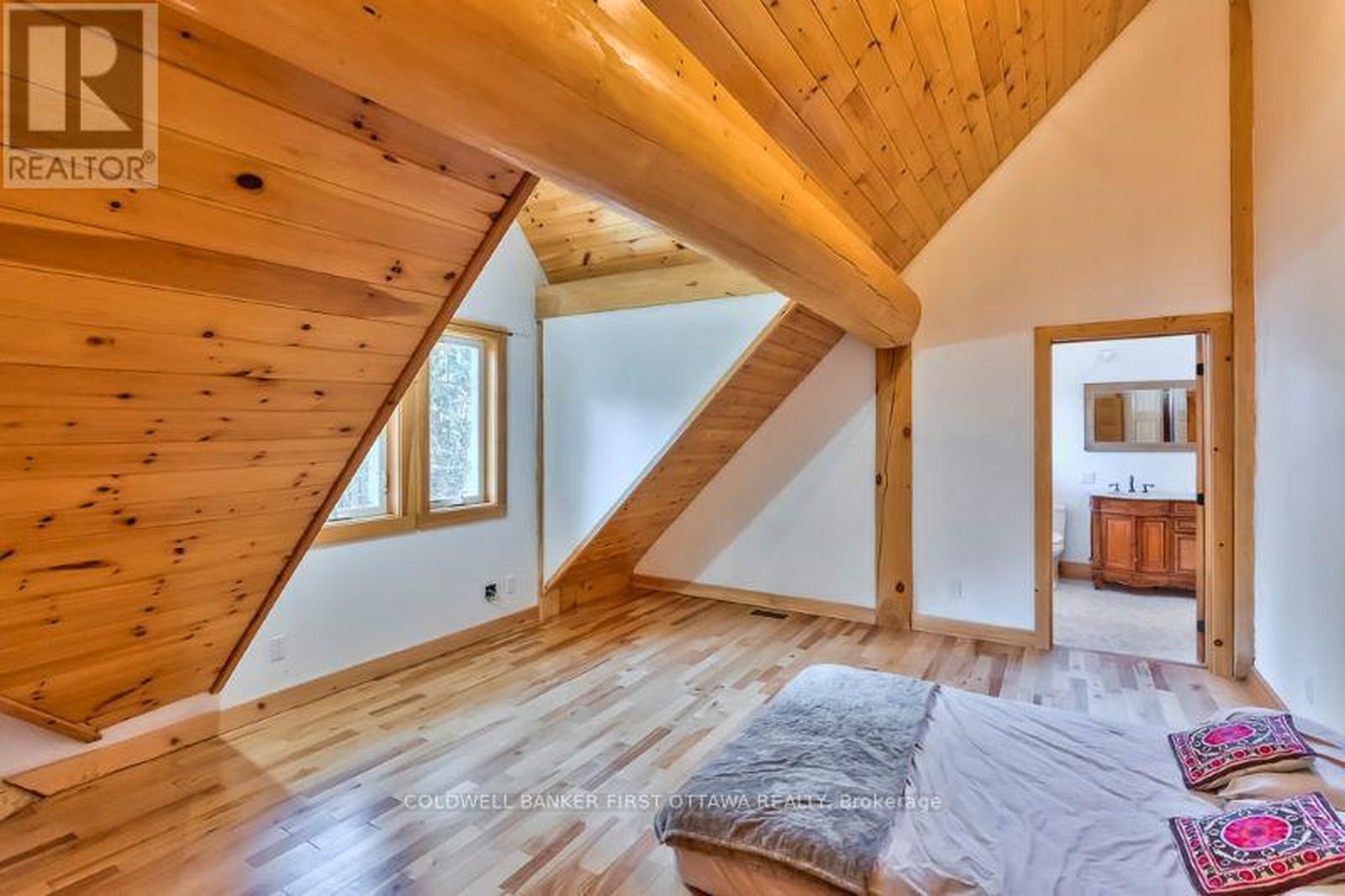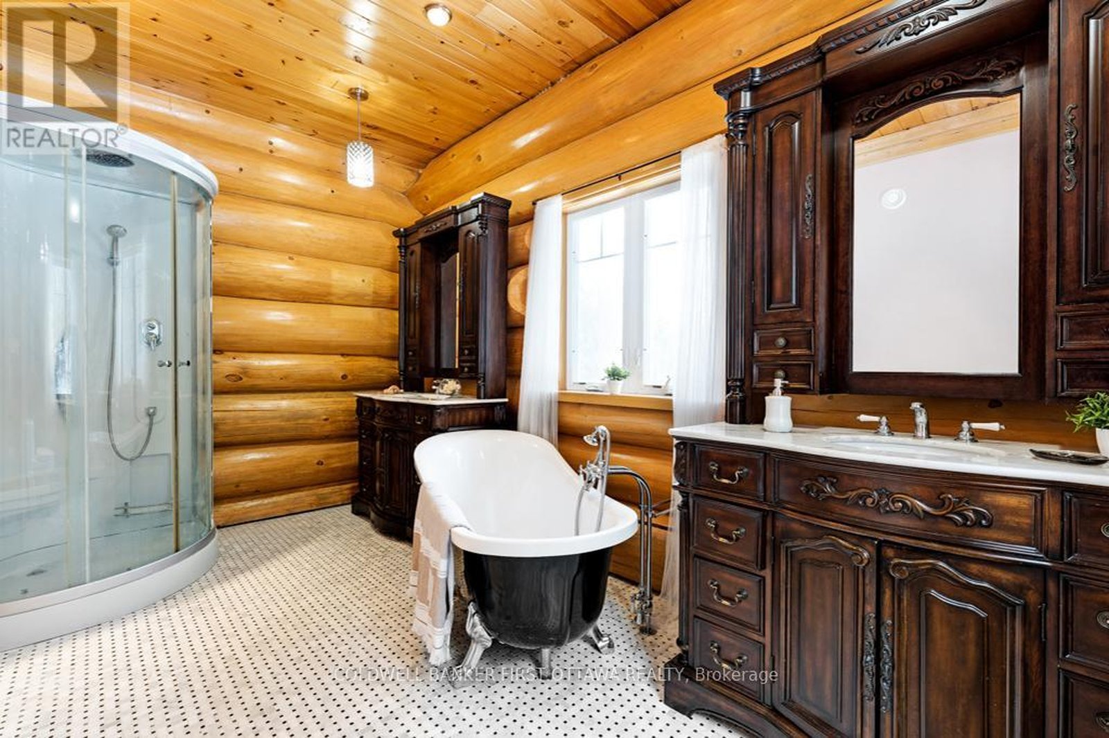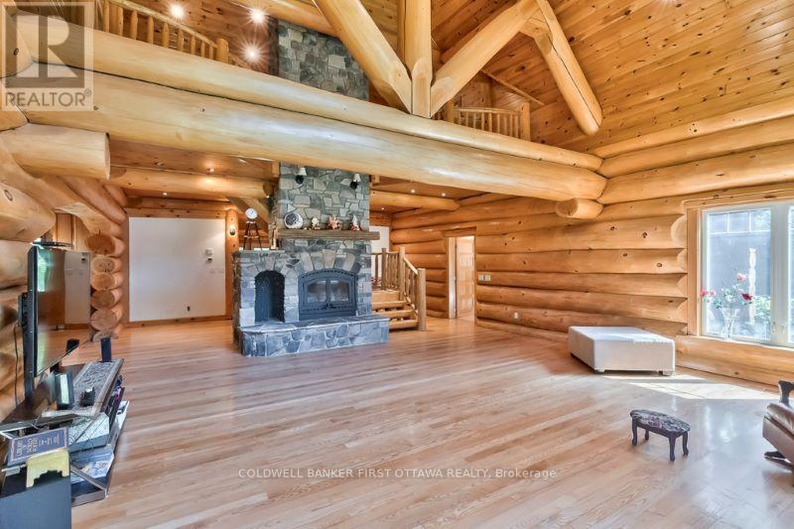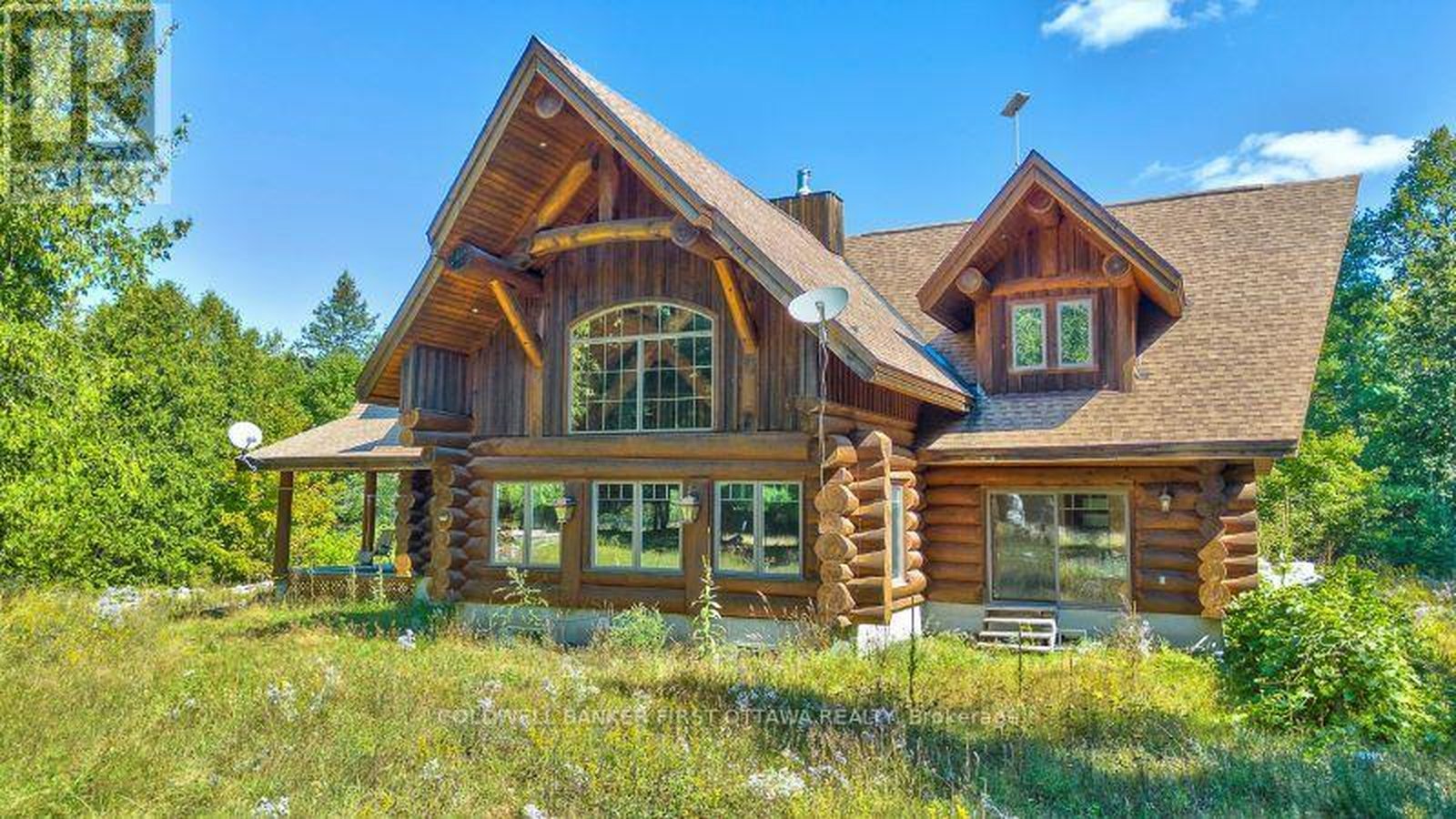 It is so quiet on this 60 acres, you can hear the sound of crickets and songs of birds. The big beautiful sky has Canada geese flying back home and in the evening, starry galaxy. Tucked into all this beauty, quality built log home with amazing spaces. The huge 1ft diameter logs are architectural marvel, adding solid character. The 4 bedroom, 4 bathroom home has easy flow layout, soaring ceilings, walls of windows with deep sills and floors of select-ash hardwood plus ceramic tile. Front foyer welcomes you with dramatic 22' high ceiling and dream walk-in closet. Great Room showcases majestic two-storey cultured stone fireplace and impressive cathedral ceiling with honey-hued, light-reflecting, beams. Expansive dining room connects Great Room to kitchen and has door to covered verandah. Exquisite kitchen a culinary delight with phenomenal select-cherry cabinetry, Cambria quartz counters, breakfast bar and deep window sills. Added design feature is refrigerator being integrated into the cabinetry. Modern Elmira cookstove makes food prep easier with its four propane burners, three electric burners and electric oven. Main floor generous primary suite offers two walk-in closets and patio doors to the great outdoors; spa 5-piece ensuite has marble floor, marble counters on the two teak vanities, large deep soaker tub and glass shower. On other side of the home is the family-sized mudroom with easy-clean ceramic tile floor, oversized closet and laundry station. Main floor also has powder room. Log staircase leads up to second floor landing with flex space. Two extra-large bedrooms share 5-piece Jack & Jill bathroom. Fourth bedroom includes luxury 5-piece ensuite. Outside, the yard provides lots of space for gardening & play. The bunkie need some finishing for guests or, possible studio. The forest backs onto Indian River where, depending on the season, you can canoe to Robbs Lake. Hi-speed & cell service. On township maintained road, 25 mins to Almonte. 45 mins Kanata.
