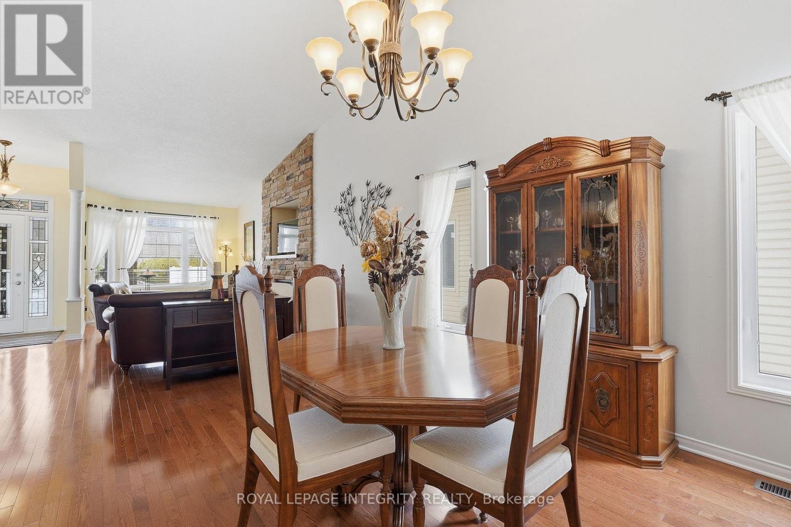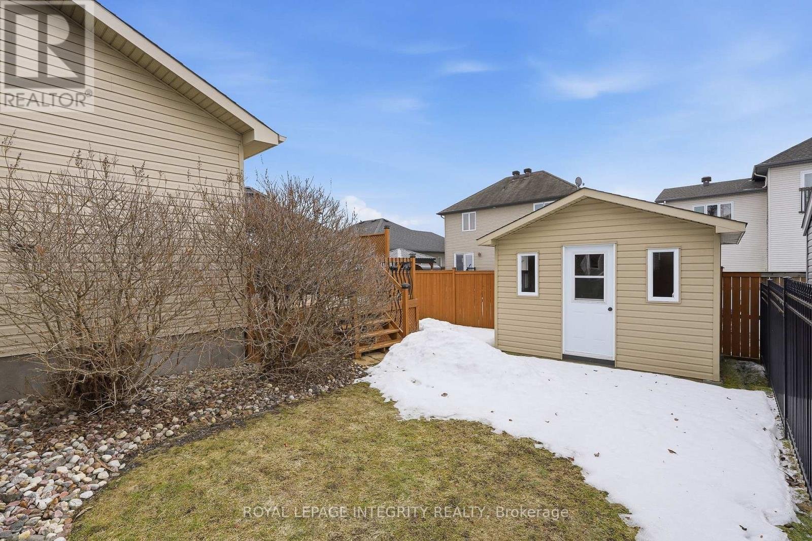Welcome to this charming bungalow in Clarence-Rockland, featuring a beautiful stone façade and a bright, open-concept layout. The main floor offers soaring cathedral ceilings and a spacious living and dining area highlighted by a stunning gas stone fireplace that creates a warm and inviting focal point as you enter the home. The kitchen features birch cabinetry with decorative moldings and valance lighting, providing both style and functionality, with a cozy eating area and access to the backyard. The primary bedroom includes a walk-in closet and a private 3-piece ensuite, while the second bedroom is perfect for guests or a home office and is conveniently located near the main 4-piece bathroom. An elegant oak staircase leads to the unfinished basement with a rough-in for a third bathroom, offering excellent potential for future living space. The double gas-heated garage is equipped with insulated garage doors, hot and cold water access, and a floor drain. Outside, enjoy the fully fenced yard with a deck, gazebo, and storage shed, perfect for relaxing or entertaining.