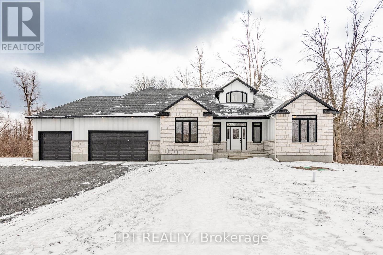 A statement of modern luxury set on over 2 acres. This custom-built bungalow offers exceptional design, soaring spaces, and endless potential with an unfinished walkout basement ready for your vision. The thoughtfully designed layout features 3 generous bedrooms, including a private primary retreat set on its own wing with a spa-like ensuite and expansive walk-in closet. The main living area impresses with 9' ceilings and a stunning family room highlighted by a 12' vaulted ceiling. A dramatic front foyer welcomes you with an impressive 19' ceiling height, setting the tone for the home's grand scale. The chef-inspired kitchen is built for entertaining, anchored by a striking quartz waterfall island and walk-in pantry. Complete with an oversized 3-car garage, this property offers the perfect balance of luxury, privacy, and space just minutes from Ottawa.